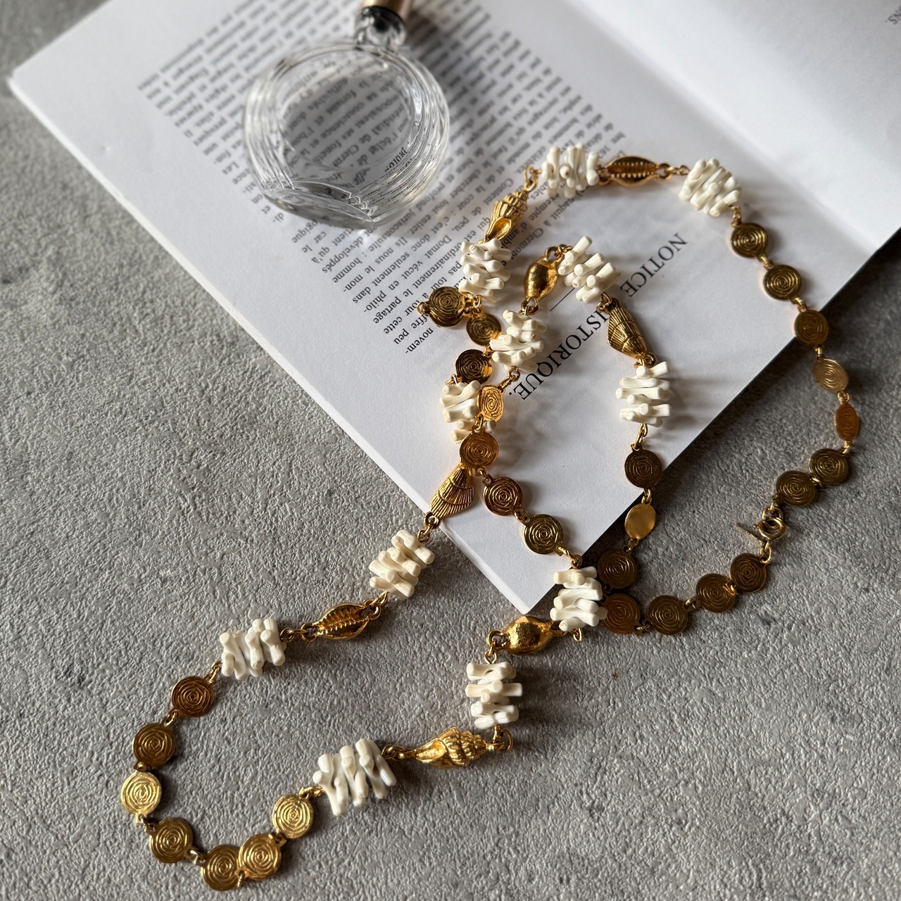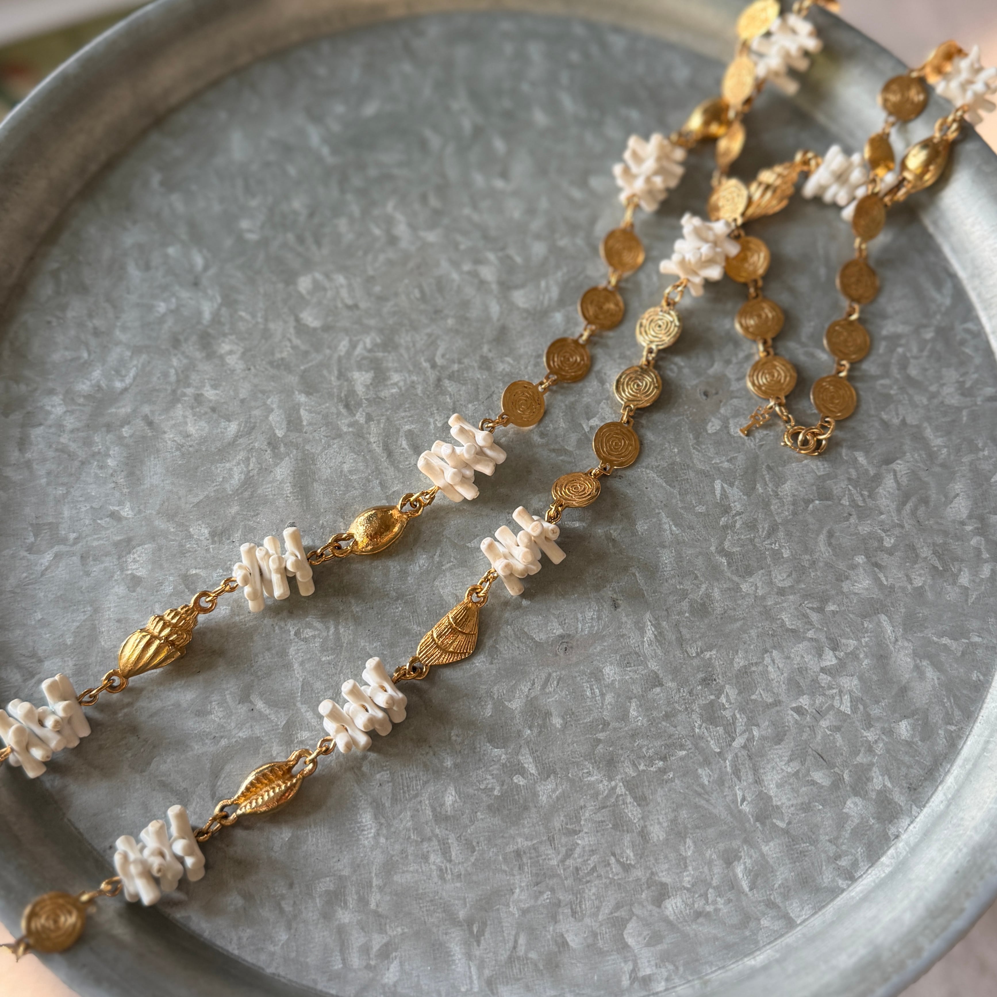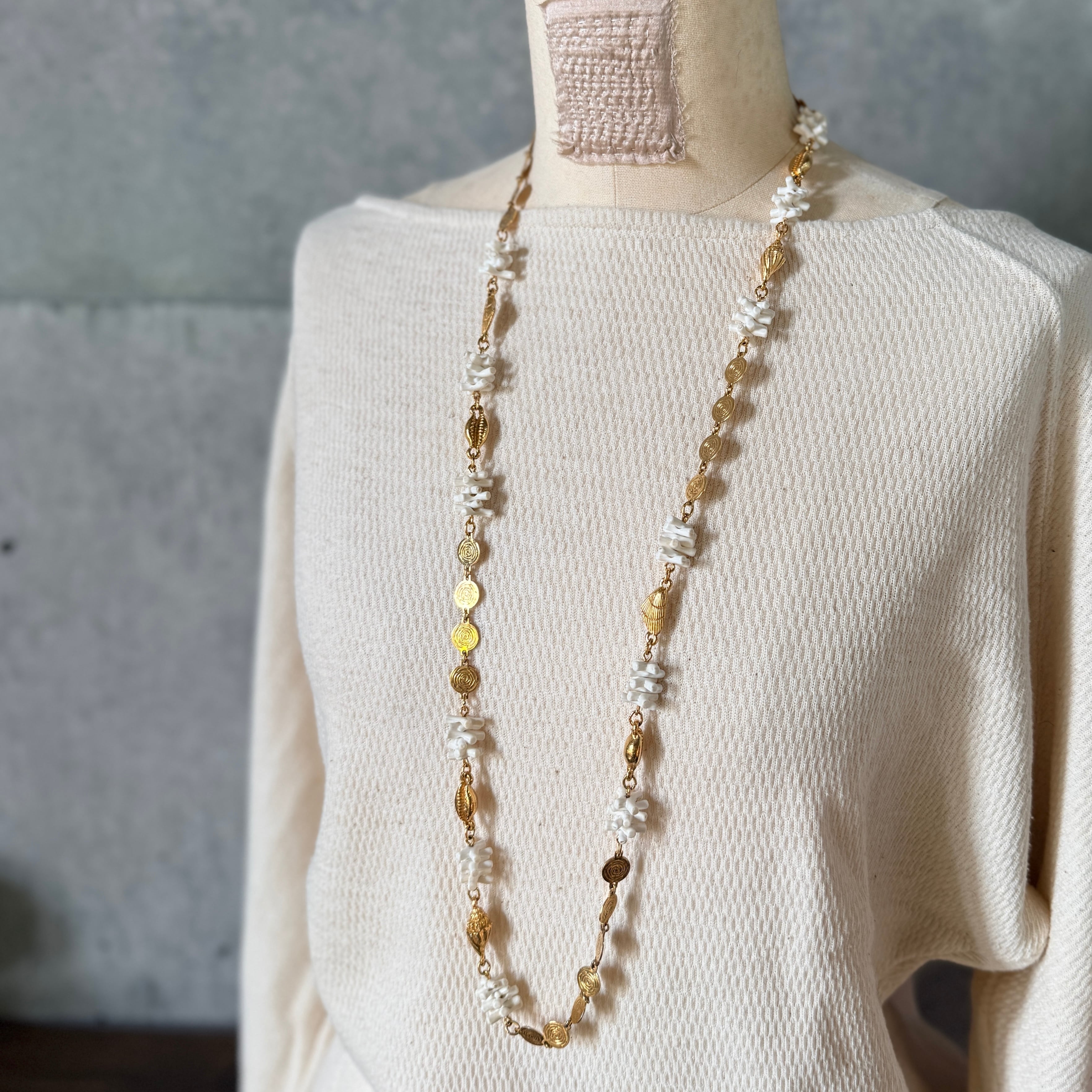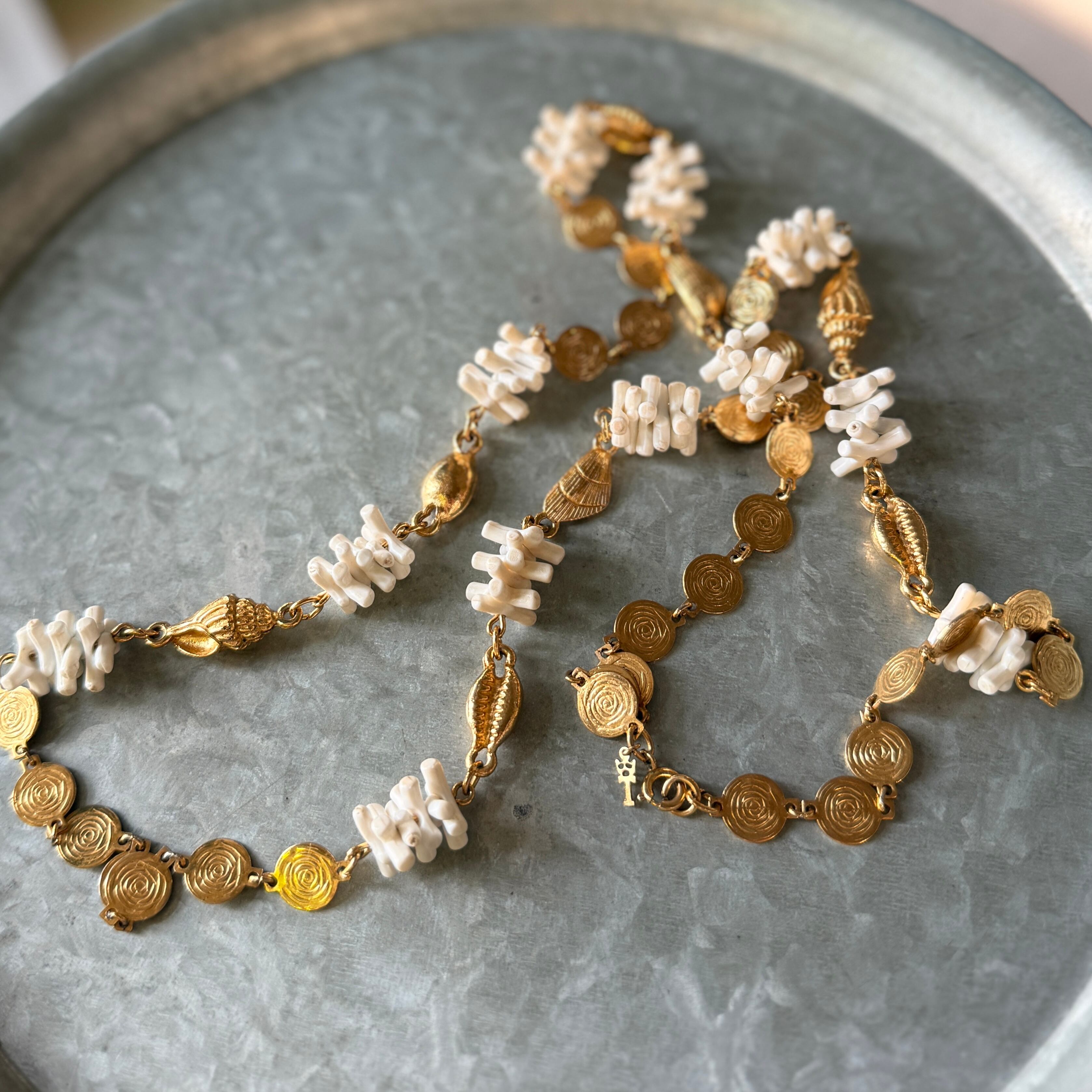 ゴールドトーンの法螺貝、貝殻、螺旋を描くディスク、フェイクホワイトコーラルを組み合わせた、海をテーマにしたネックレス。