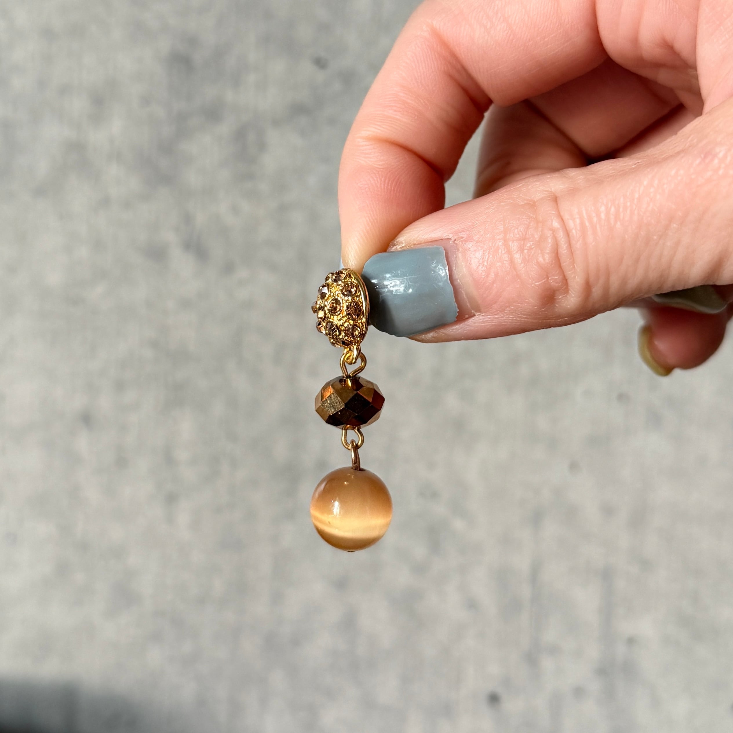 アンバーカラーラインストーンが散りばめられたゴールドトーンドームに、角度による光反射で魅せるカラーを変えるイエロージェイドのようなグラスビーズ、ファセットカットされたゴールドカラービーズがぶら下がるピアス。