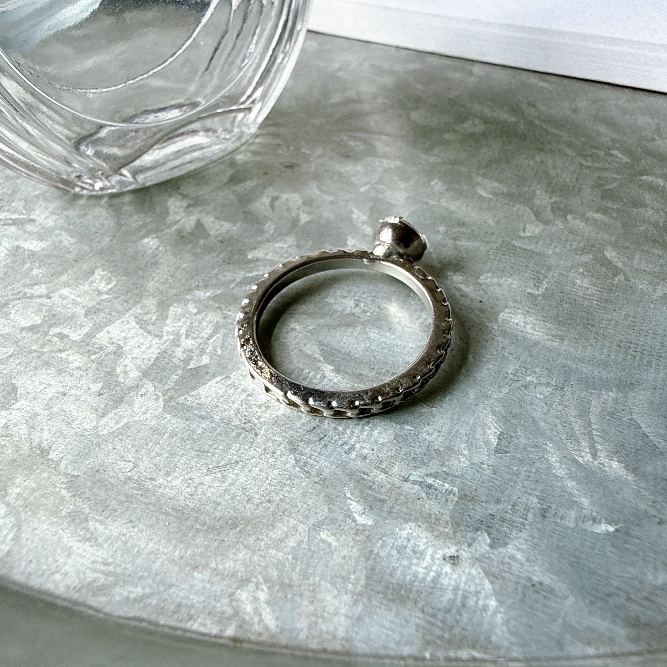現代のさまざまなシーンの着こなしに映え、シンプル、カジュアル、エレガントや、モードなスタイルなどに一点投入することで、品よくレトロなアクセントが映える素敵なヴィンテージリングです。