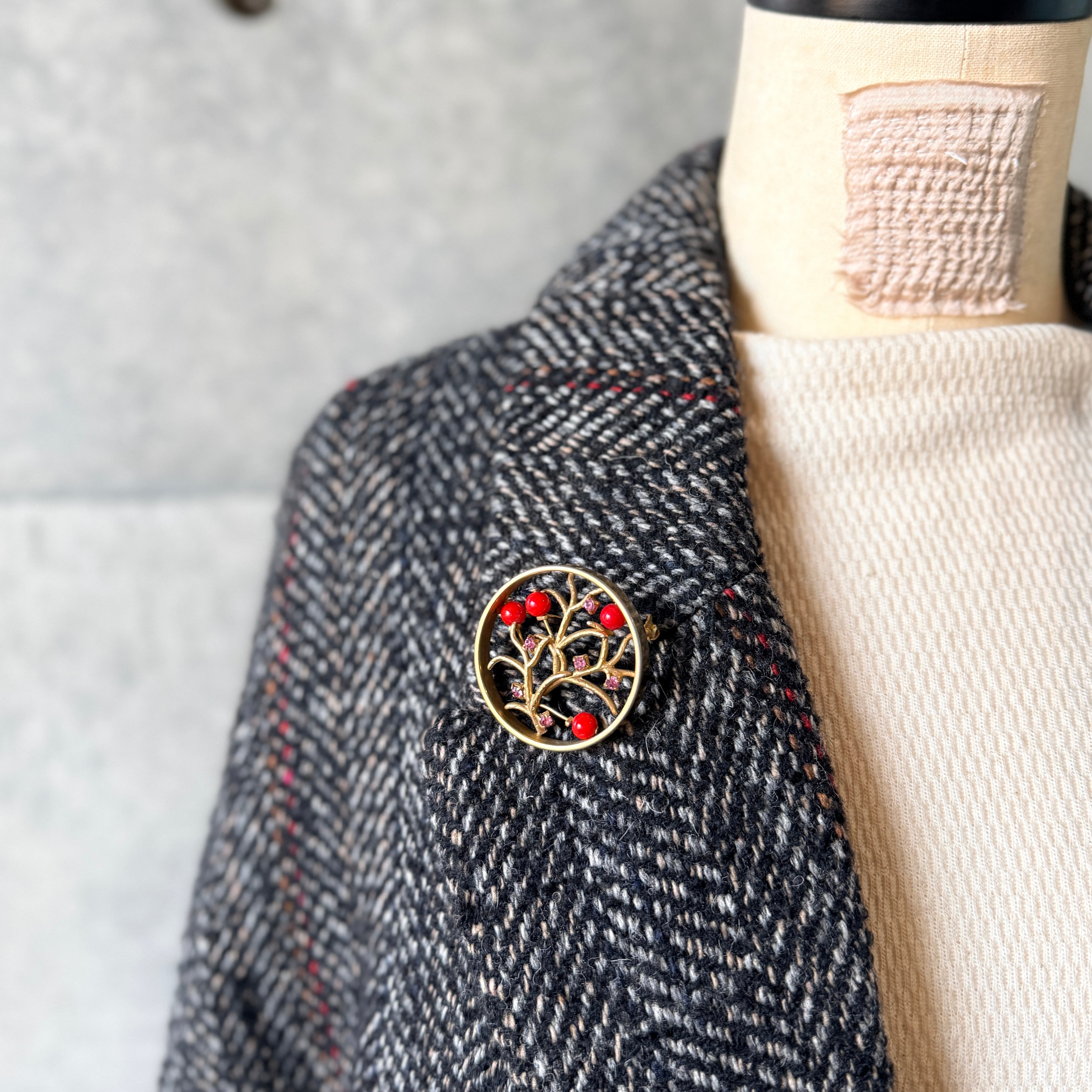 赤い果実の成る木をイメージしたゴールドトーンサークルピンブローチ。