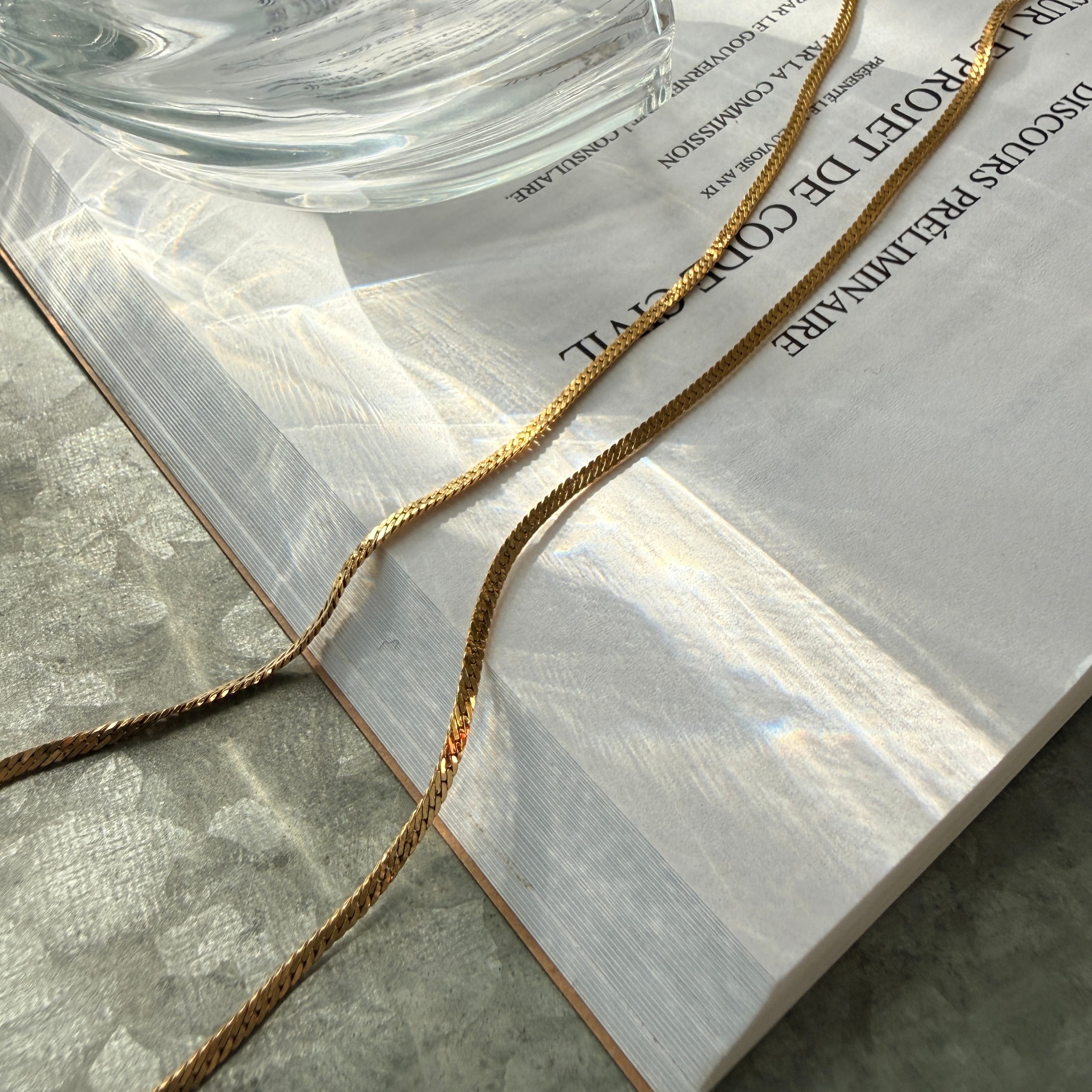 シンプルなデザインと程よく艶のあるテクスチャー。細身のチェーンでモダンでエレガントな雰囲気を纏わせます。