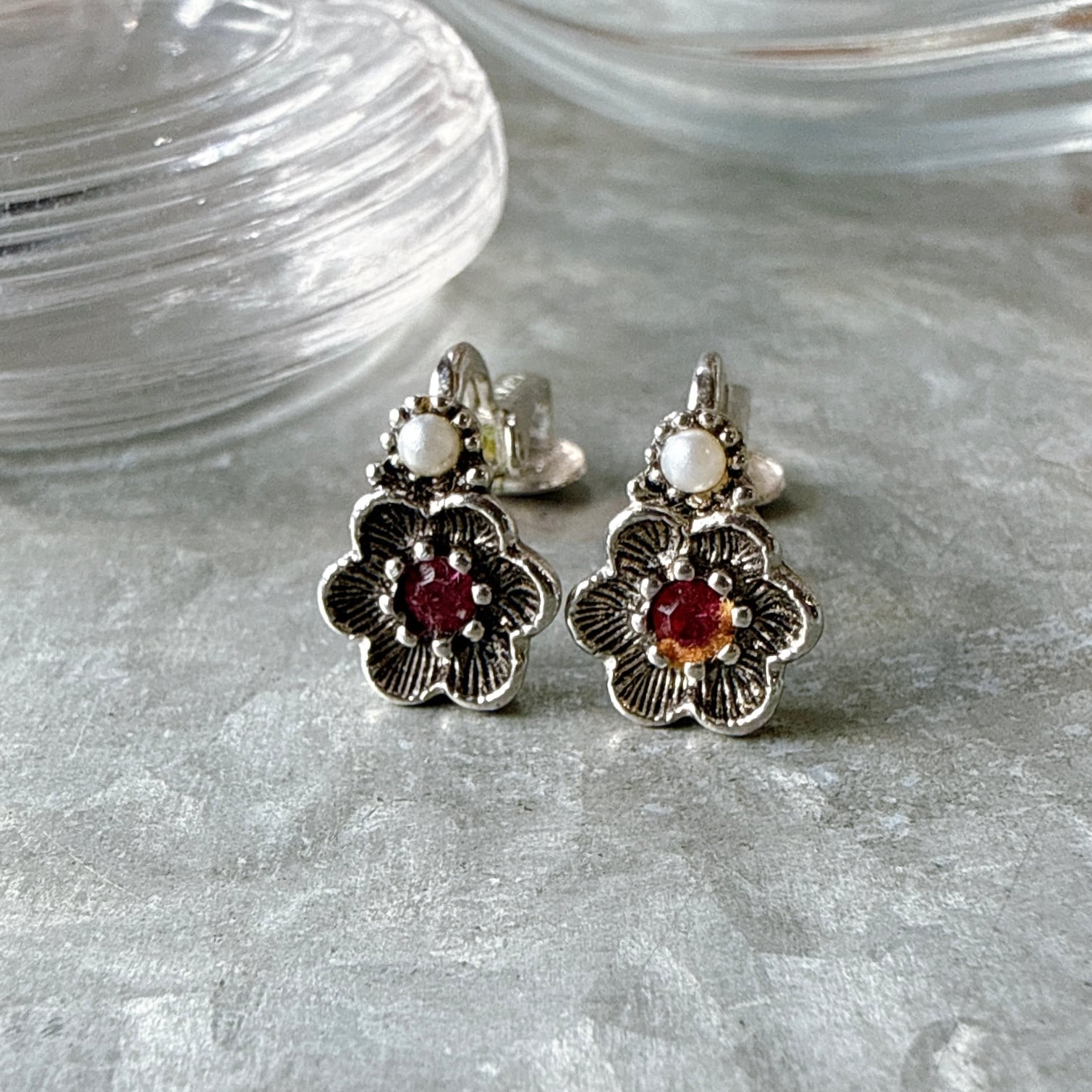 "Rose Gay"とタイトルのついた、シルバートーンフラワーイヤリング。