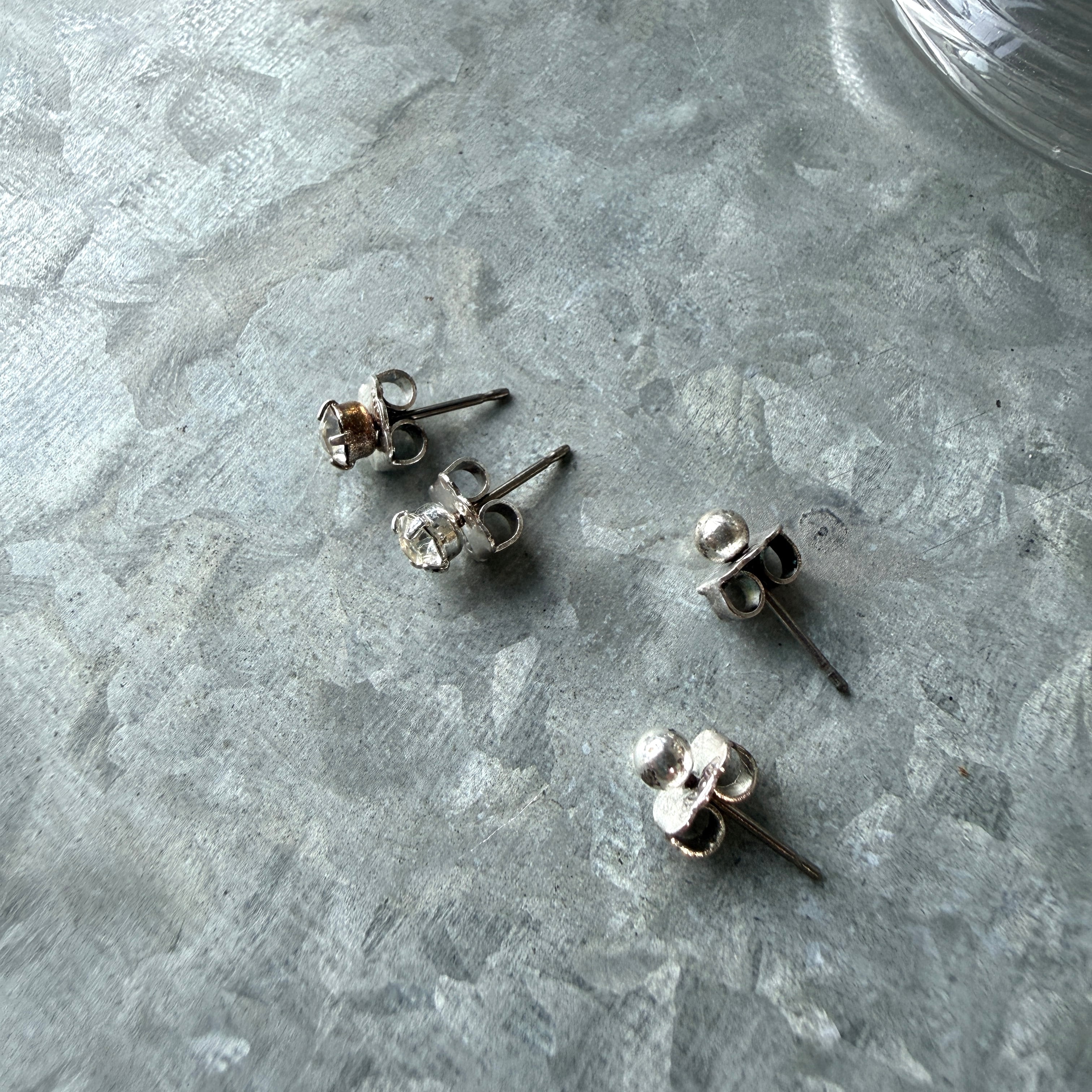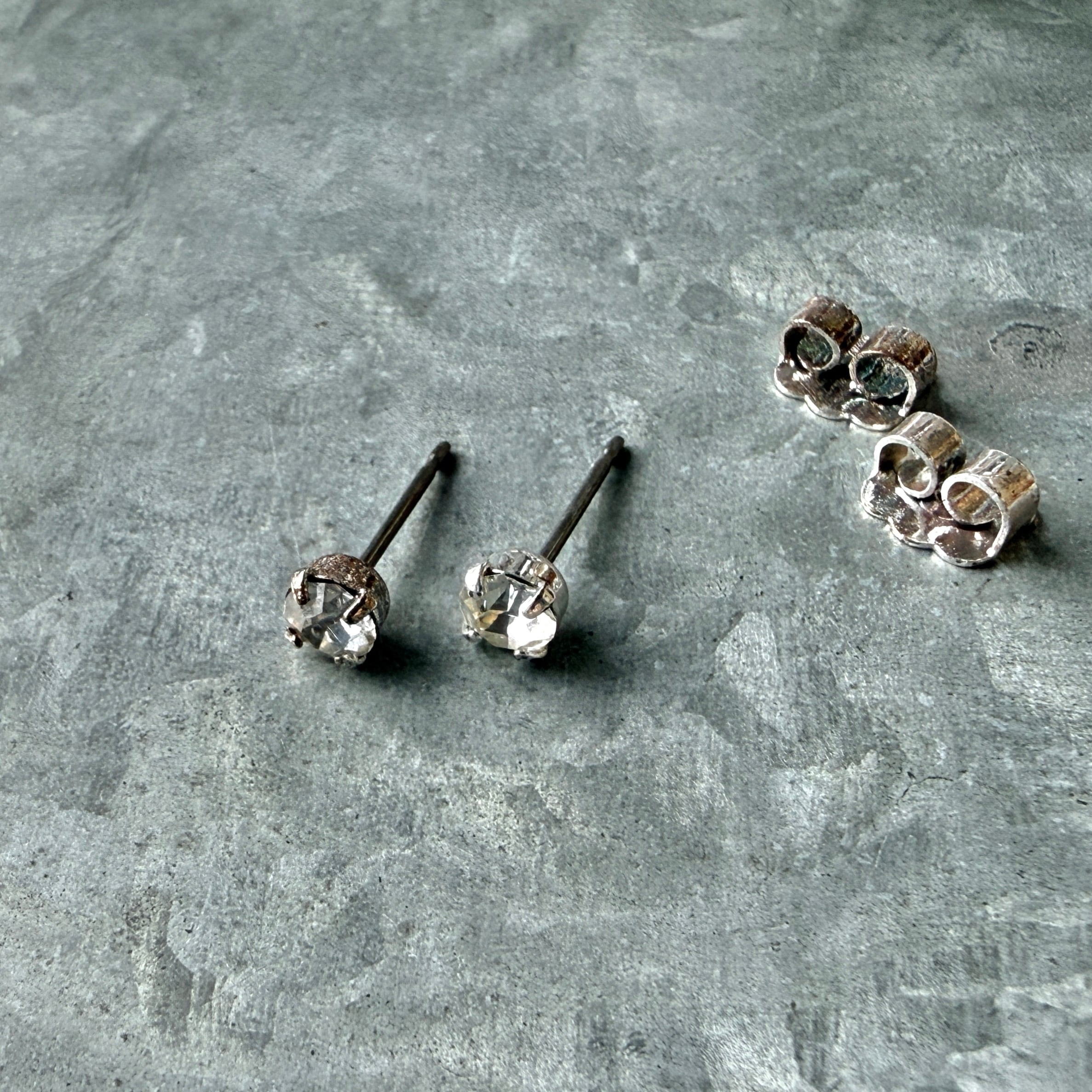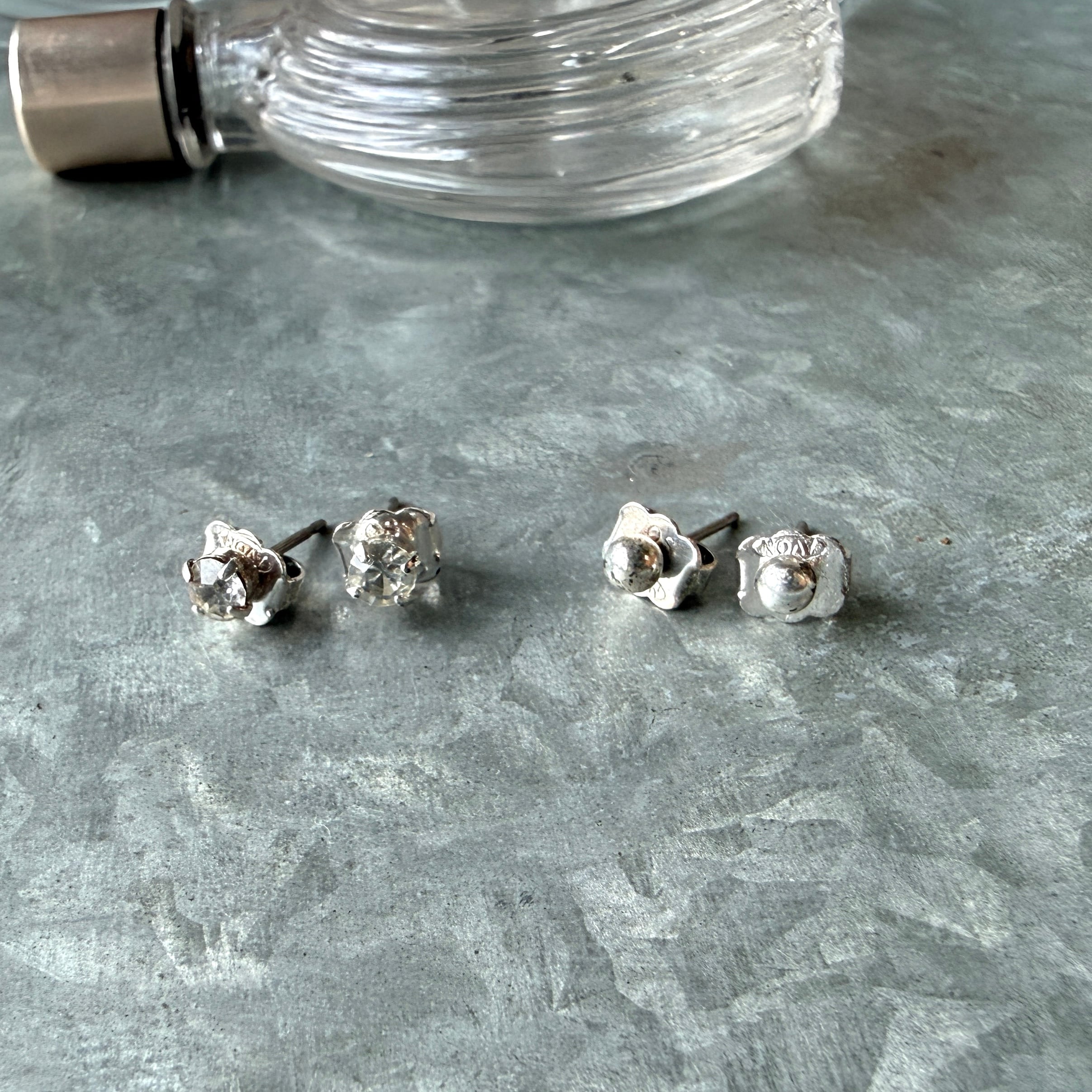 クリアなラインストーンが煌めくピアスと、シルバーメタルの小さなボールピアス。