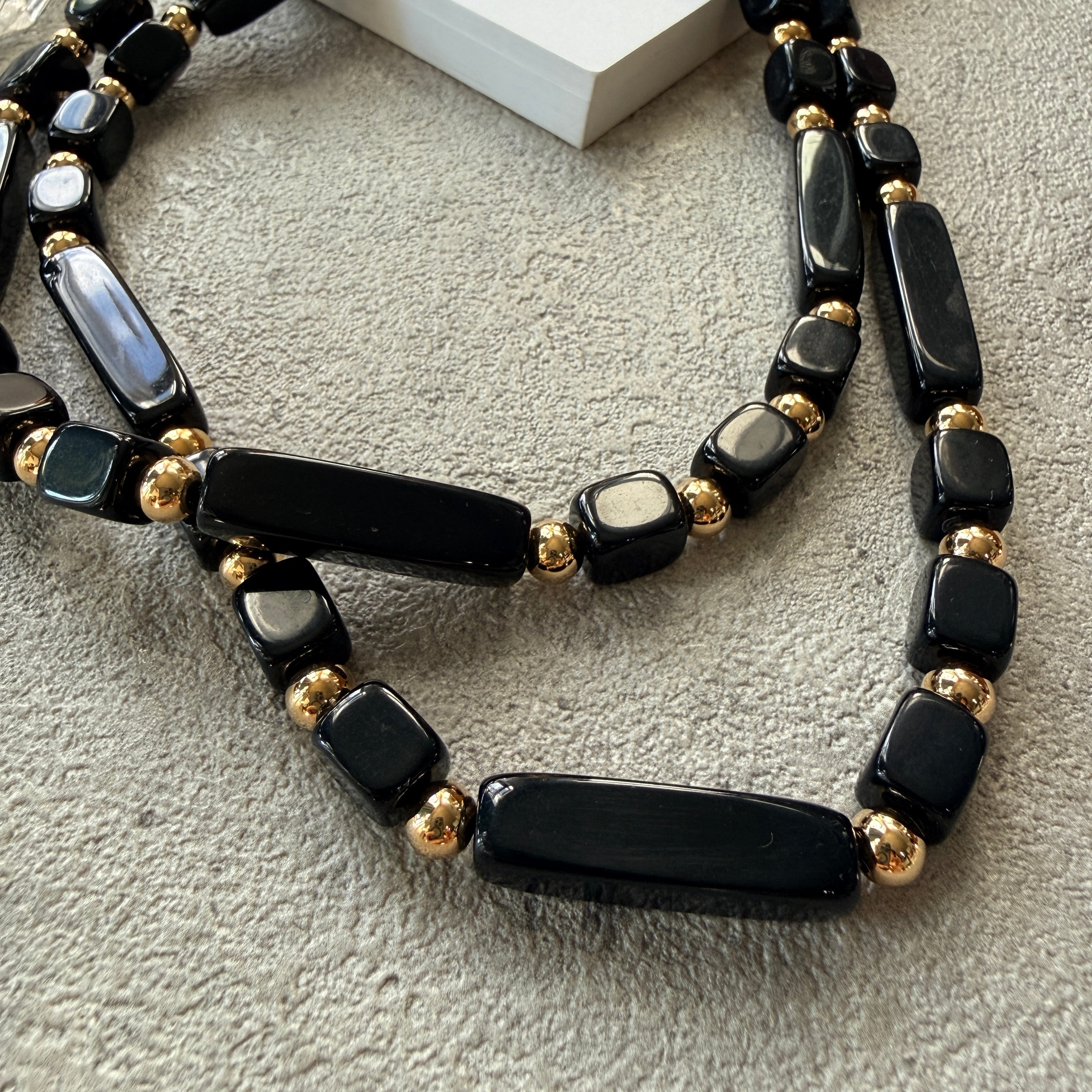 柔らかく艶のあるテクスチャーと丸みを帯びた長方形と正方形のブラックビーズ。ゴールドメタルビーズがピリッとアクセントとなり、レトロモダンなデザインが魅力的です。