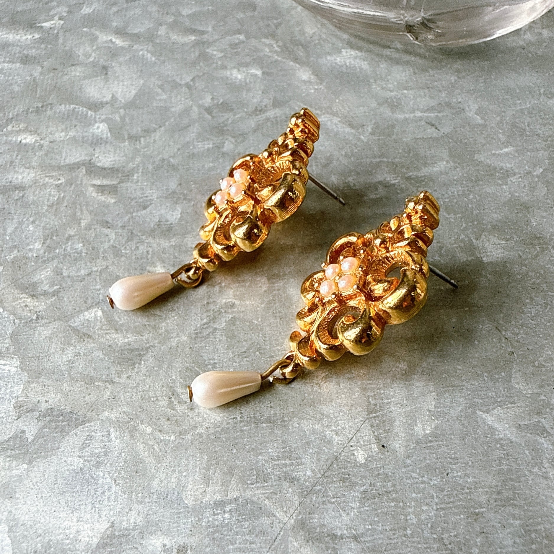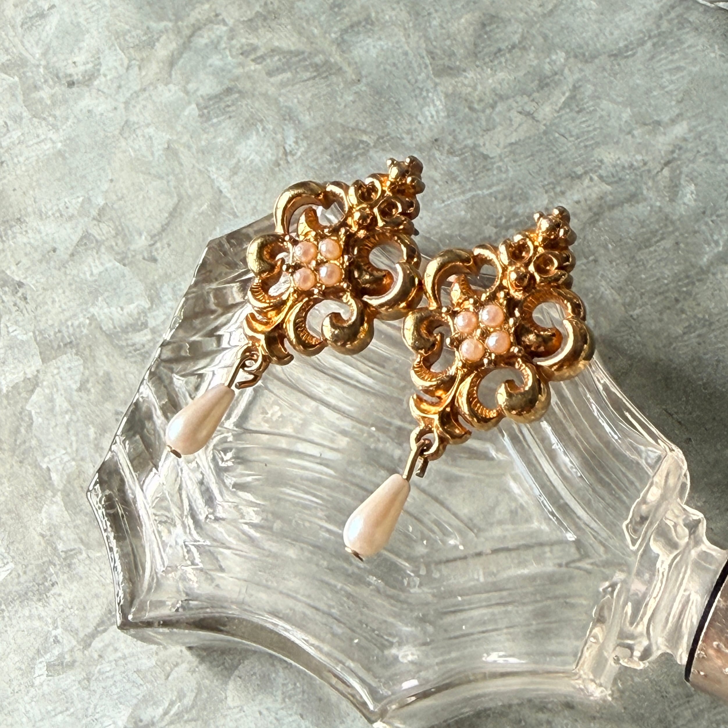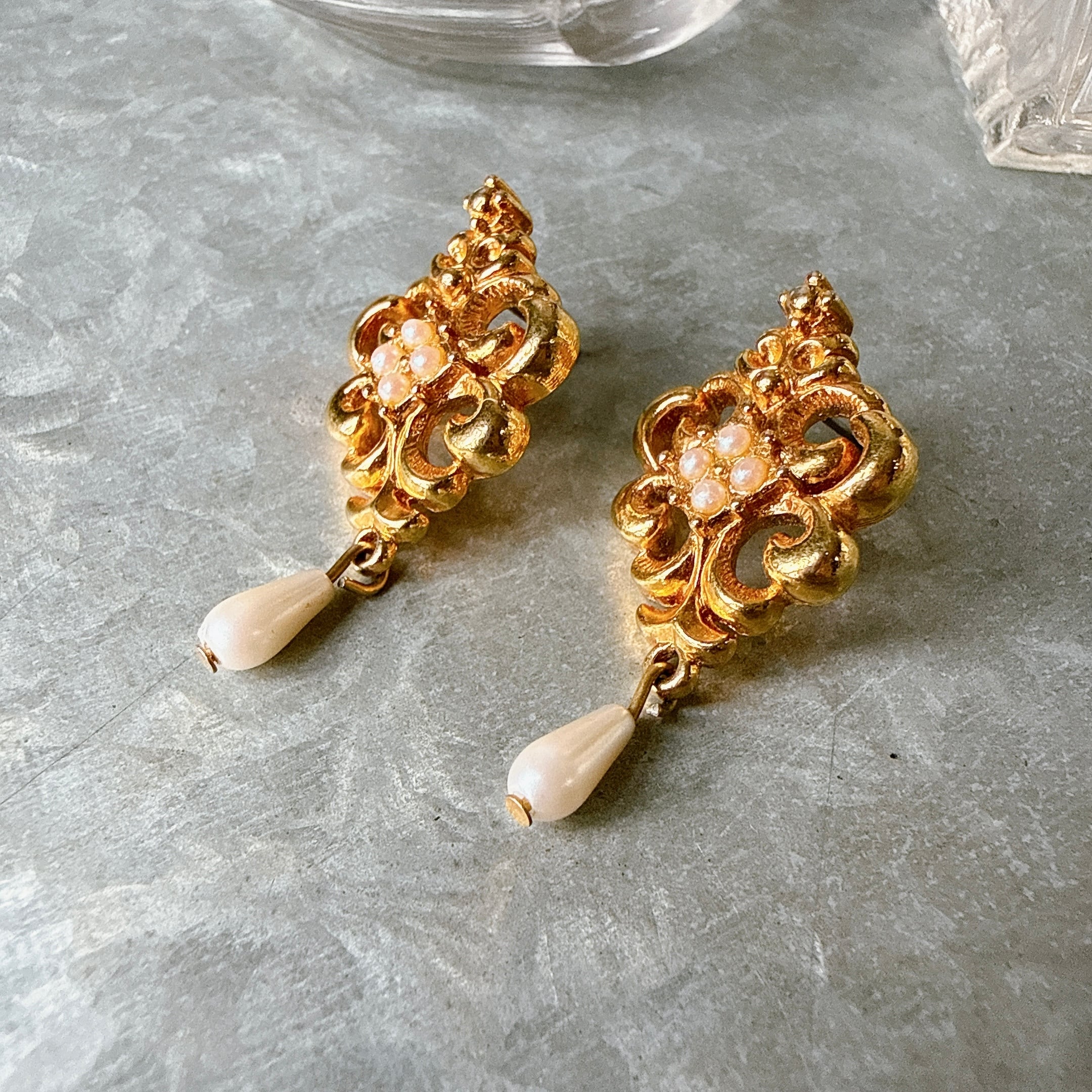 PA454-【 AVON 】エイボン・ヴィンテージピアス 1980's Victorian Style Faux Pearl Gold Tone Dangle Pierced Earrings | eslup_boutique