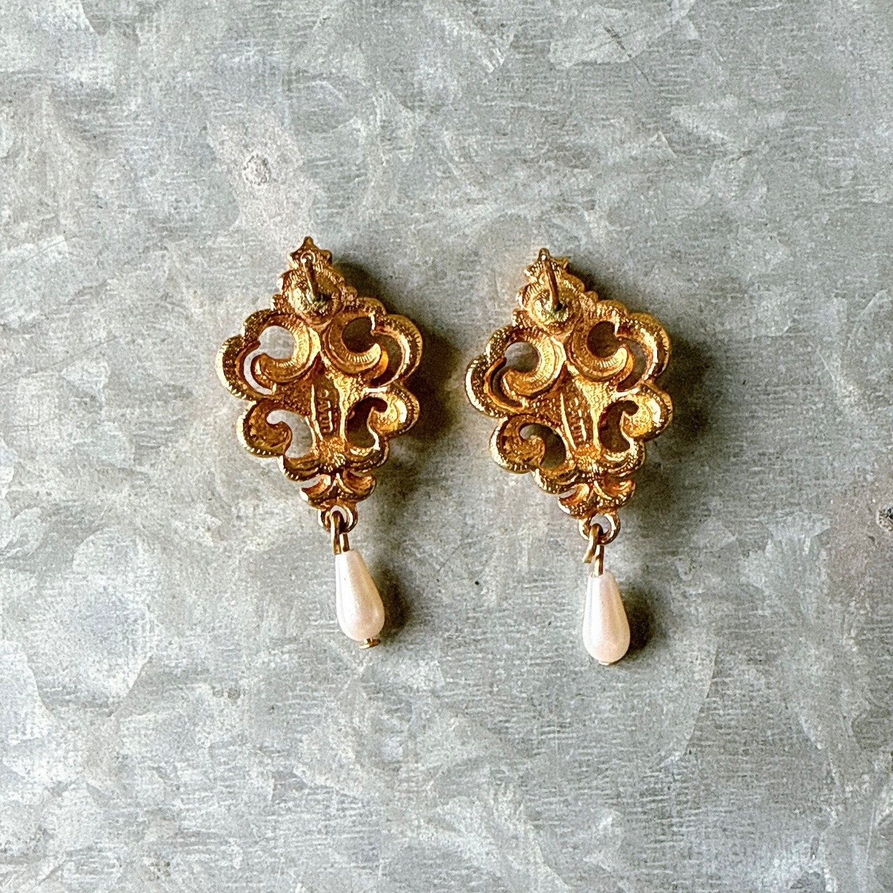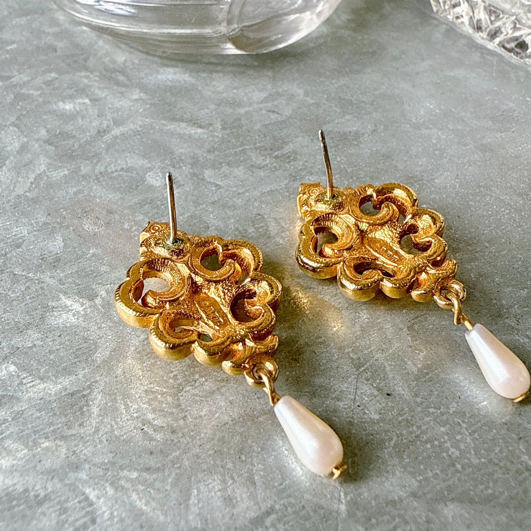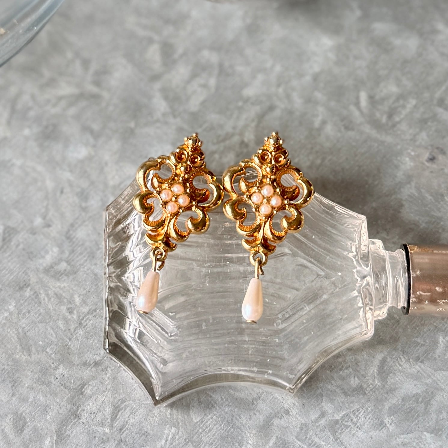PA454-【 AVON 】エイボン・ヴィンテージピアス 1980's Victorian Style Faux Pearl Gold Tone Dangle Pierced Earrings | eslup_boutique