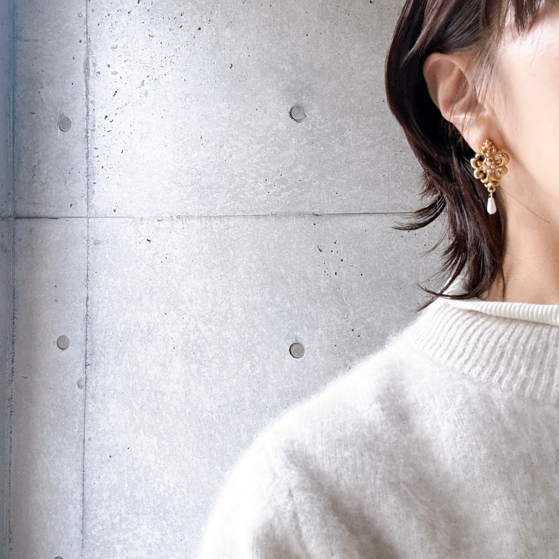 曲線的なオープンワークデザインに、ベージュ系の小さなパールがさりげなくアクセント、ドロップパールが揺らめく華やかなデザインです。