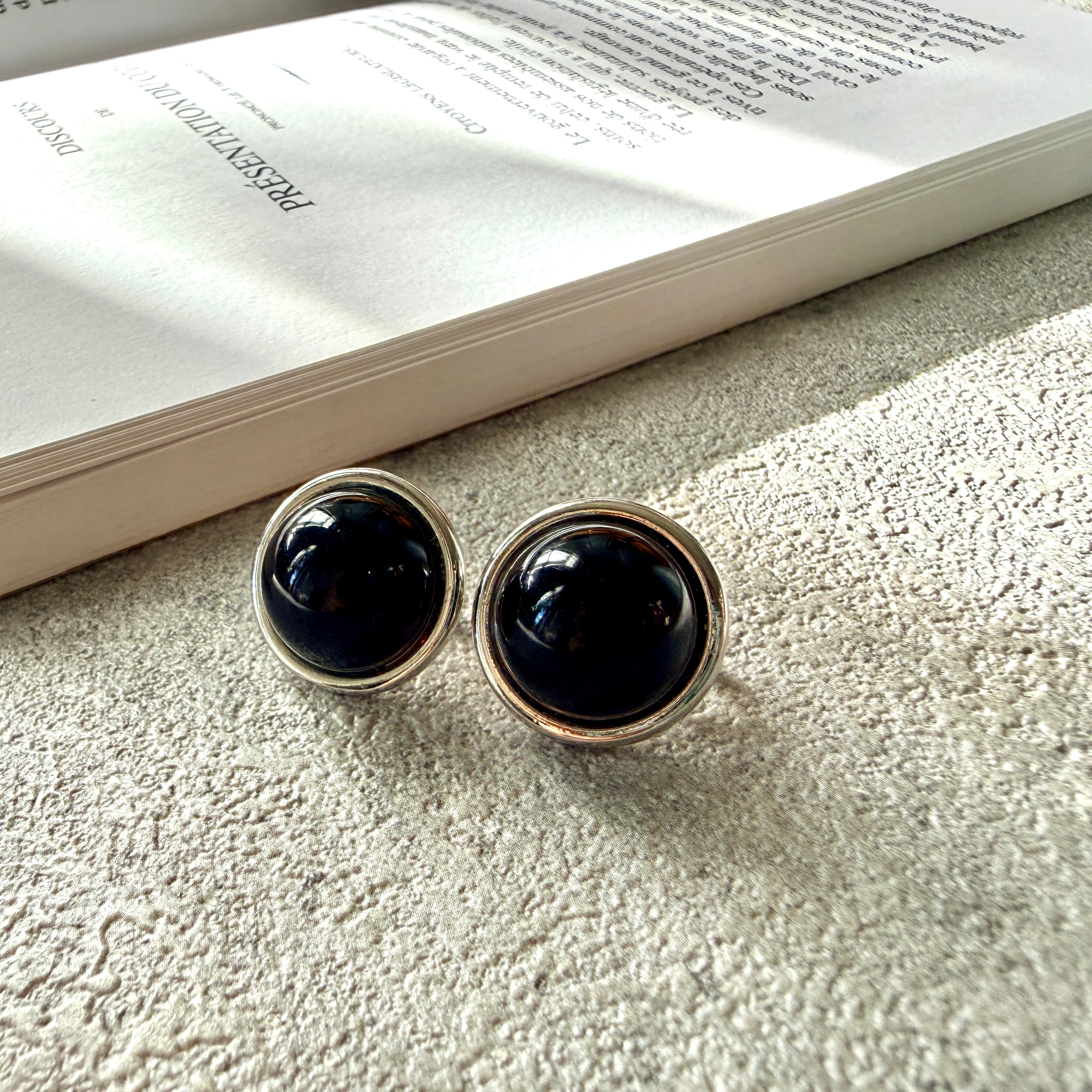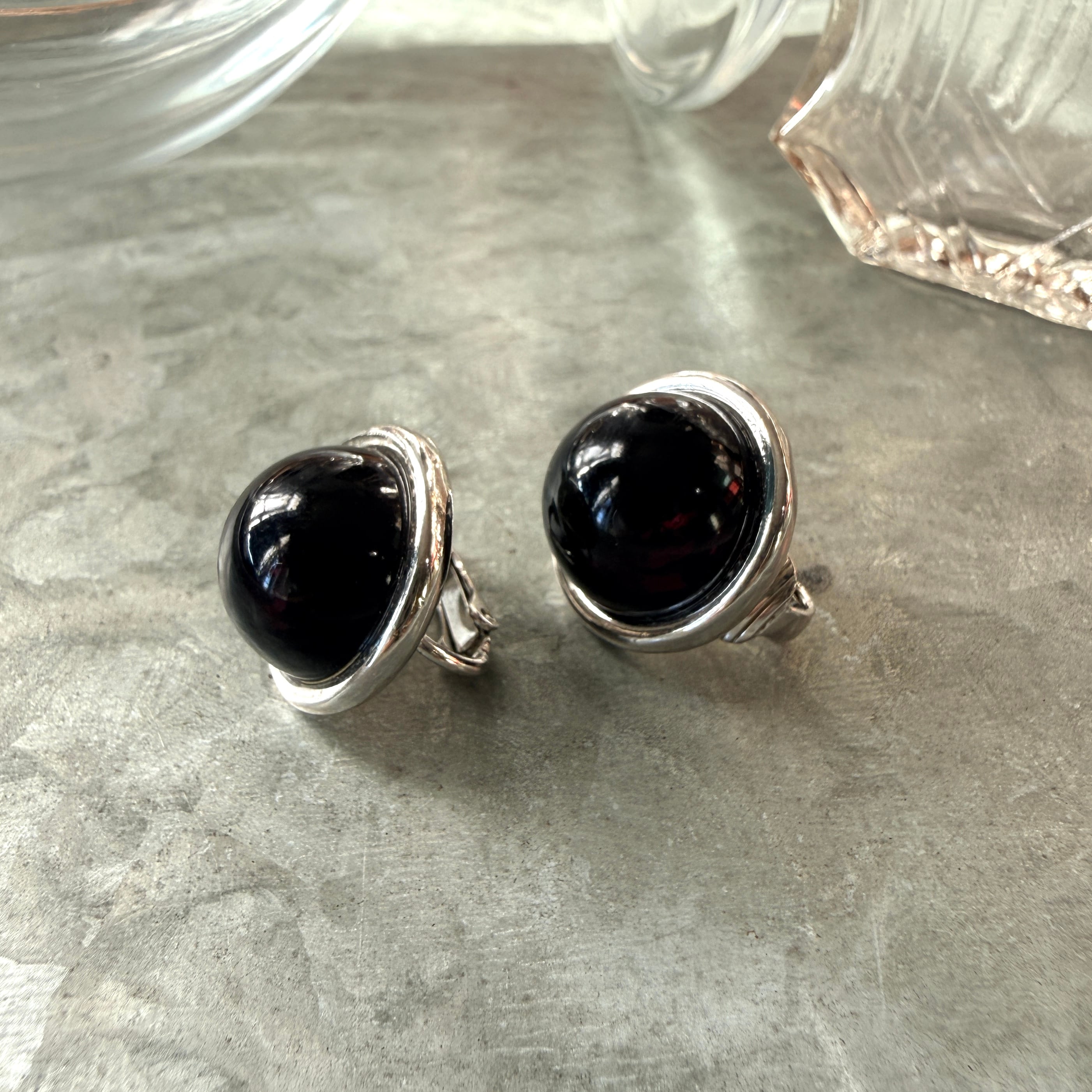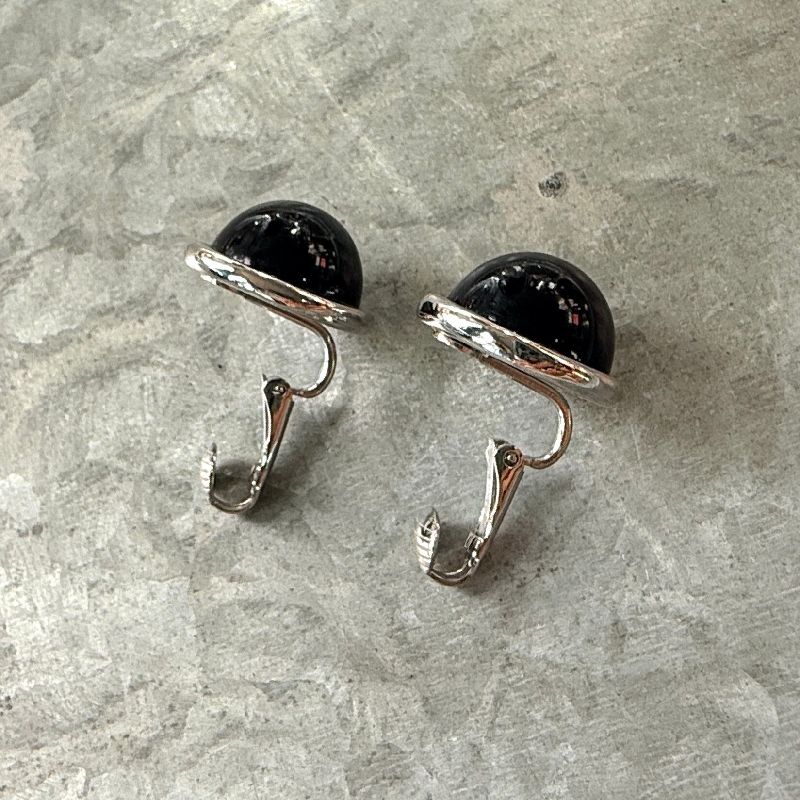 ブラックカボションのシルバートーンイヤリング。半円ドームのぷっくりとしたフォルムのグラスカボションで、ブラックオニキスのようなシックな印象が魅力的です。