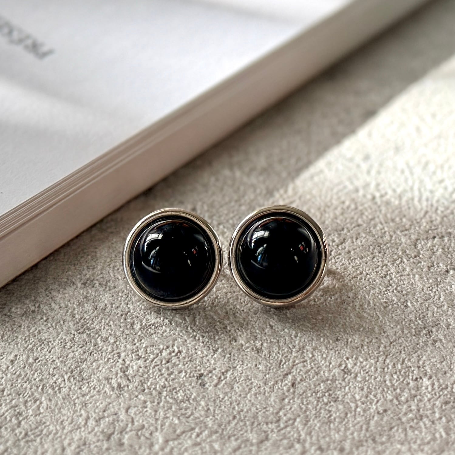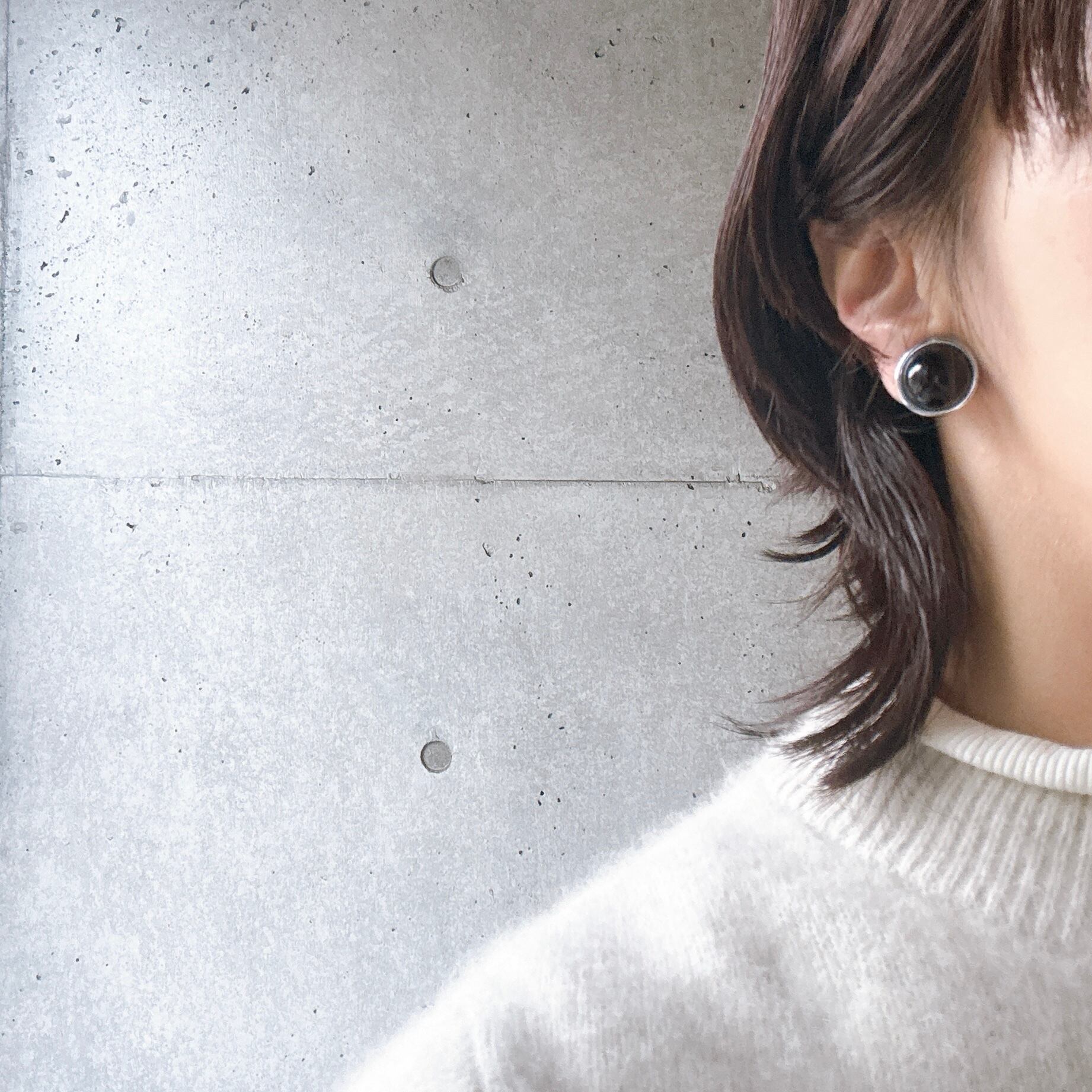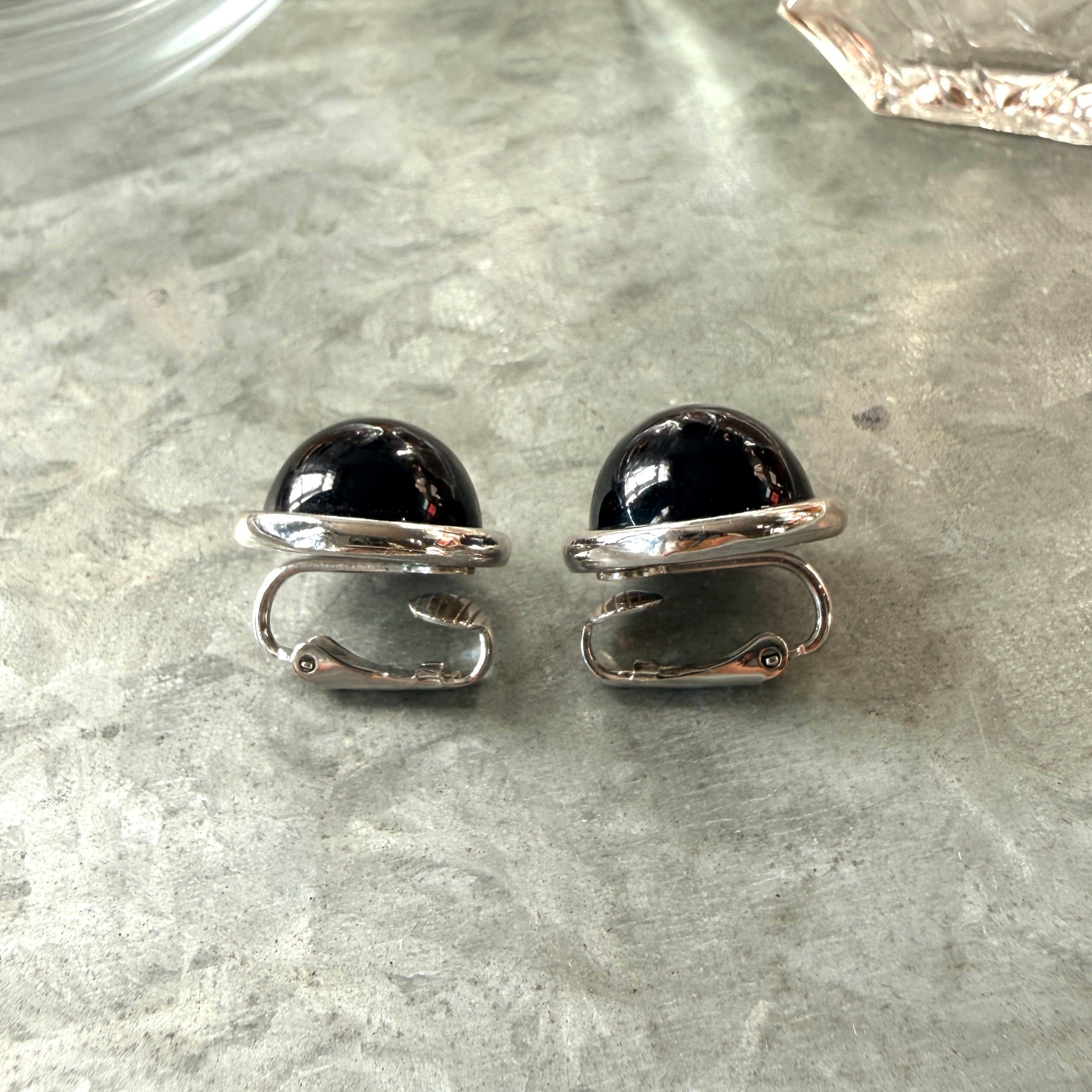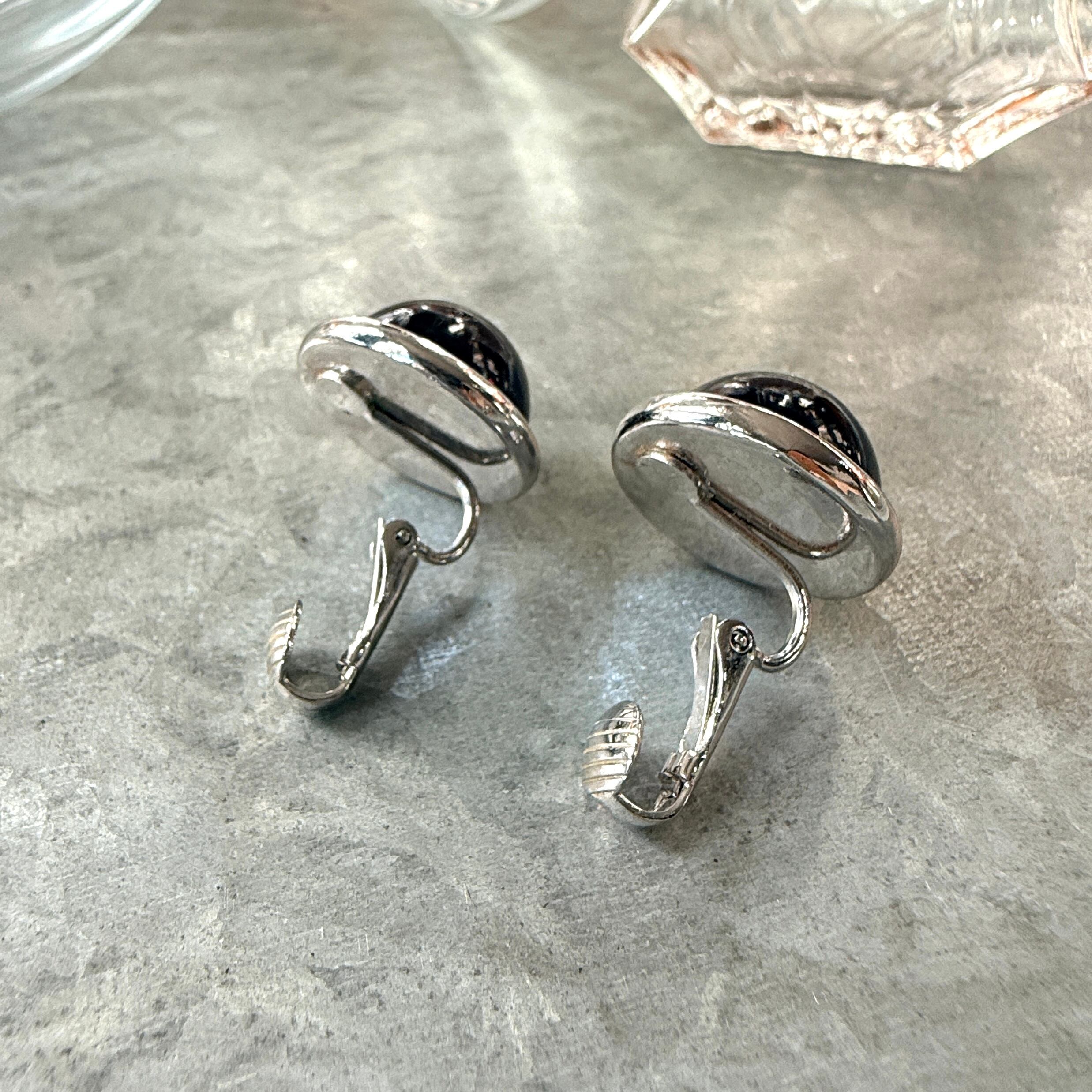 ブラックカボションのシルバートーンイヤリング。半円ドームのぷっくりとしたフォルムのグラスカボションで、ブラックオニキスのようなシックな印象が魅力的です。