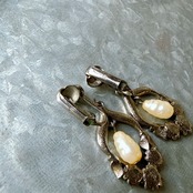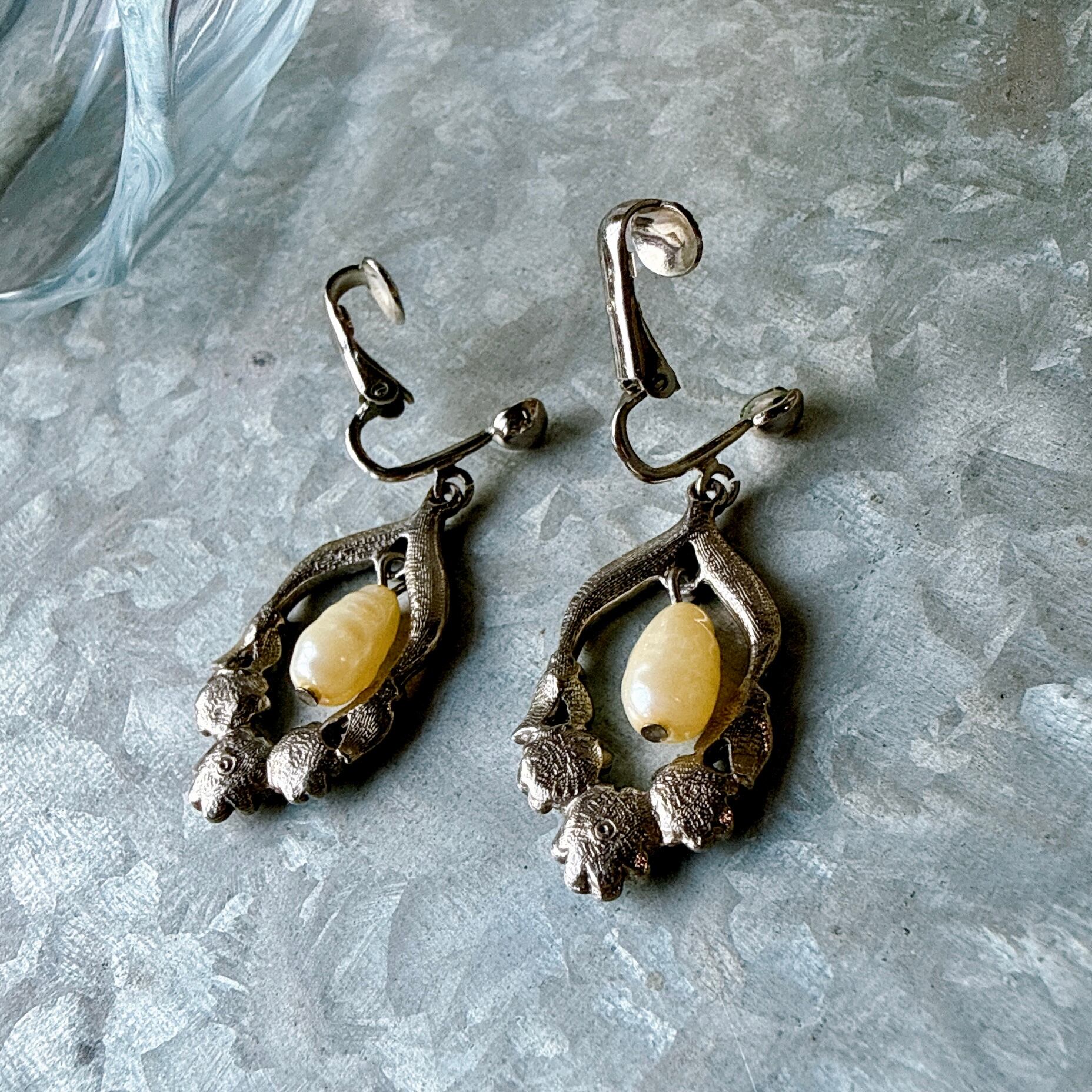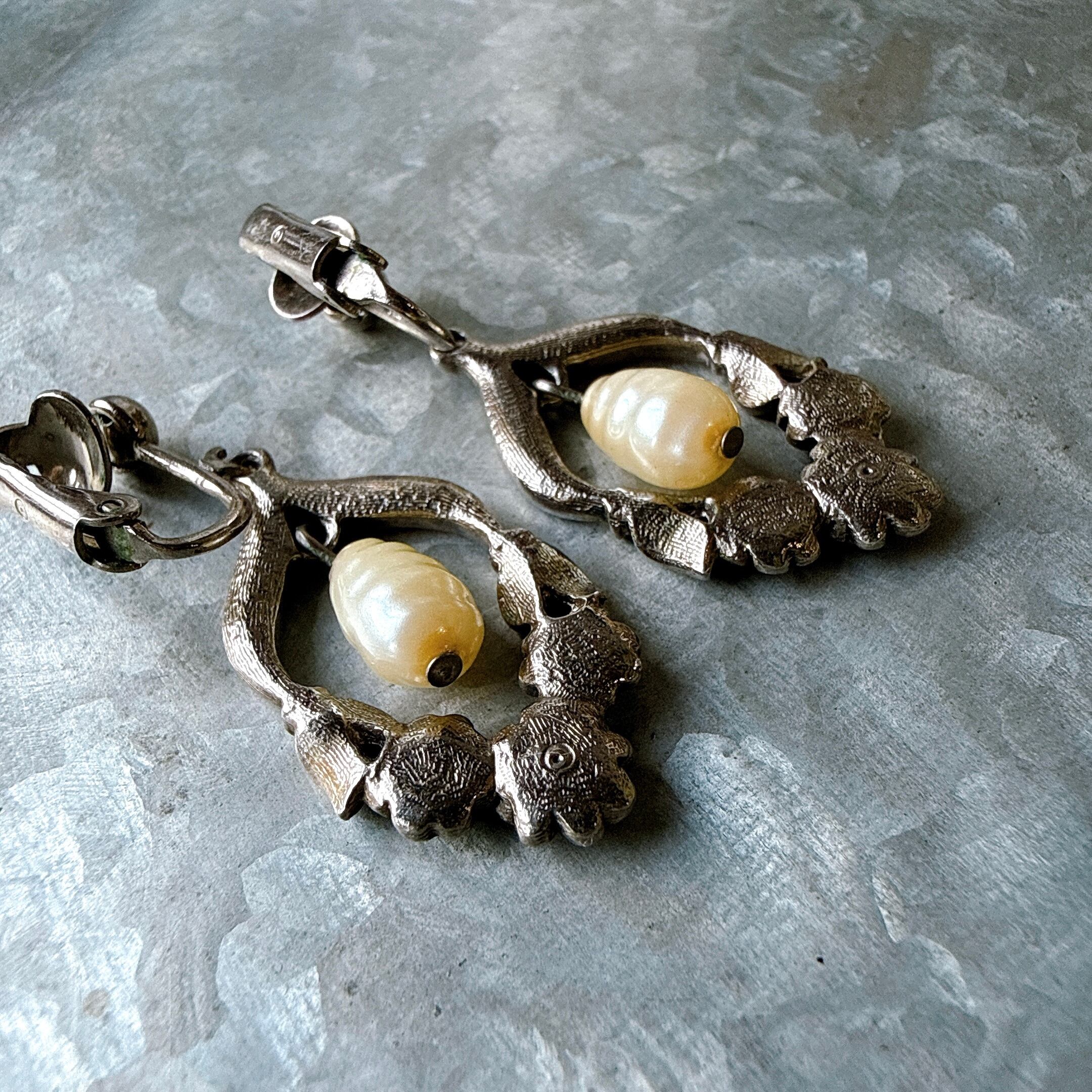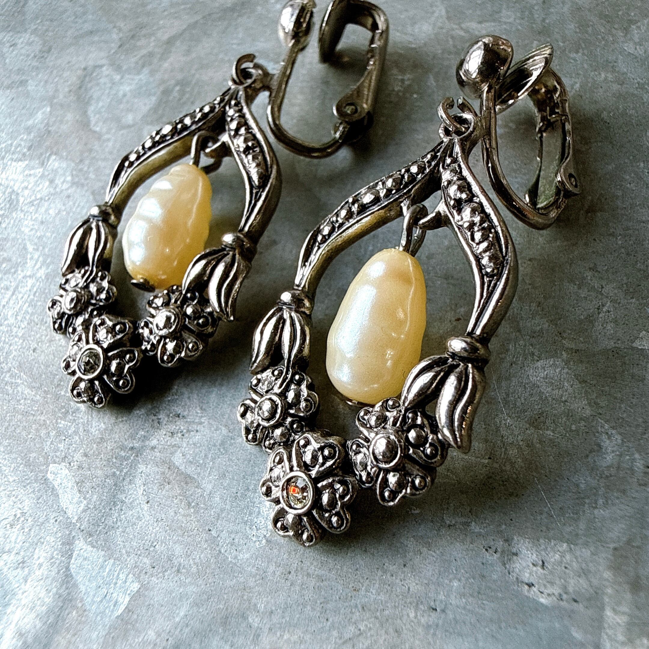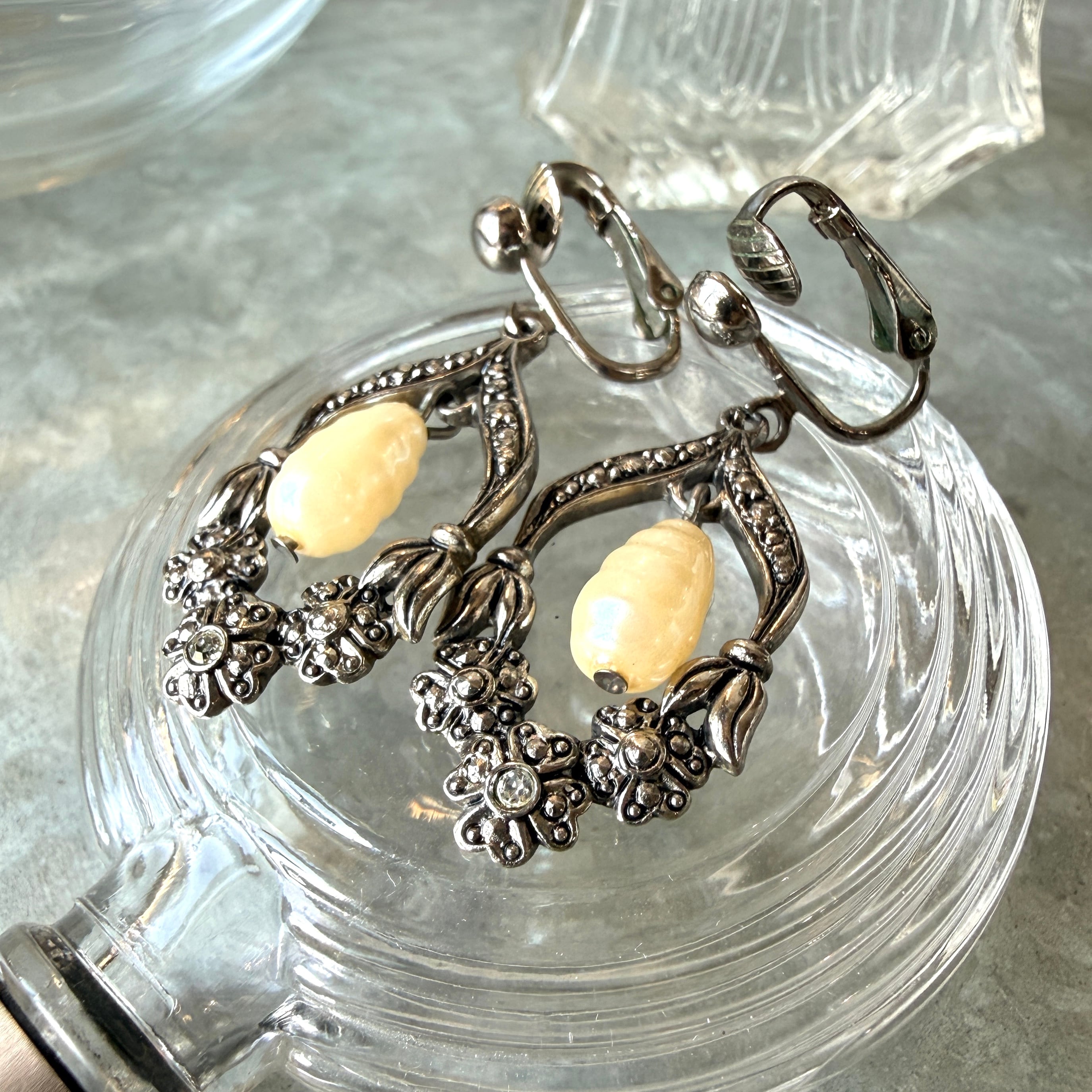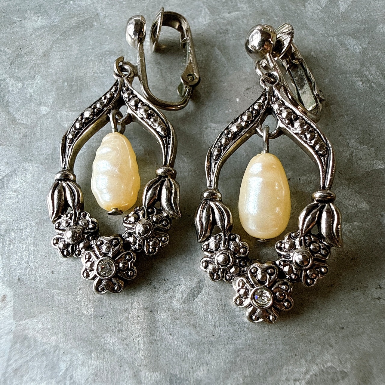 YA222-【 AVON 】エイボン・ヴィンテージイヤリング 1990's " Romantic Renaissance " Silver Tone Marcasite Faux Pearl Rhinestone Dangles Earrings | eslup_boutique