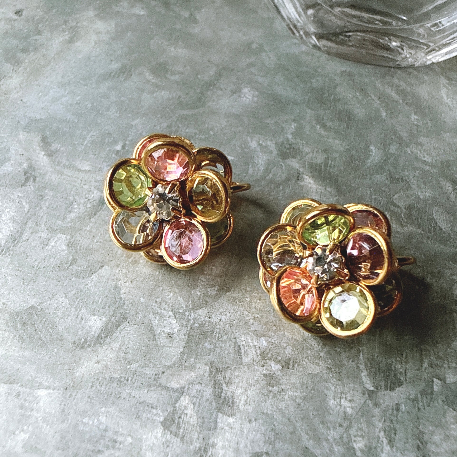 ゴールドトーンのベゼルセッティングと、カラフルで透明感のあるカットグラス。中央にはクリアなラインストーンが美しく煌めきます。