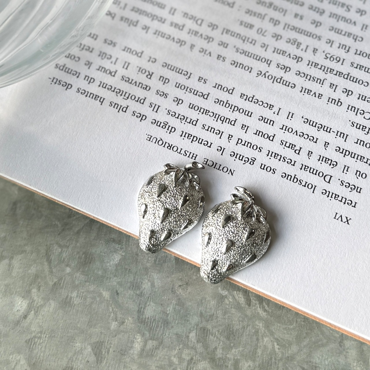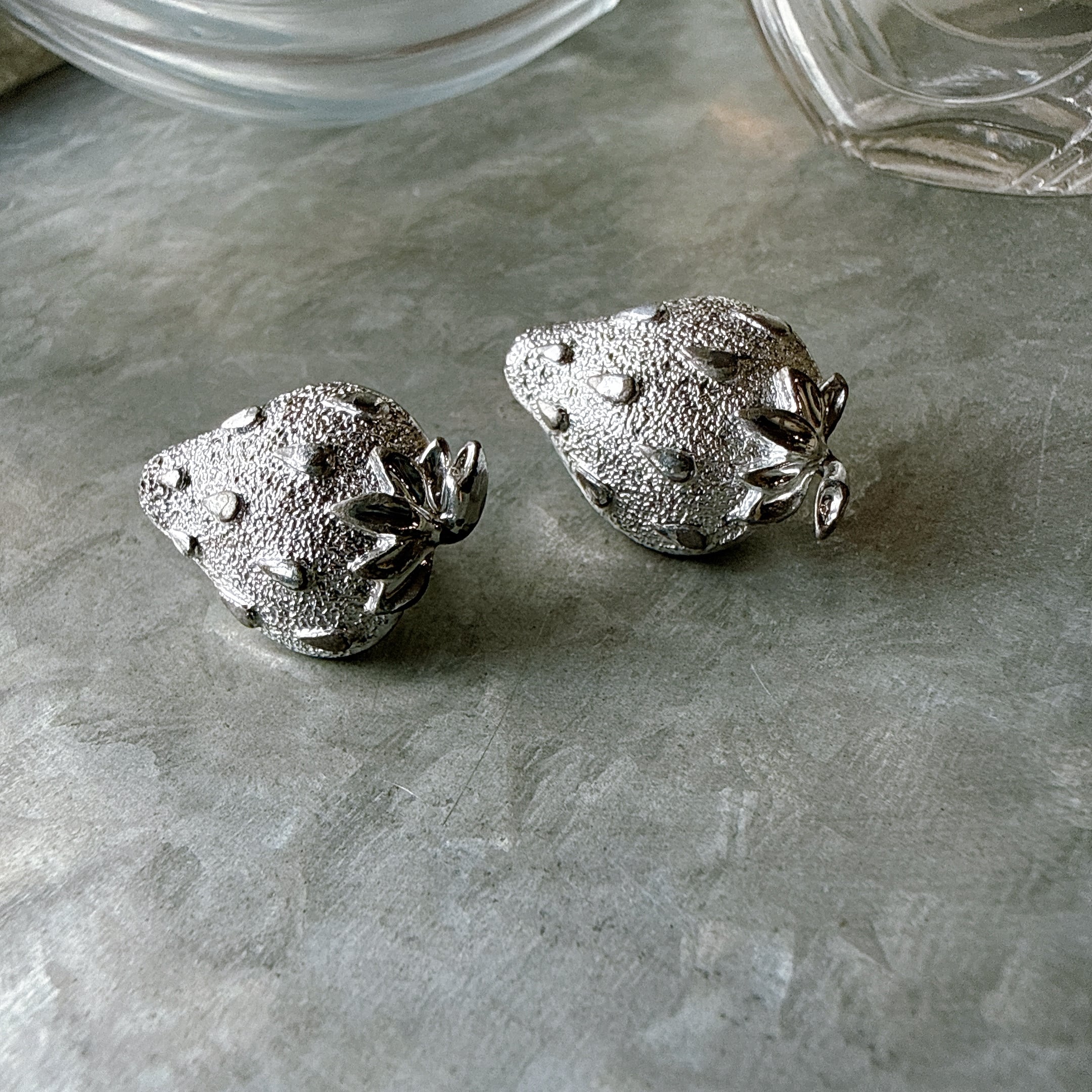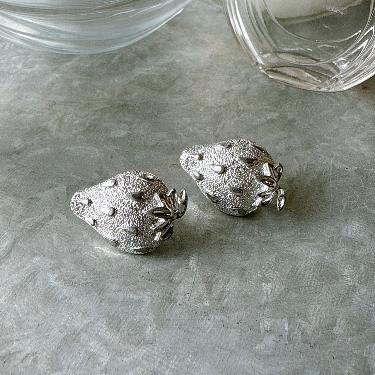 シルバートーンのストロベリーモチーフイヤリング。梨地になった微細なテクスチャーと、リアルなストロベリーをイメージできるレトロなデザイン。