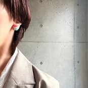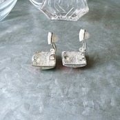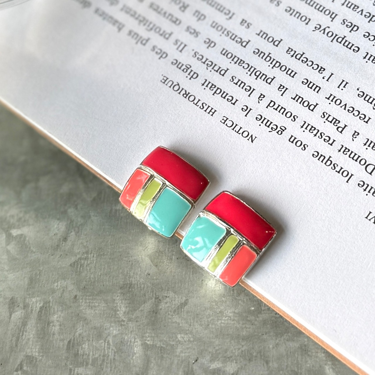 シャーベットカラーが印象的なブロックデザインのシルバートーンスクエアイヤリング。