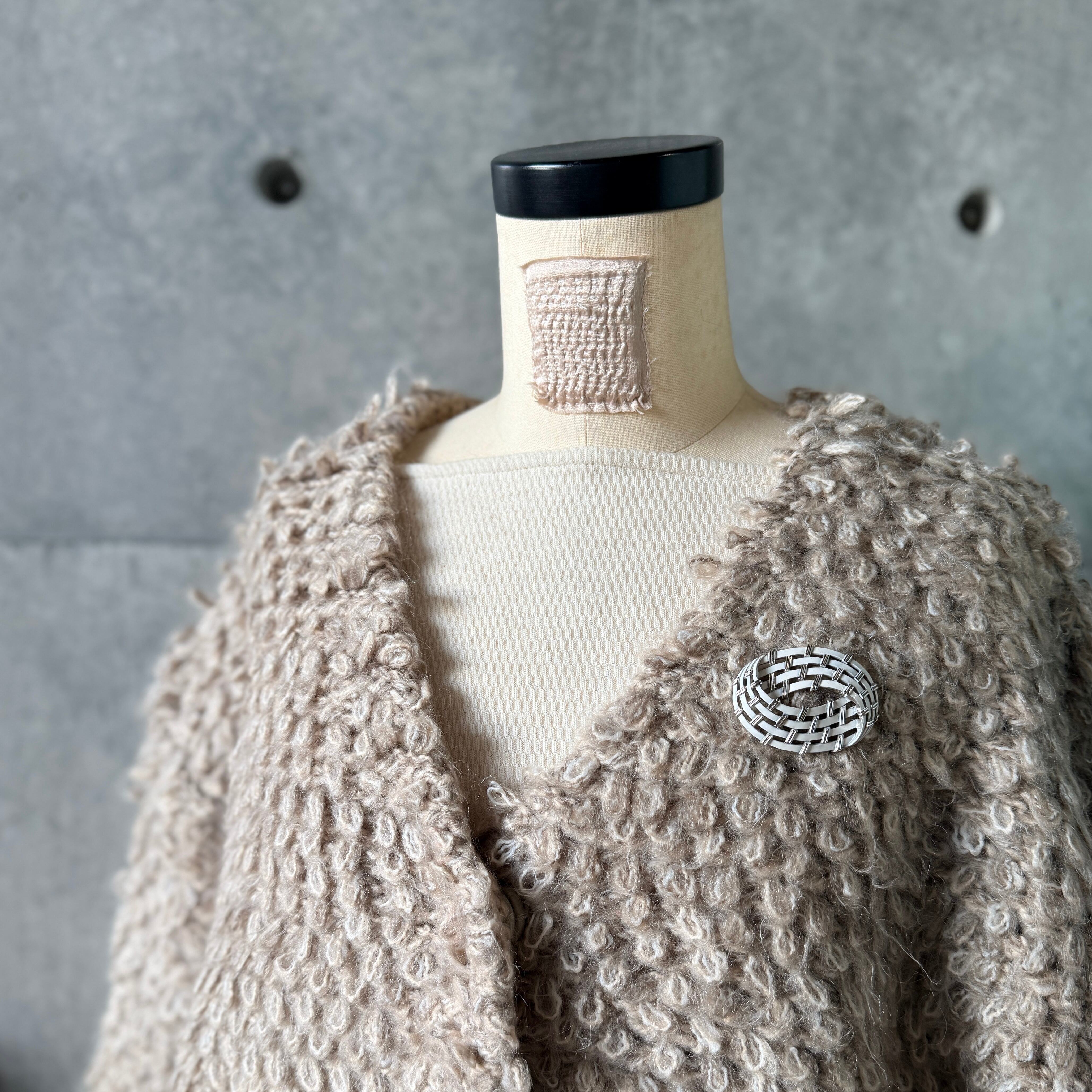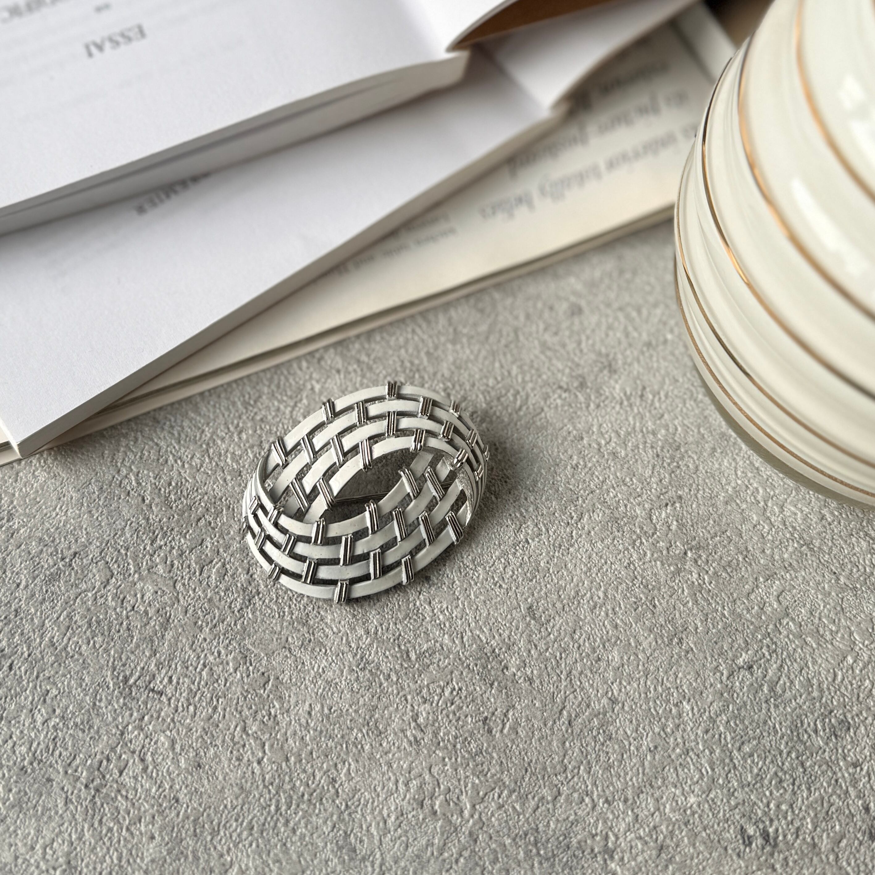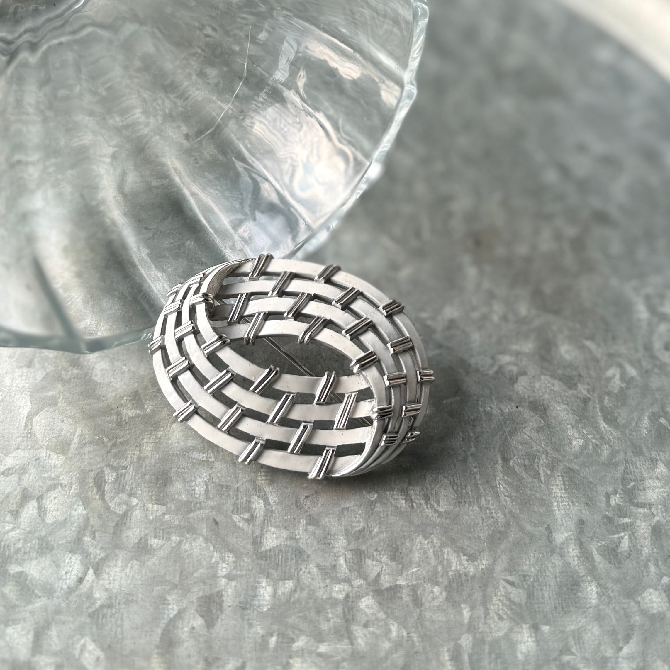 シルバートーンをベースにホワイトエナメルペイントされた、バスケットウィーブブローチ。