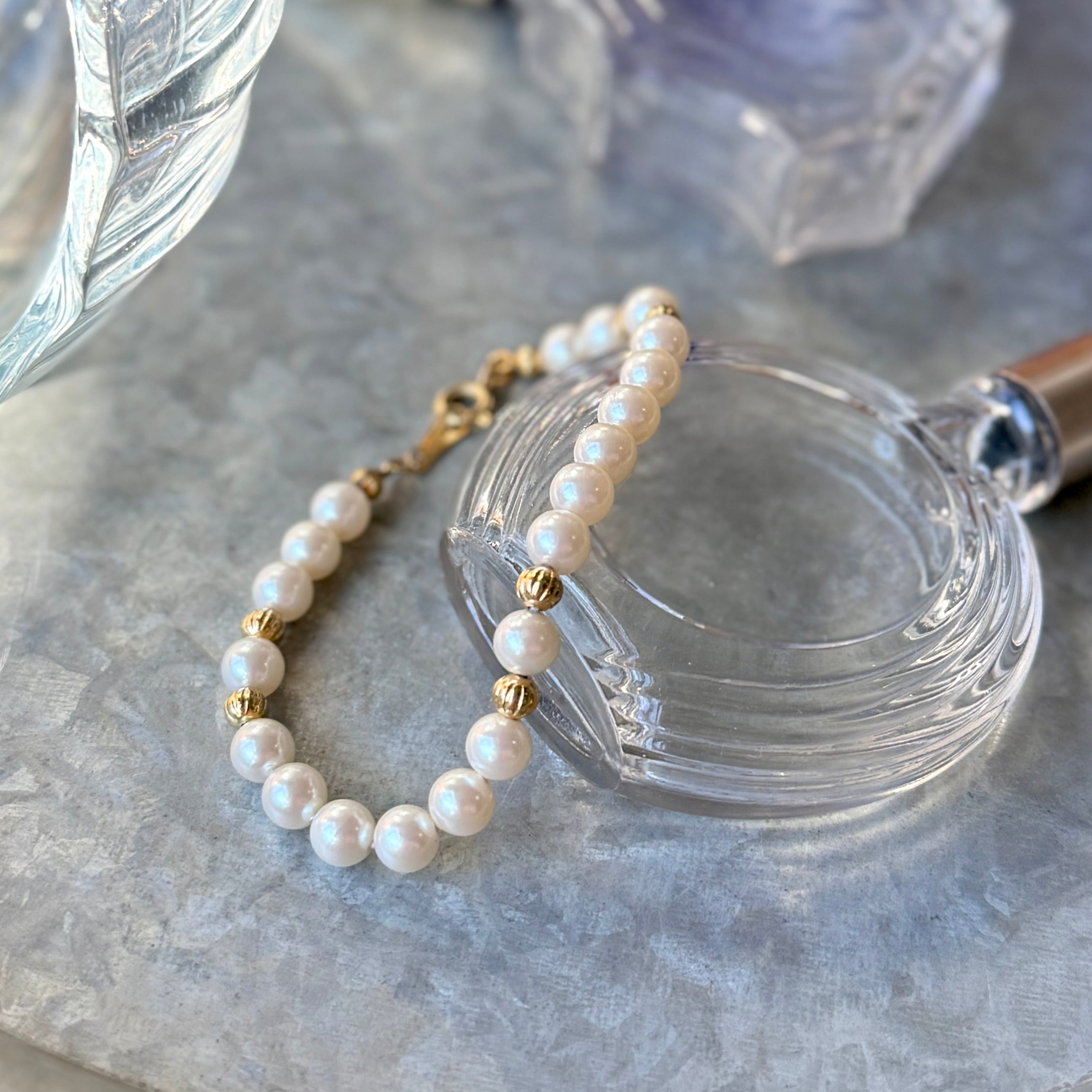 パールの光沢の美しさのあるとても状態のよいブレスレットで、手首に巻くだけでクラシックで上品なアクセントをつけてくれます。