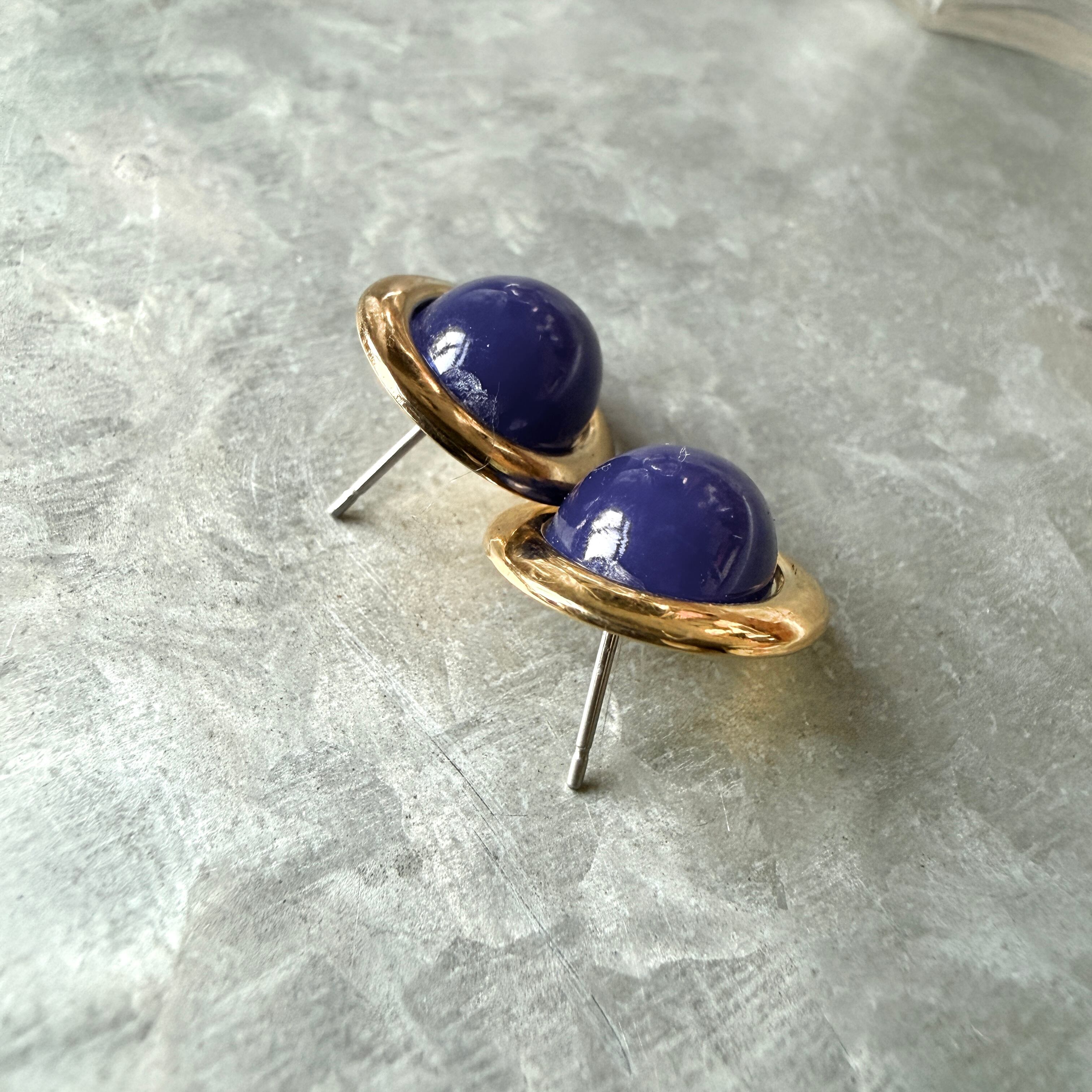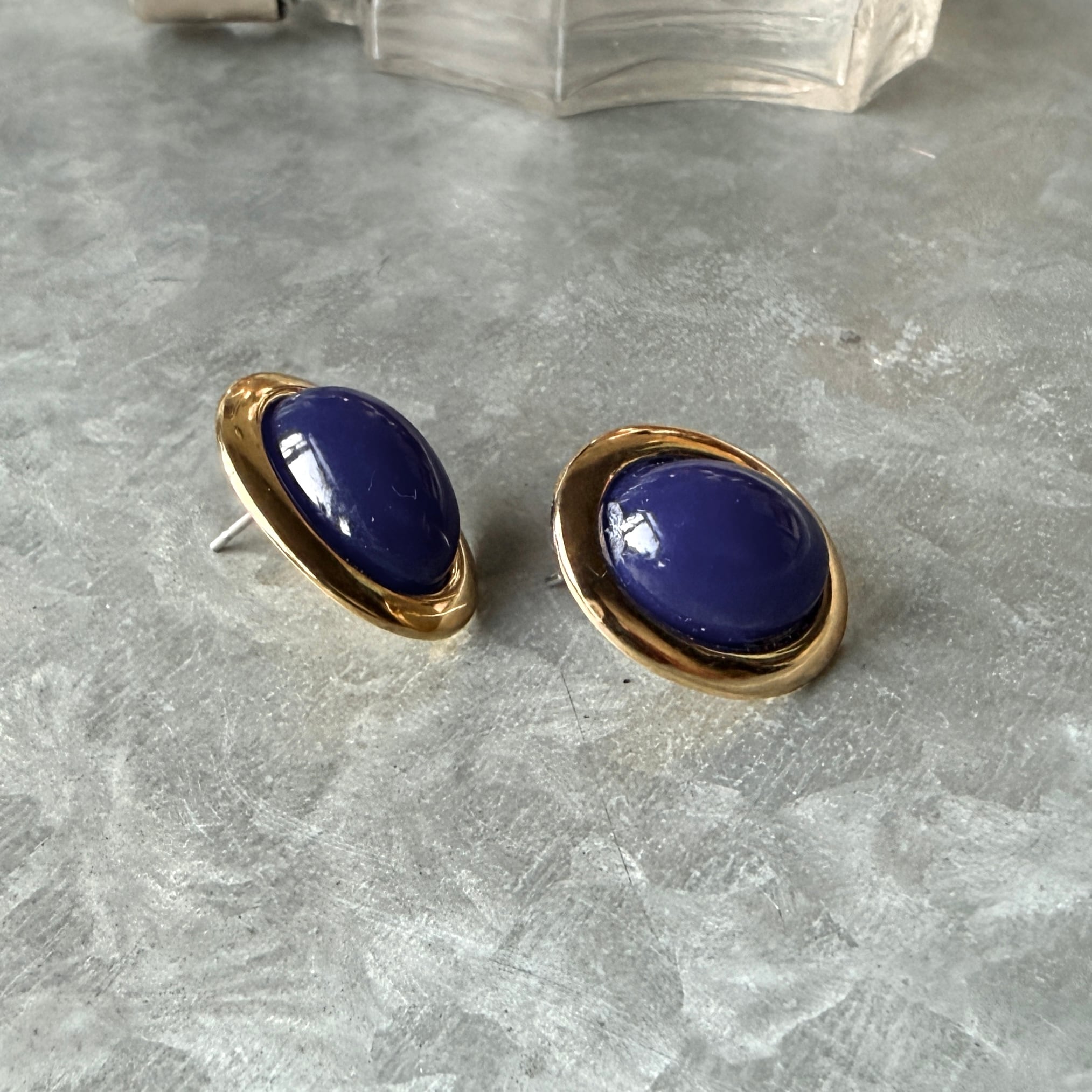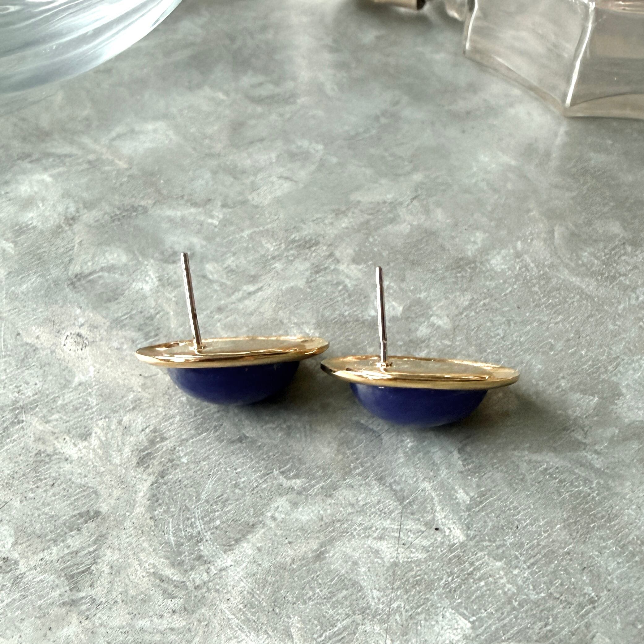 ネイビーカボションのゴールドトーンオーバルピアス。