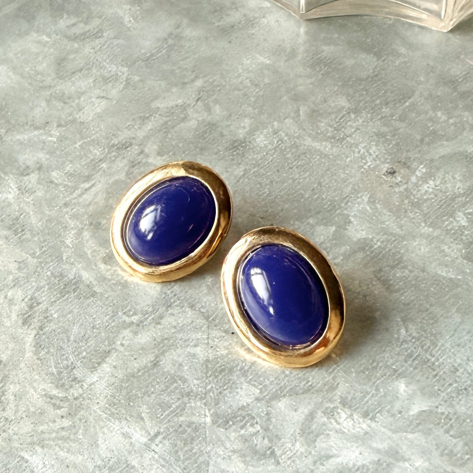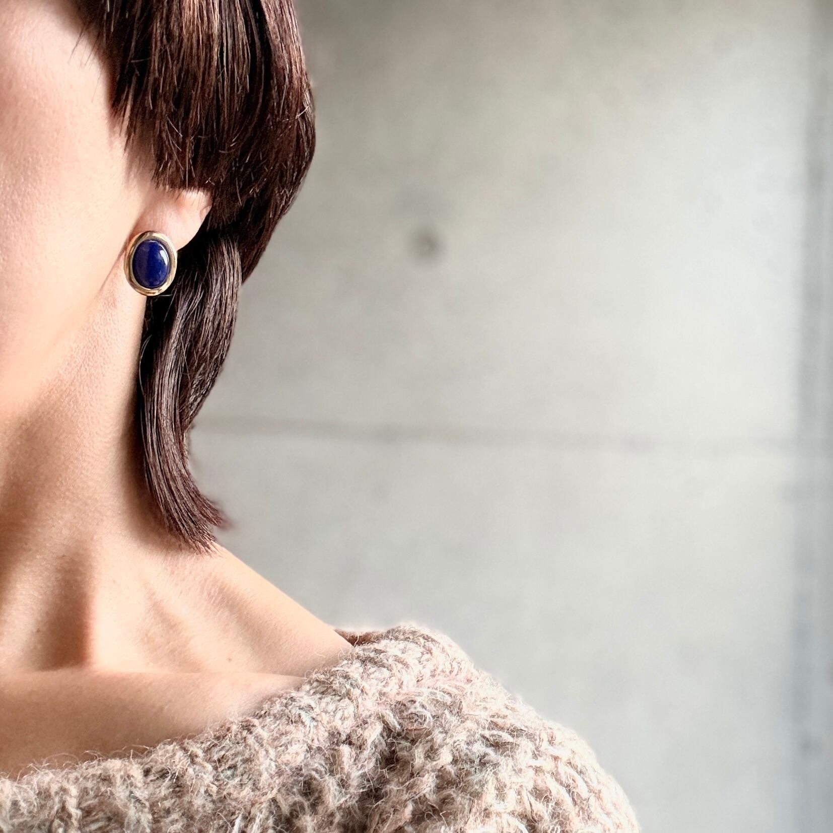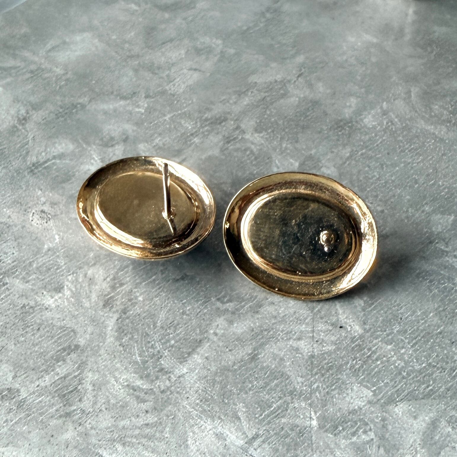 ネイビーカボションのゴールドトーンオーバルピアス。