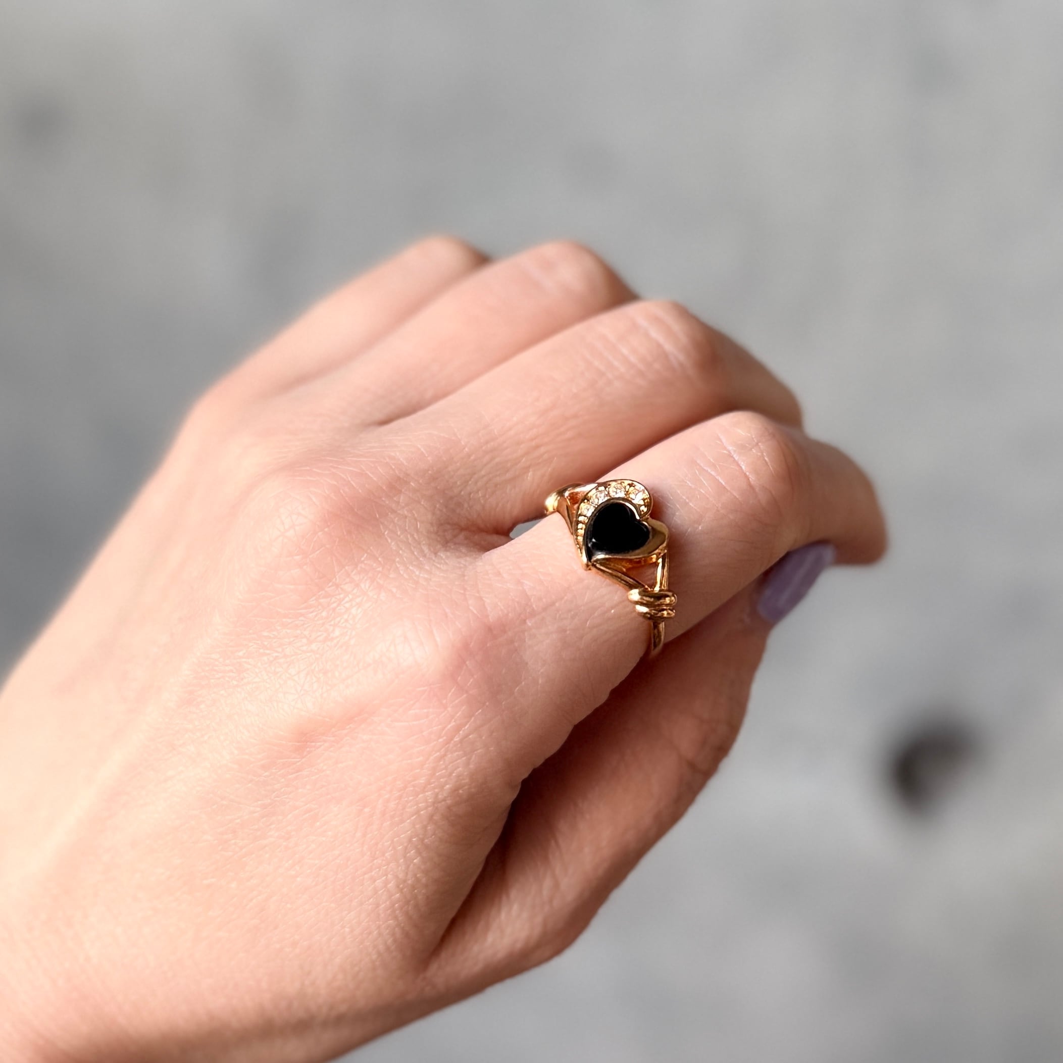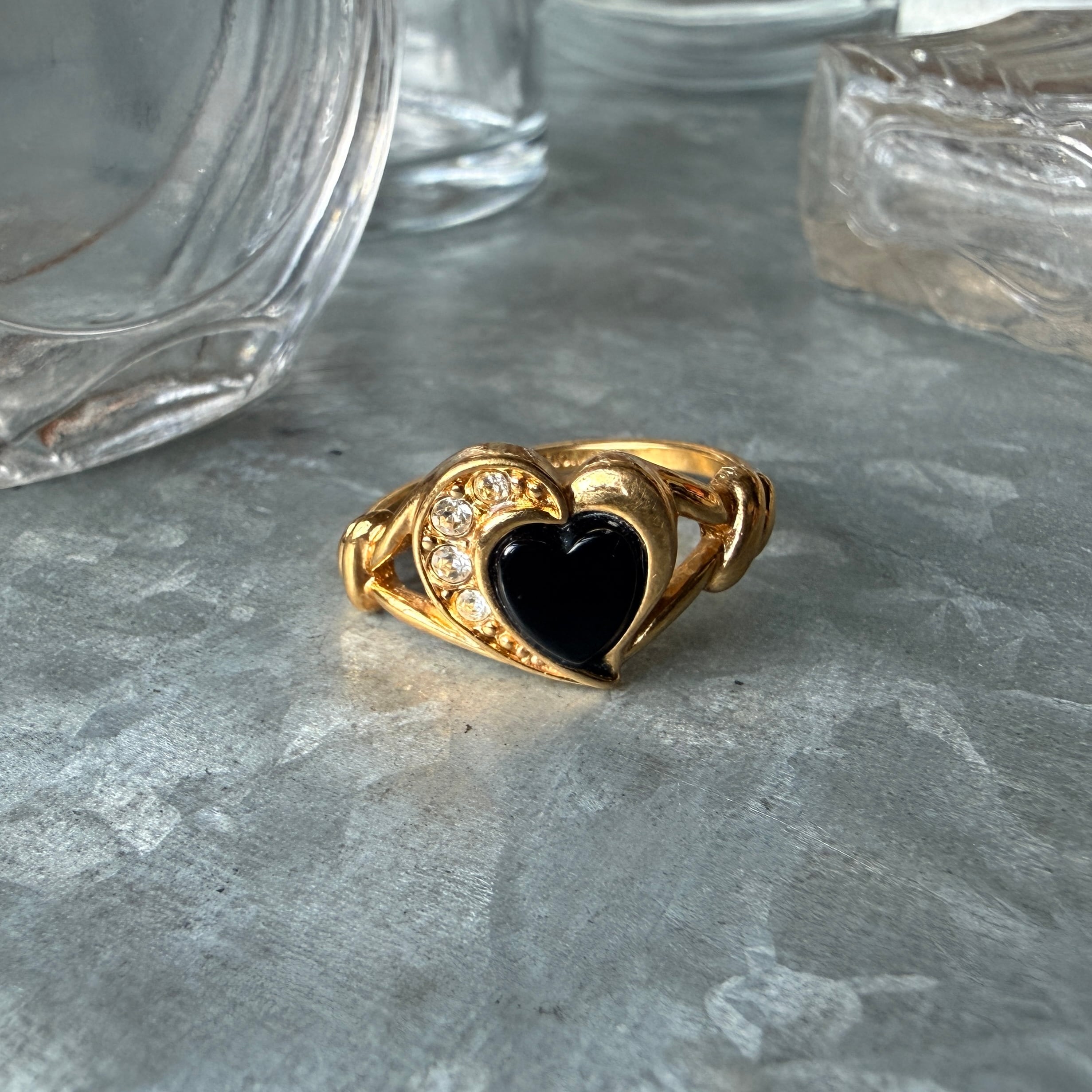 ゴールドトーンをベースにブラックオニキスのハートとクリアラインストーンが施されたリング。
