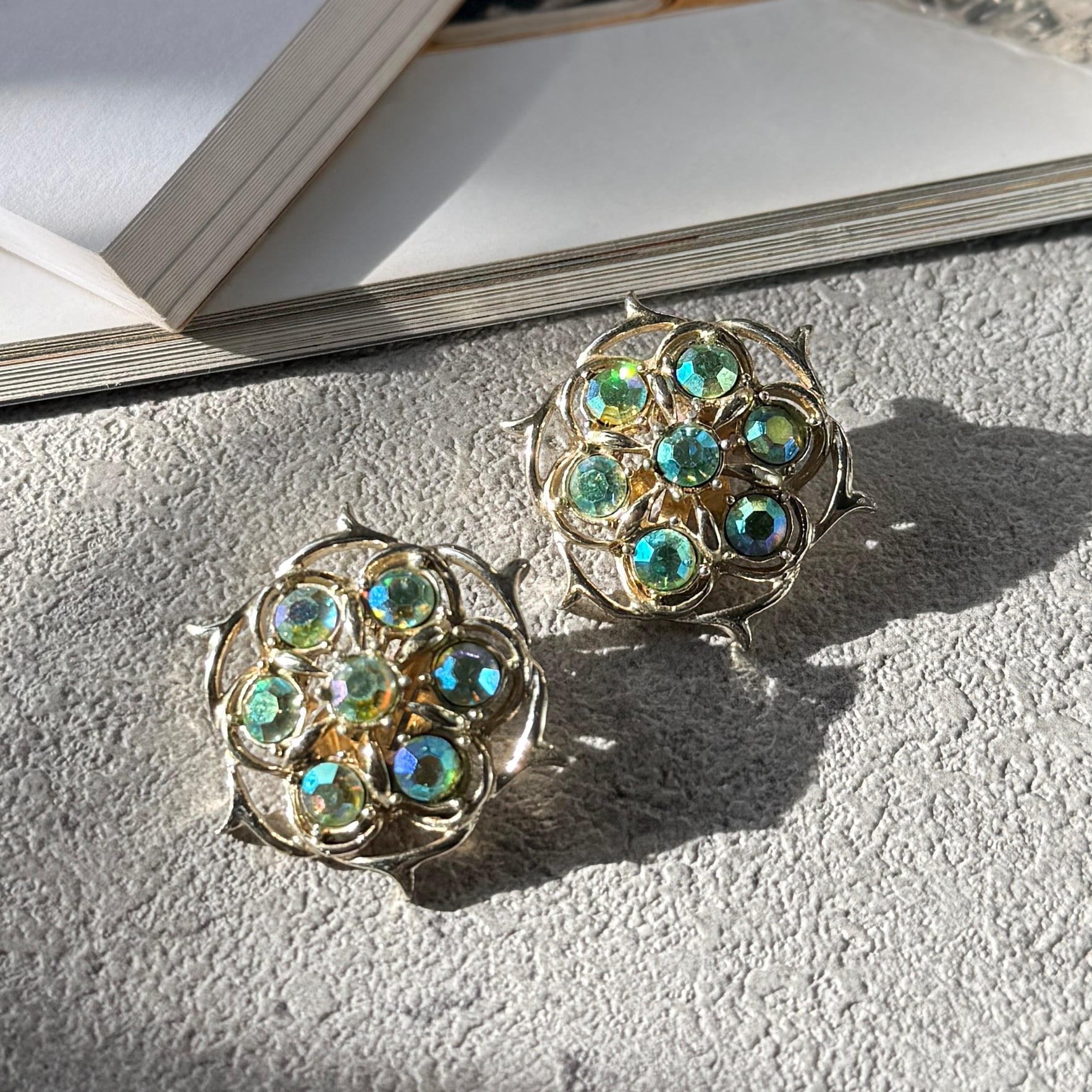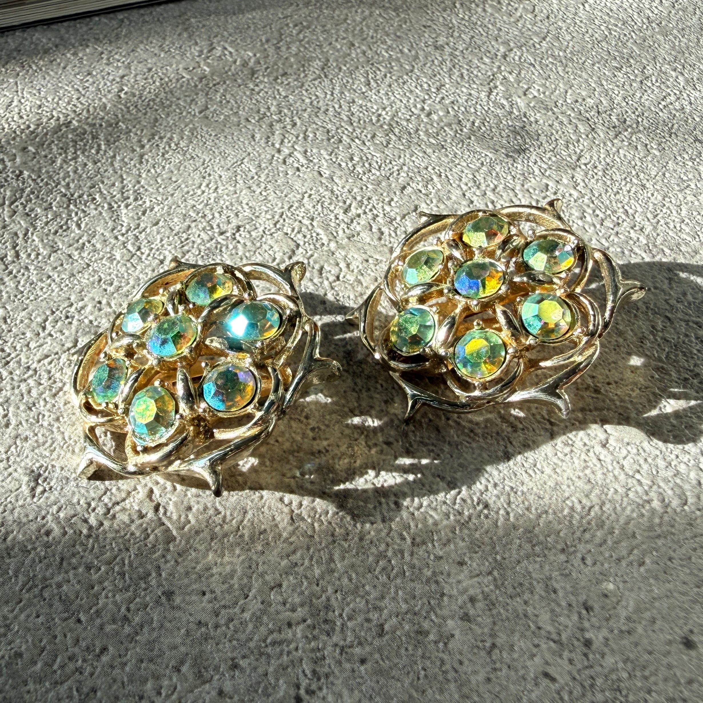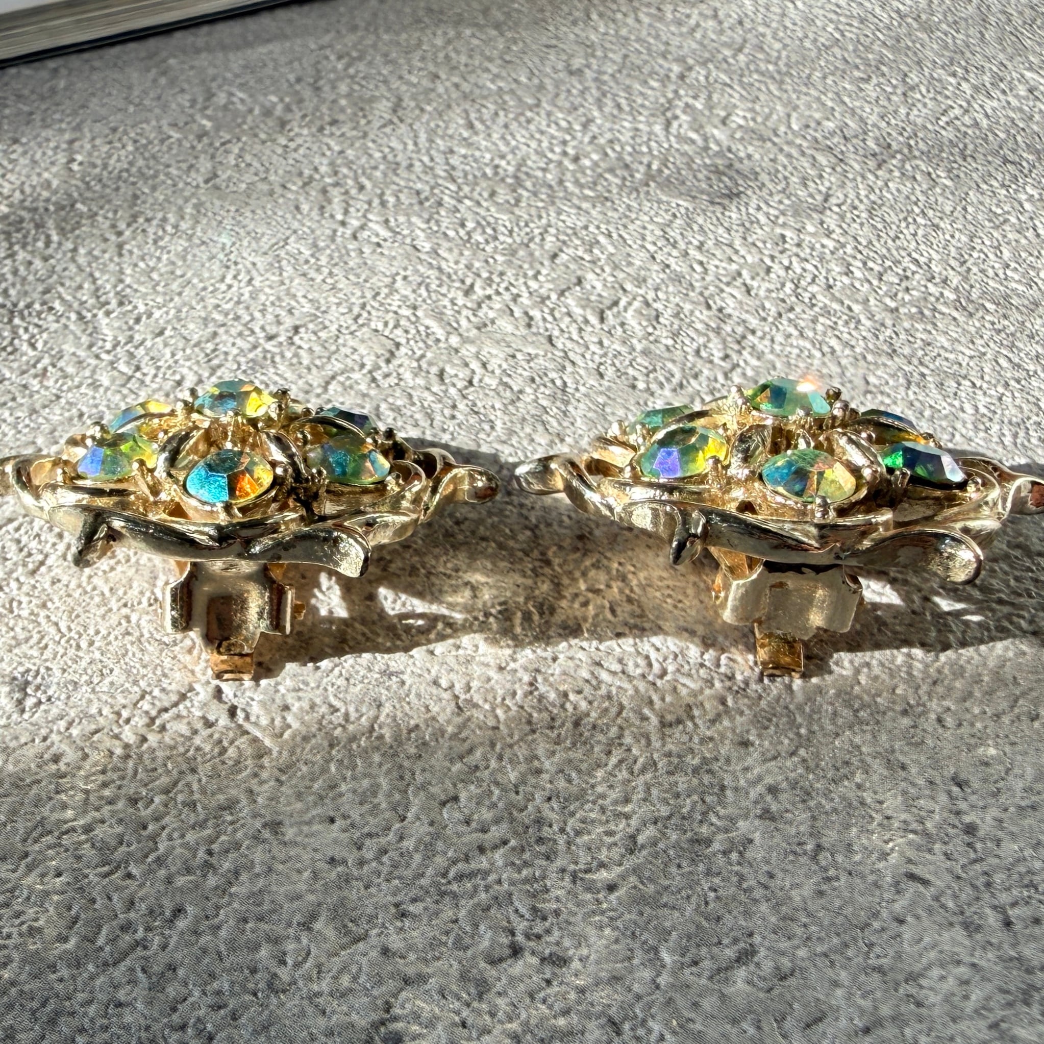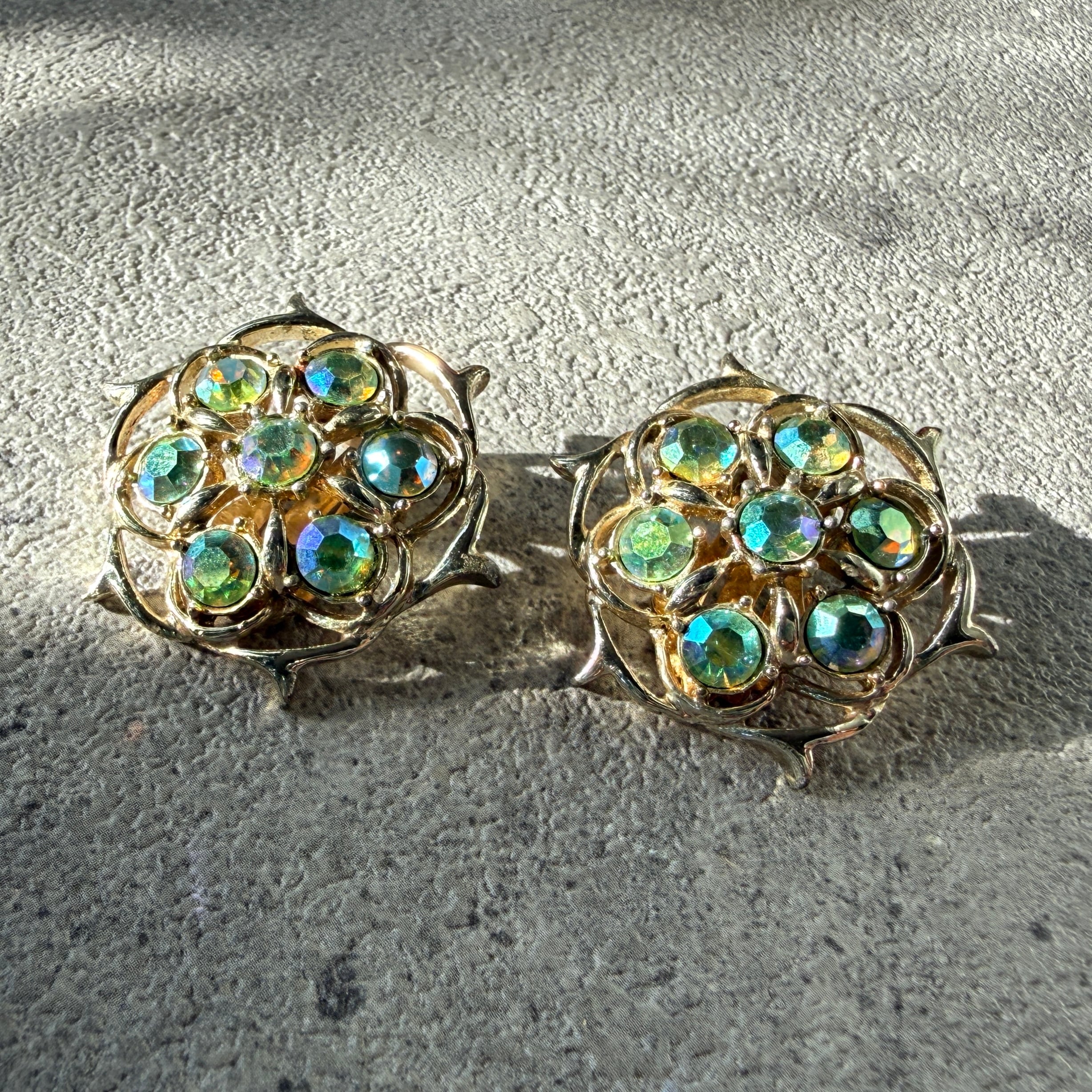 YS101-【 Sarah Coventry 】サラコベントリー・ヴィンテージイヤリング 1960's "LIME LIGHT" Aurora Rhinestone Gold Tone Floral Clip-On Earrings | eslup_boutique