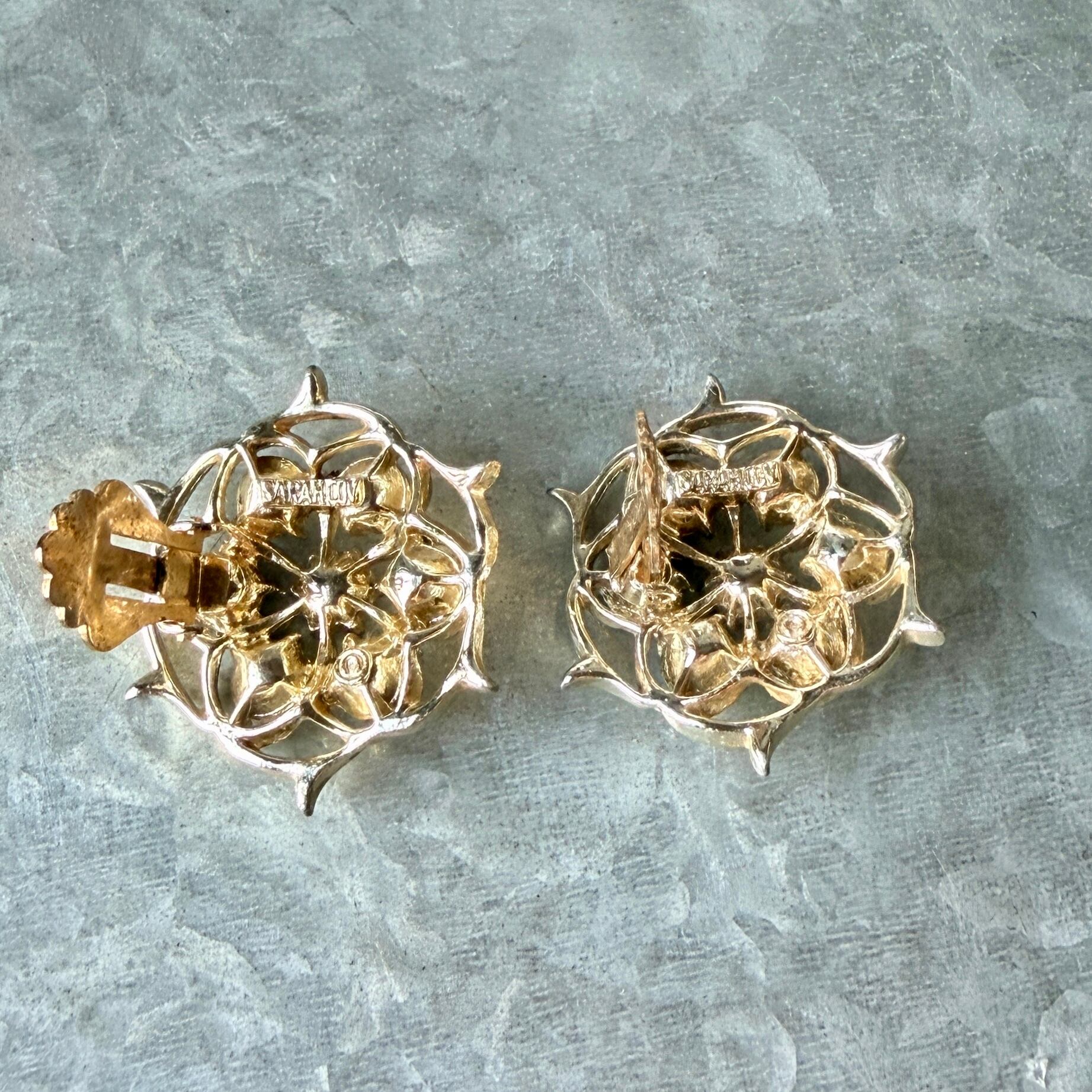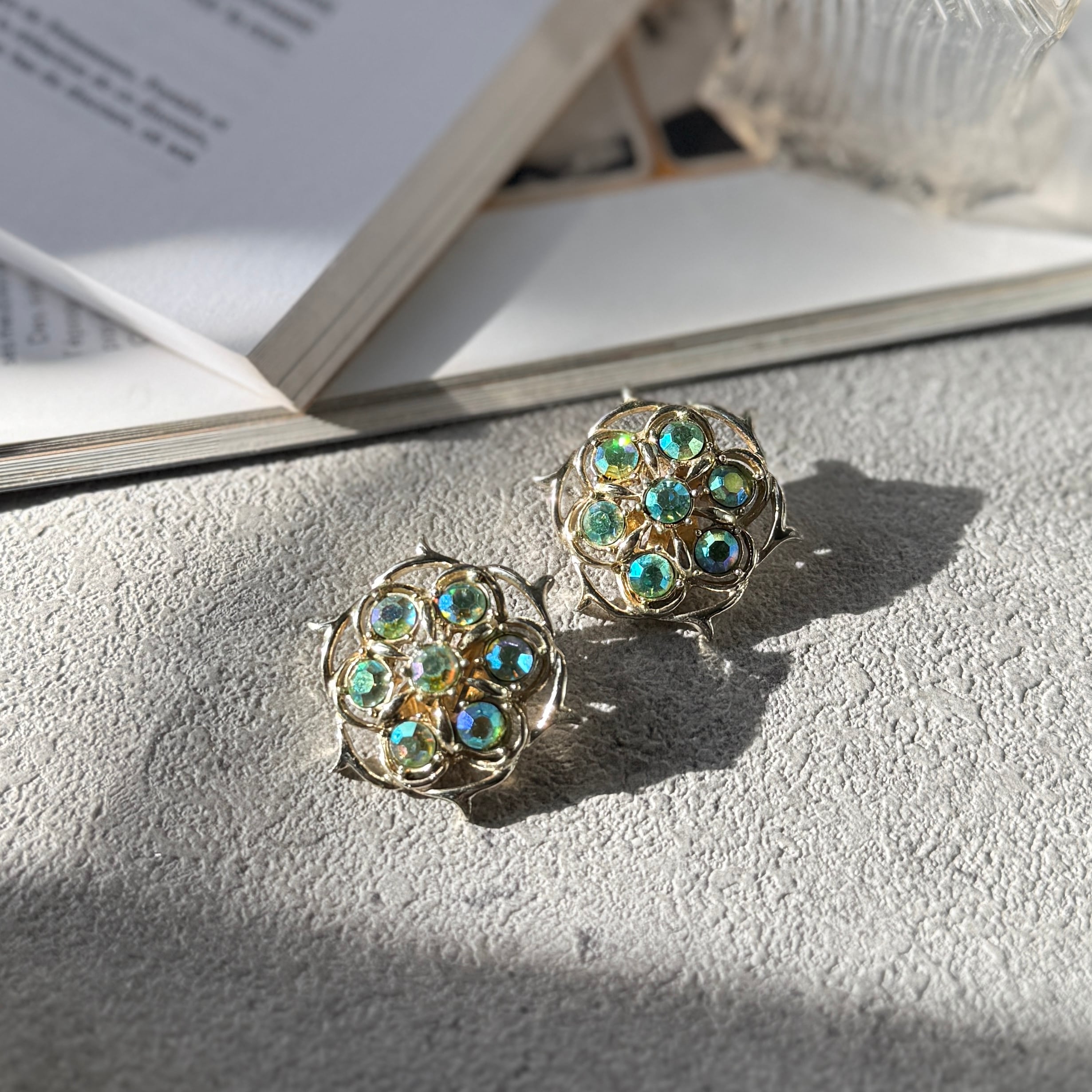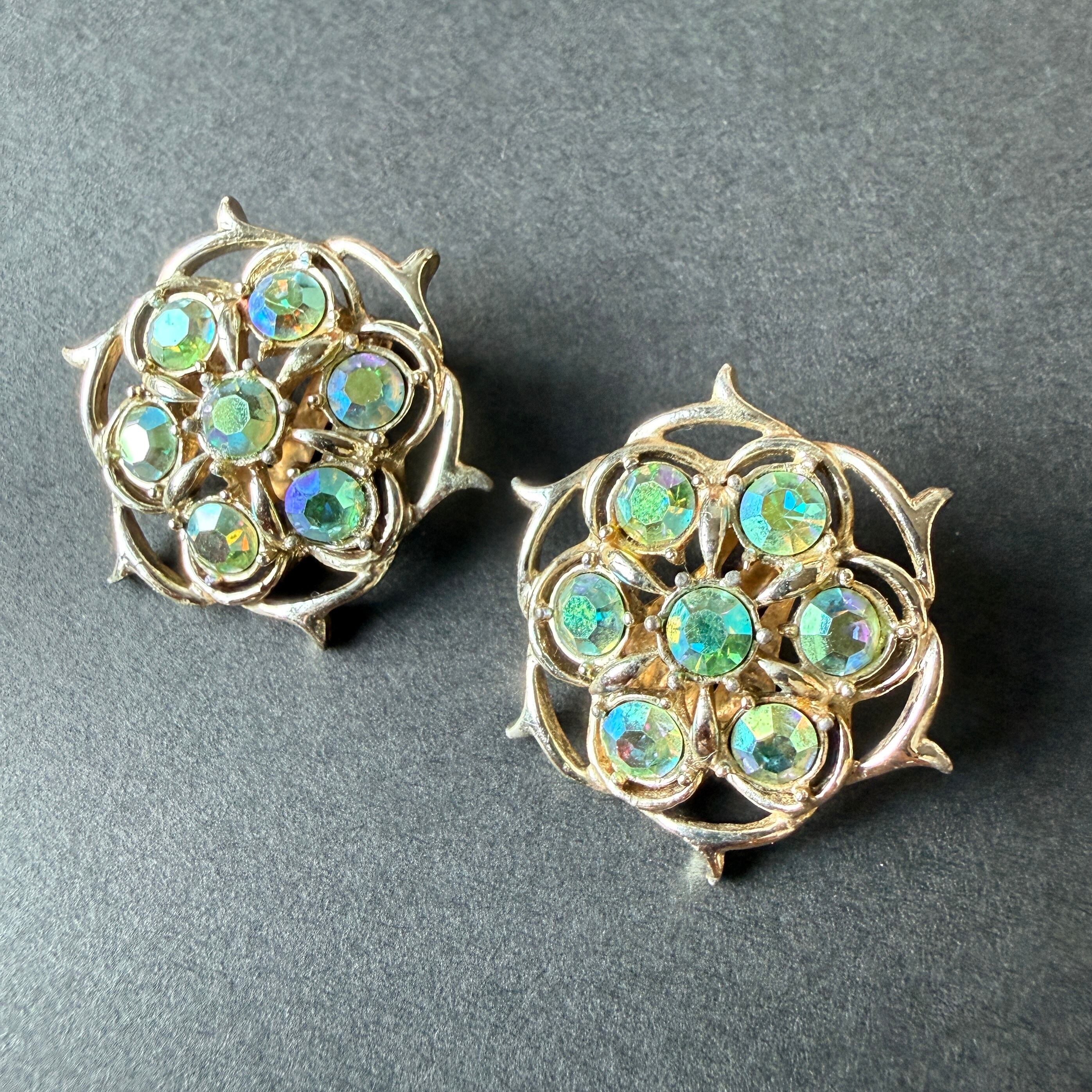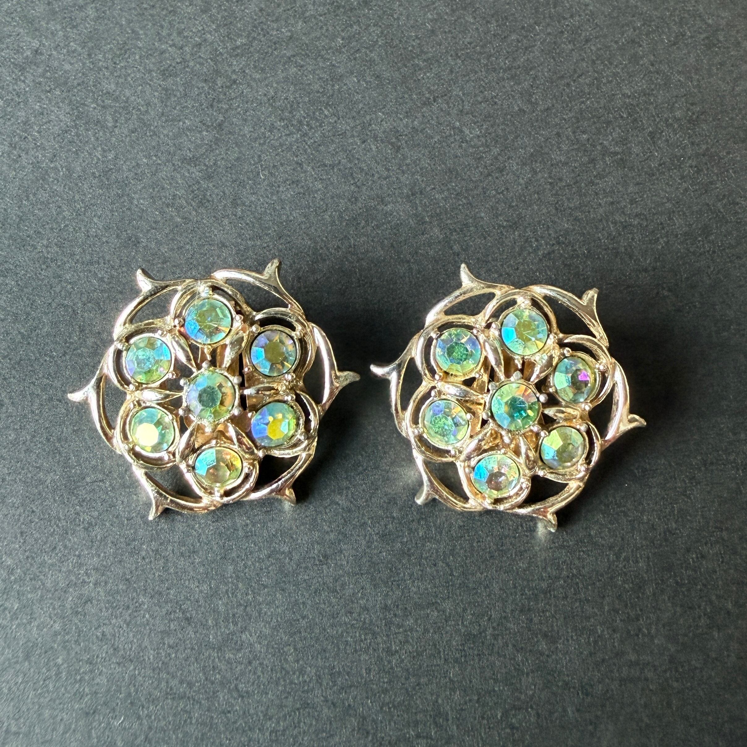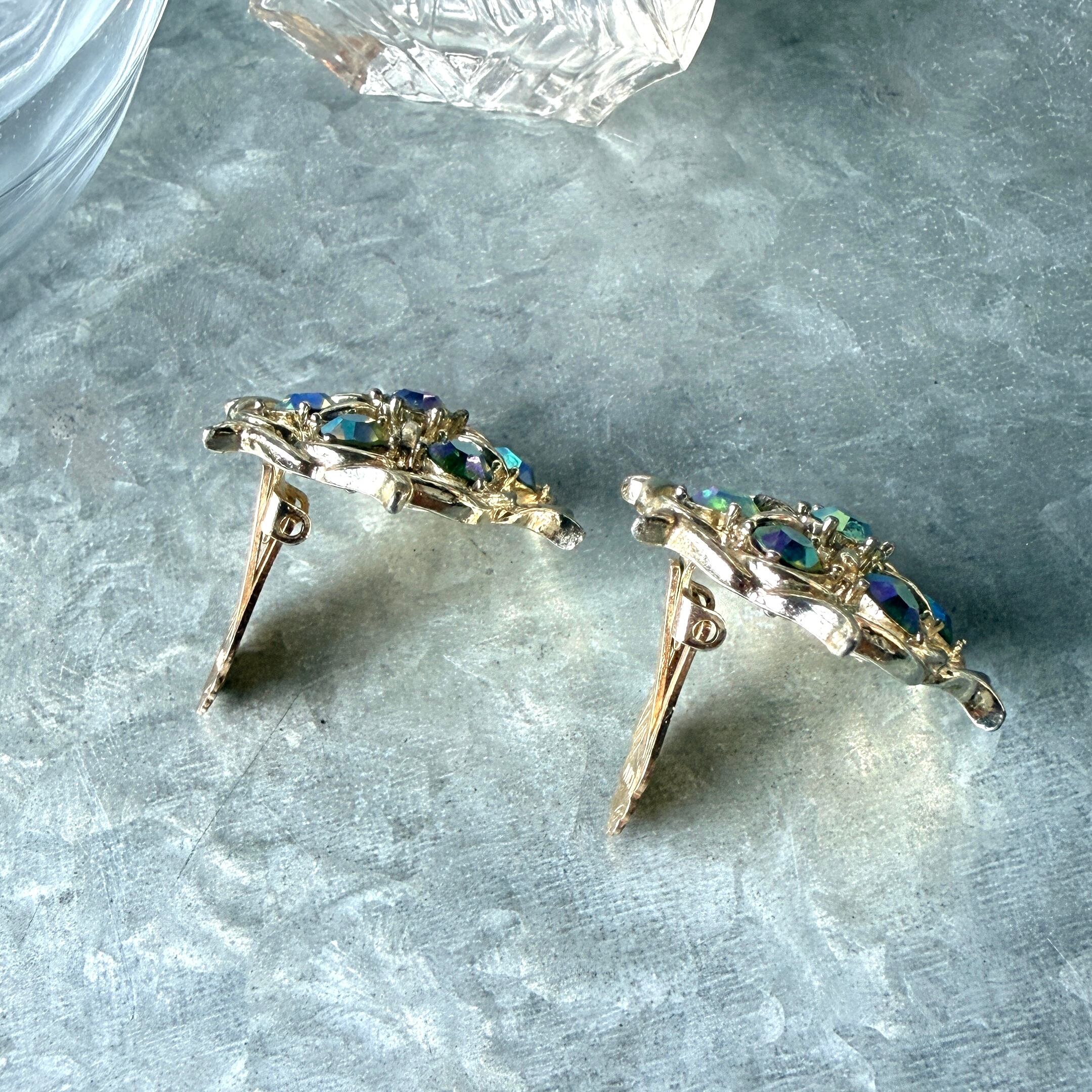YS101-【 Sarah Coventry 】サラコベントリー・ヴィンテージイヤリング 1960's "LIME LIGHT" Aurora Rhinestone Gold Tone Floral Clip-On Earrings | eslup_boutique