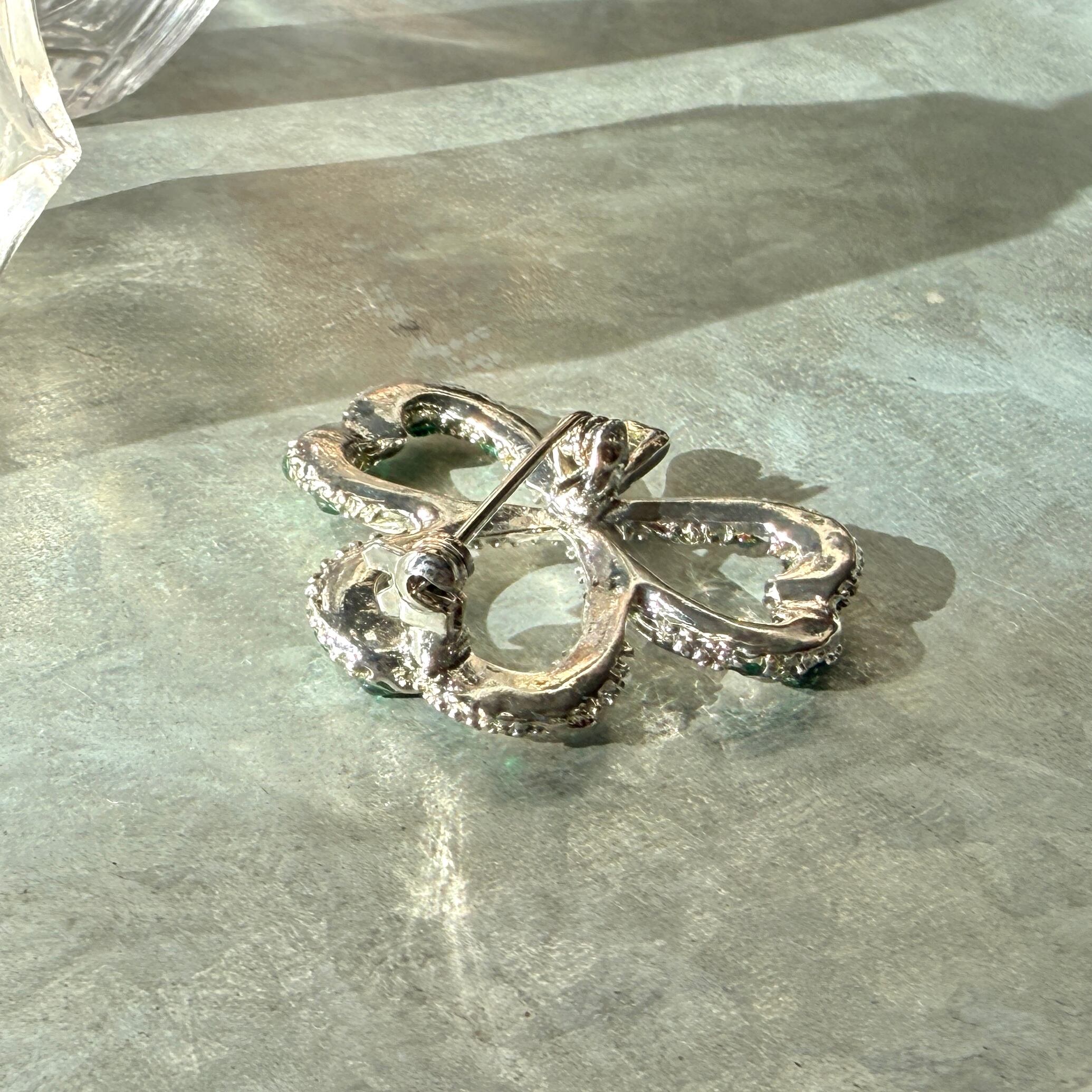 SC147-ヴィンテージブローチ U.S.A. 1960〜70's Silver Tone Emerald Green Rhinestone Ribbon Style Shamrock Brooch | eslup_boutique
