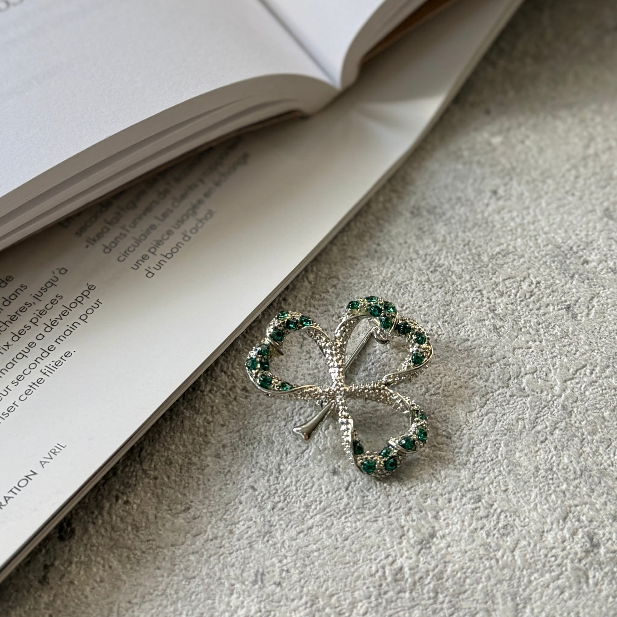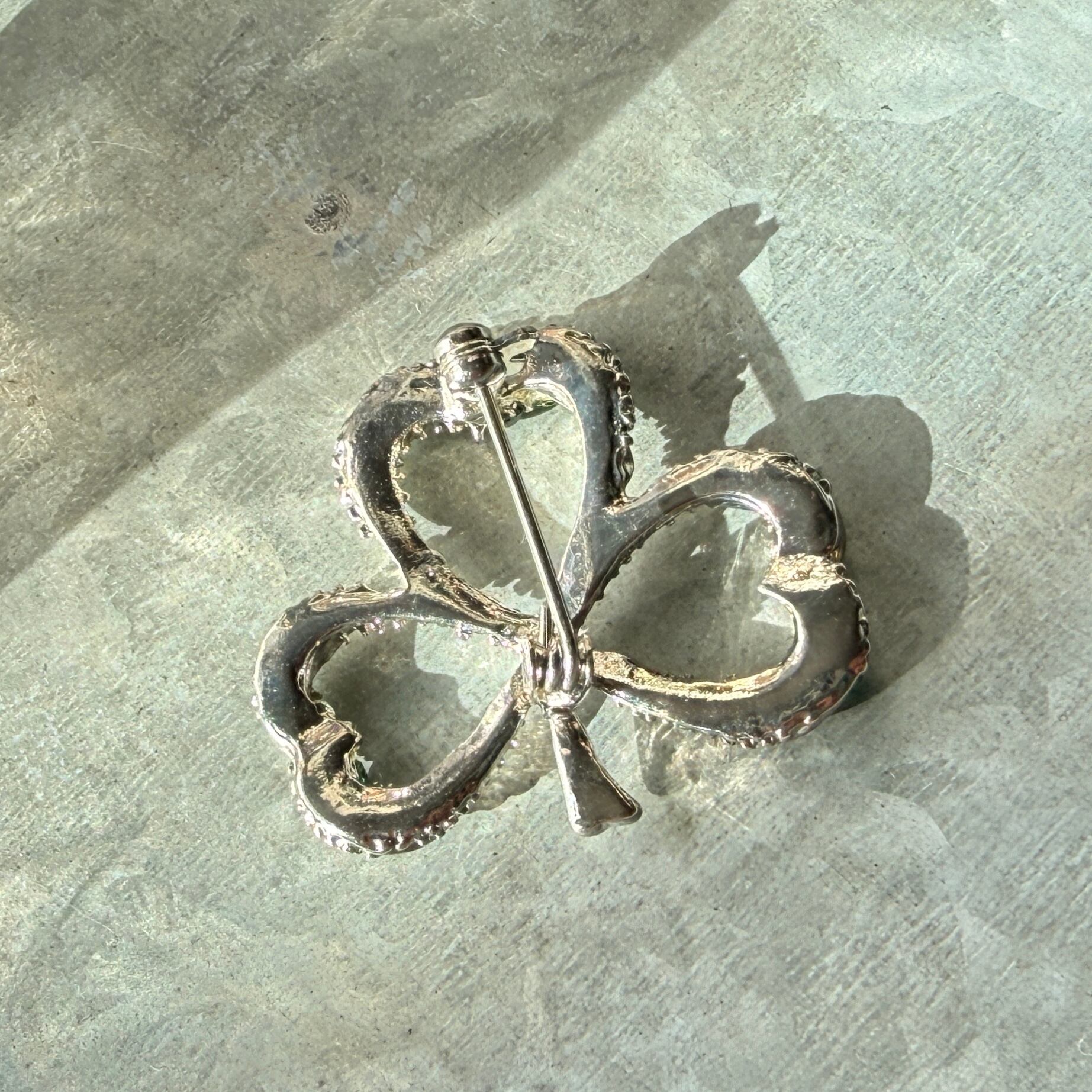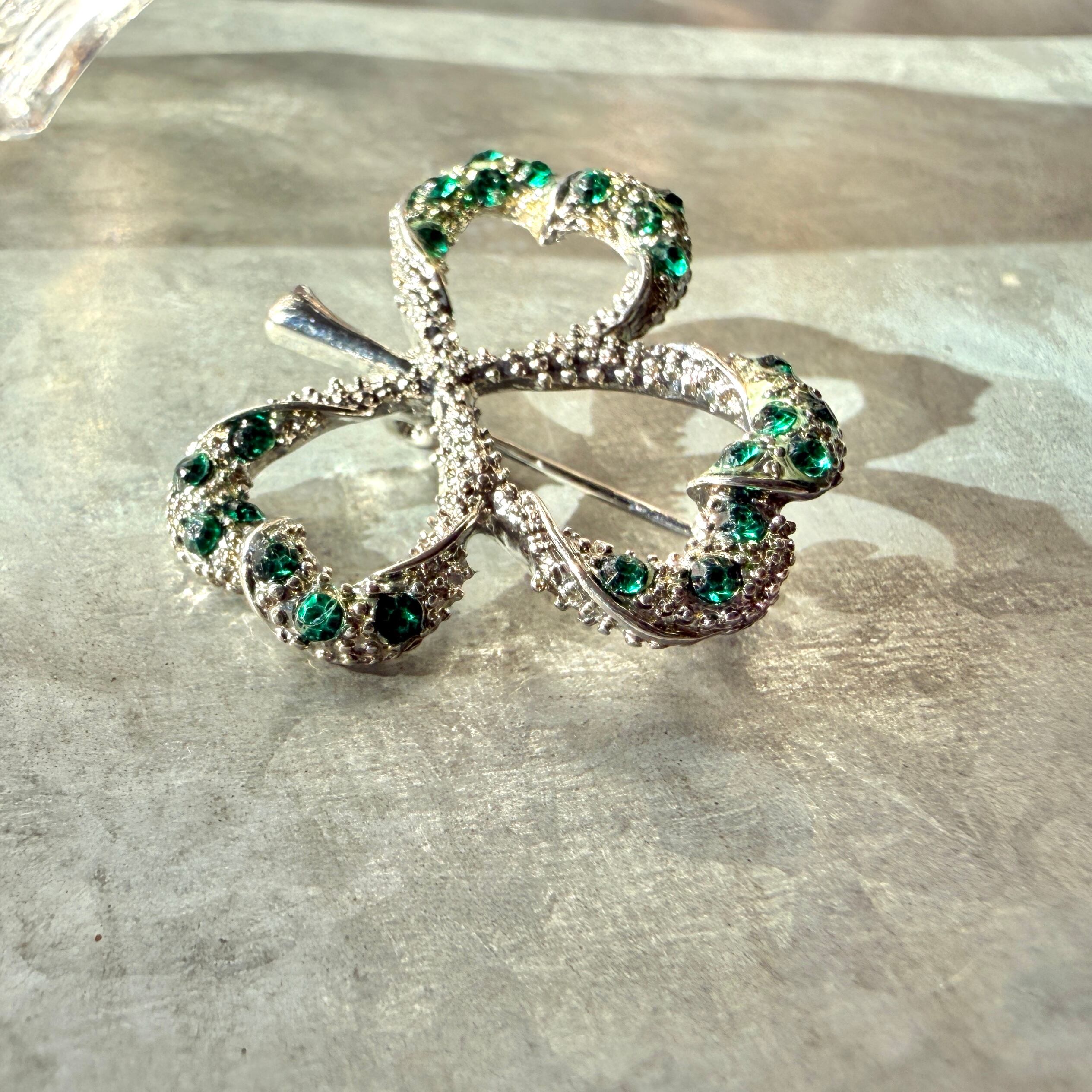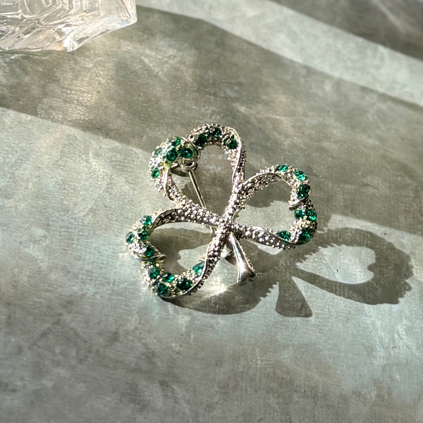 シルバートーンのエメラルドグリーンラインストーンが煌めくシャムロックブローチ。