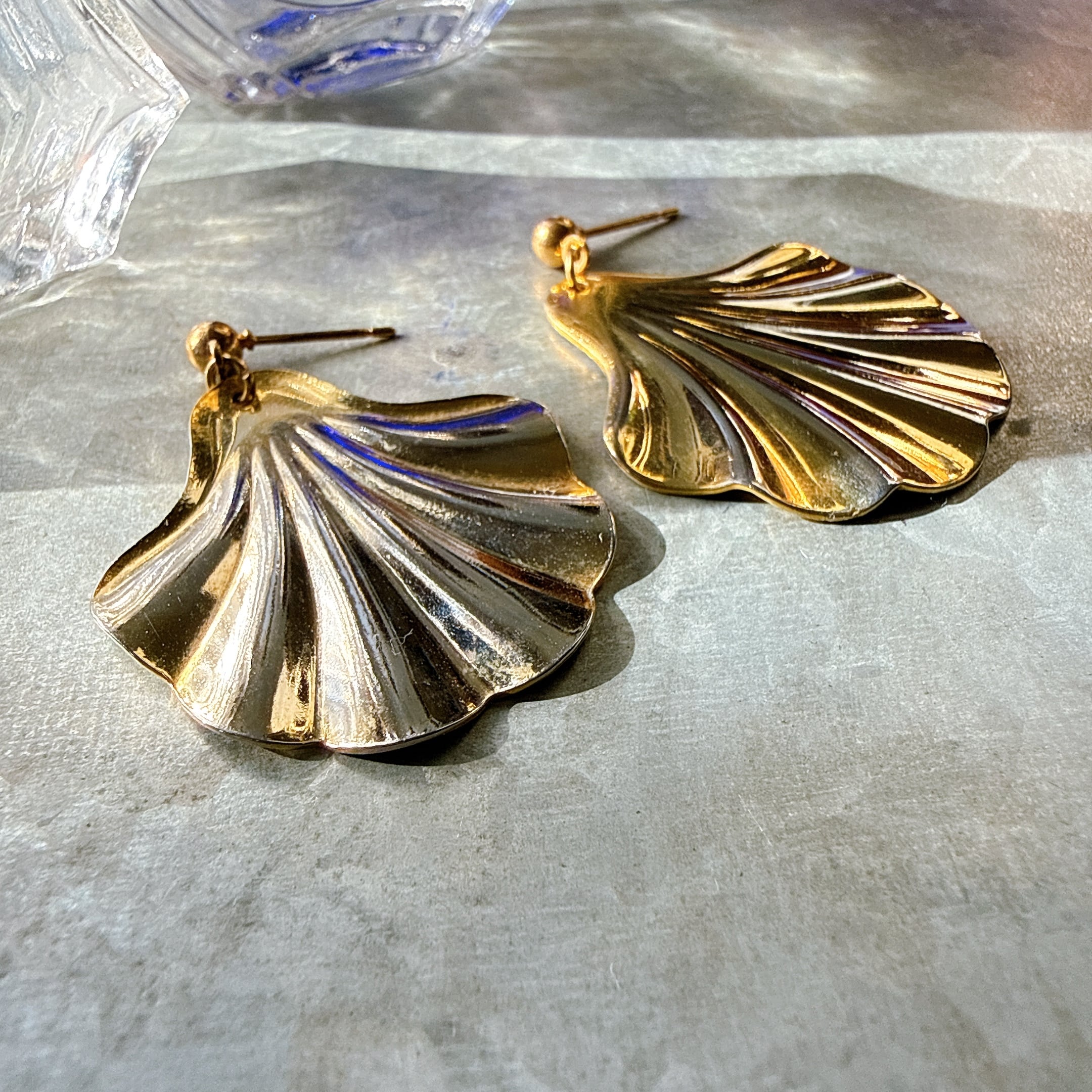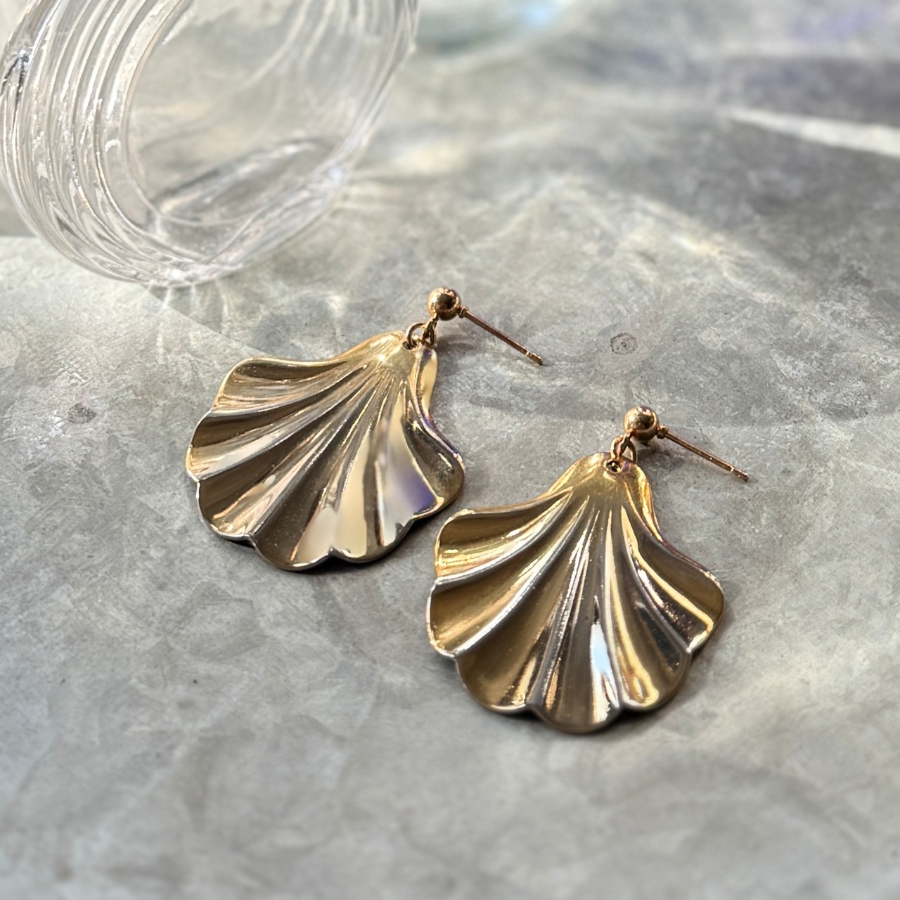 P742-ヴィンテージピアス U.S.A. 1980〜90's Polished Gold Tone Seashell Plate Hanging Stud Earrings | eslup_boutique