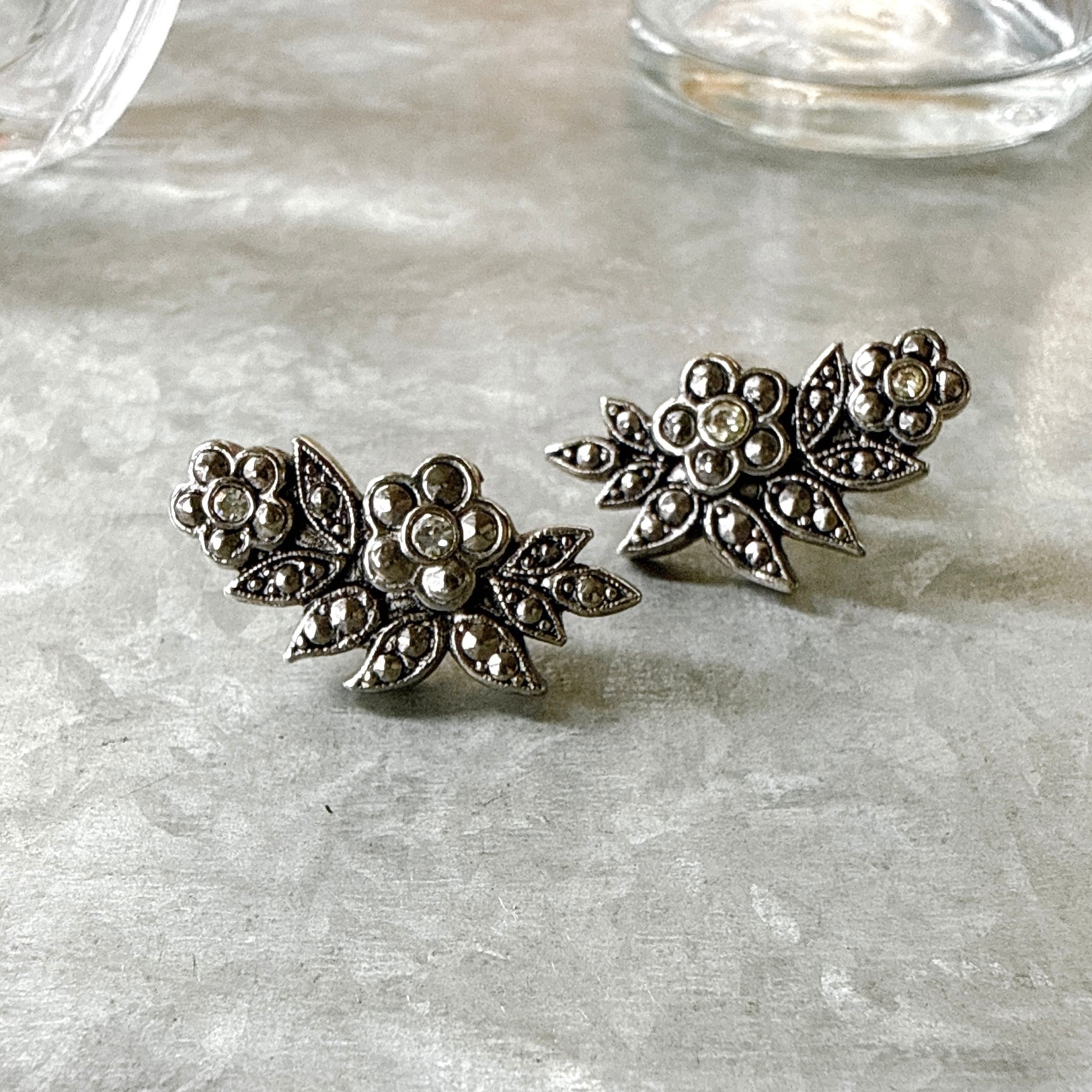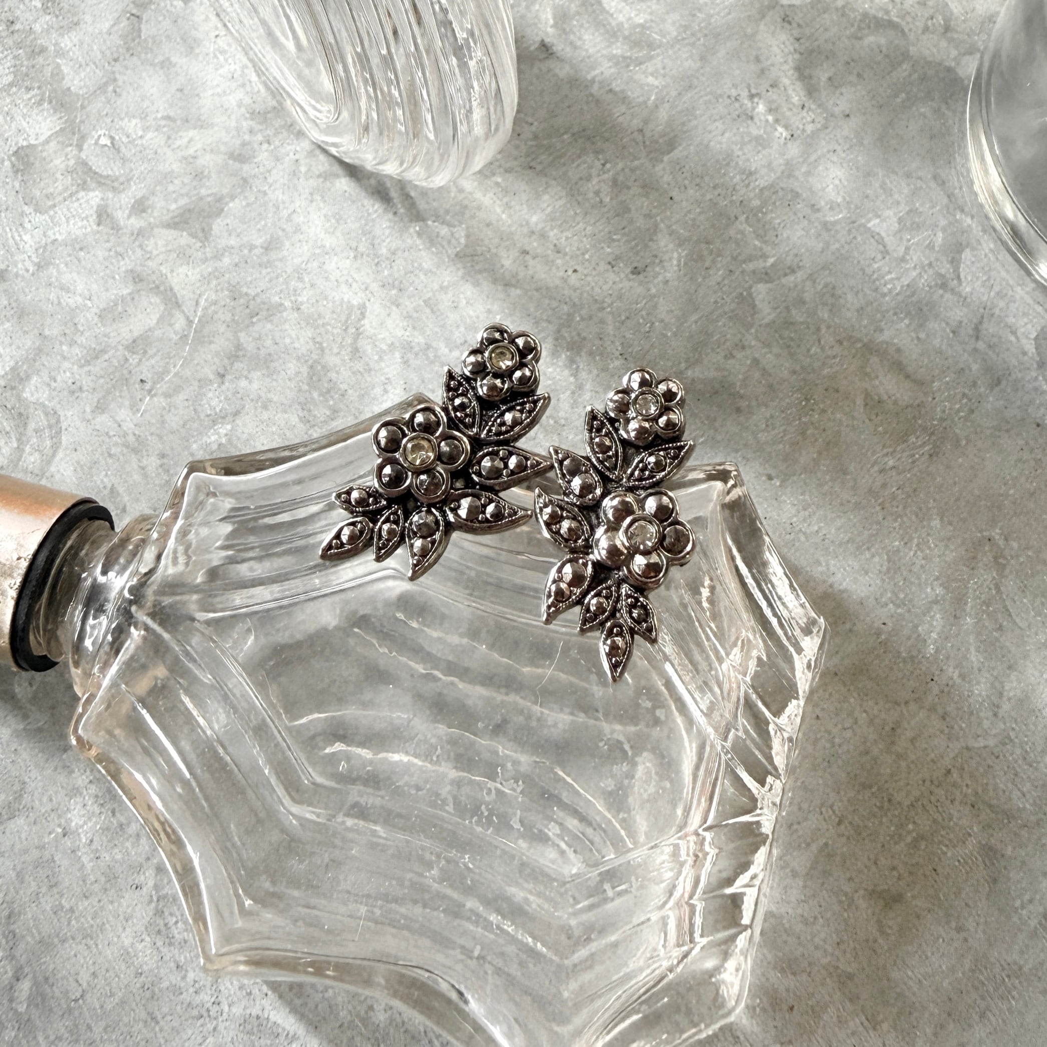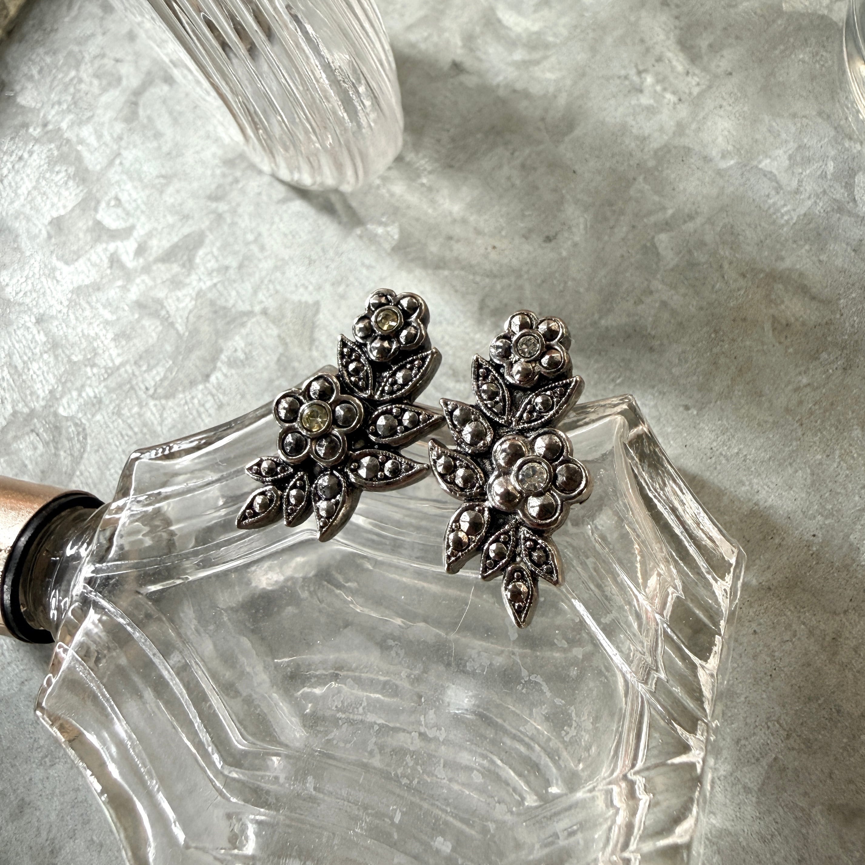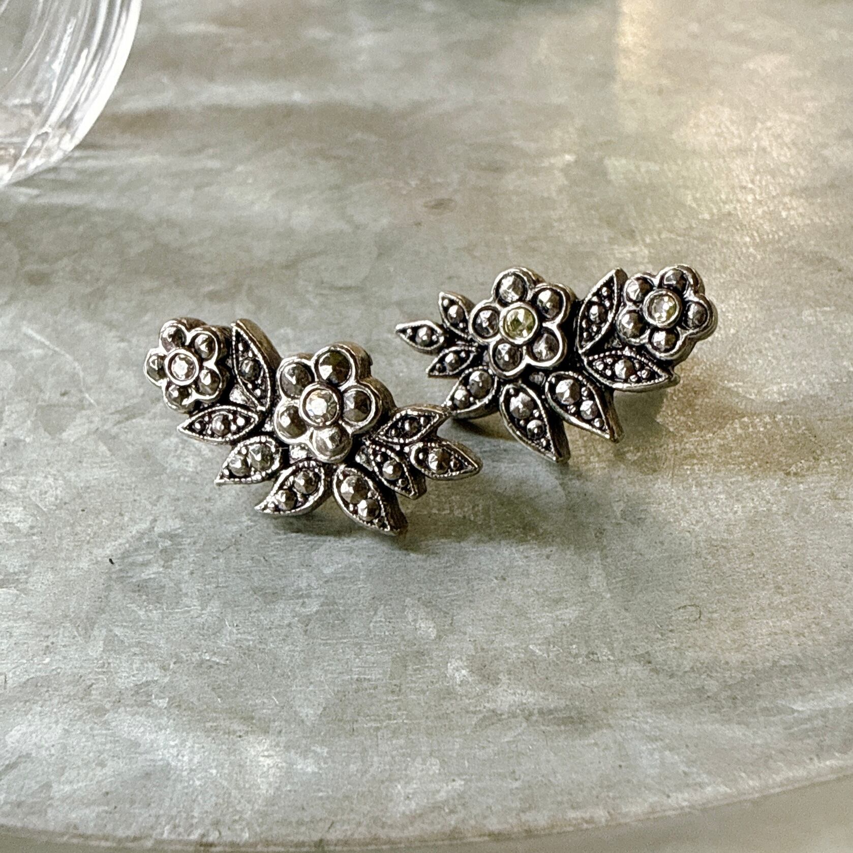 PA462-【 AVON 】エイボン・ヴィンテージピアス 1988 "Empire" Faux Marcasite Flower Silver Tone Pierced Earrings | eslup_boutique