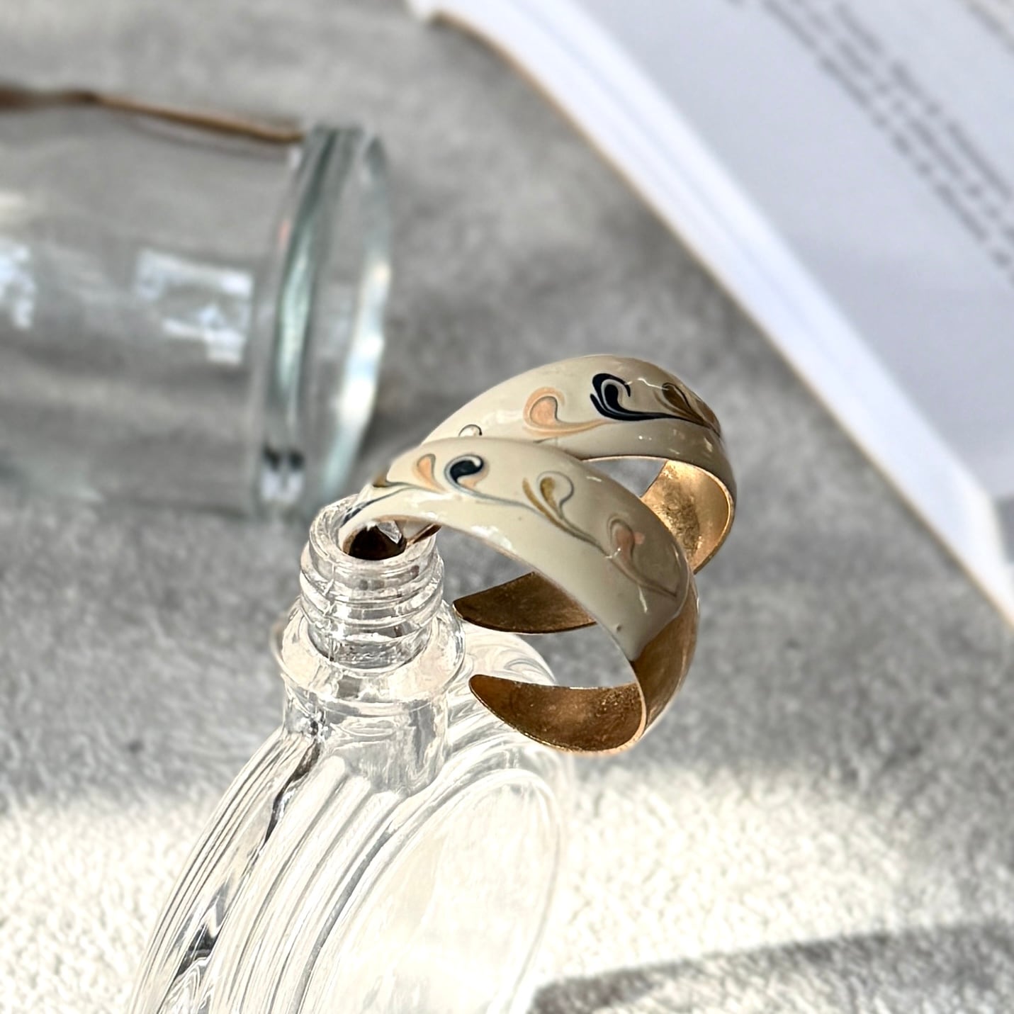 アイボリーエナメルペイントにハンドペイントのようなスクロール文様が描かれたゴールドトーンフープピアス。