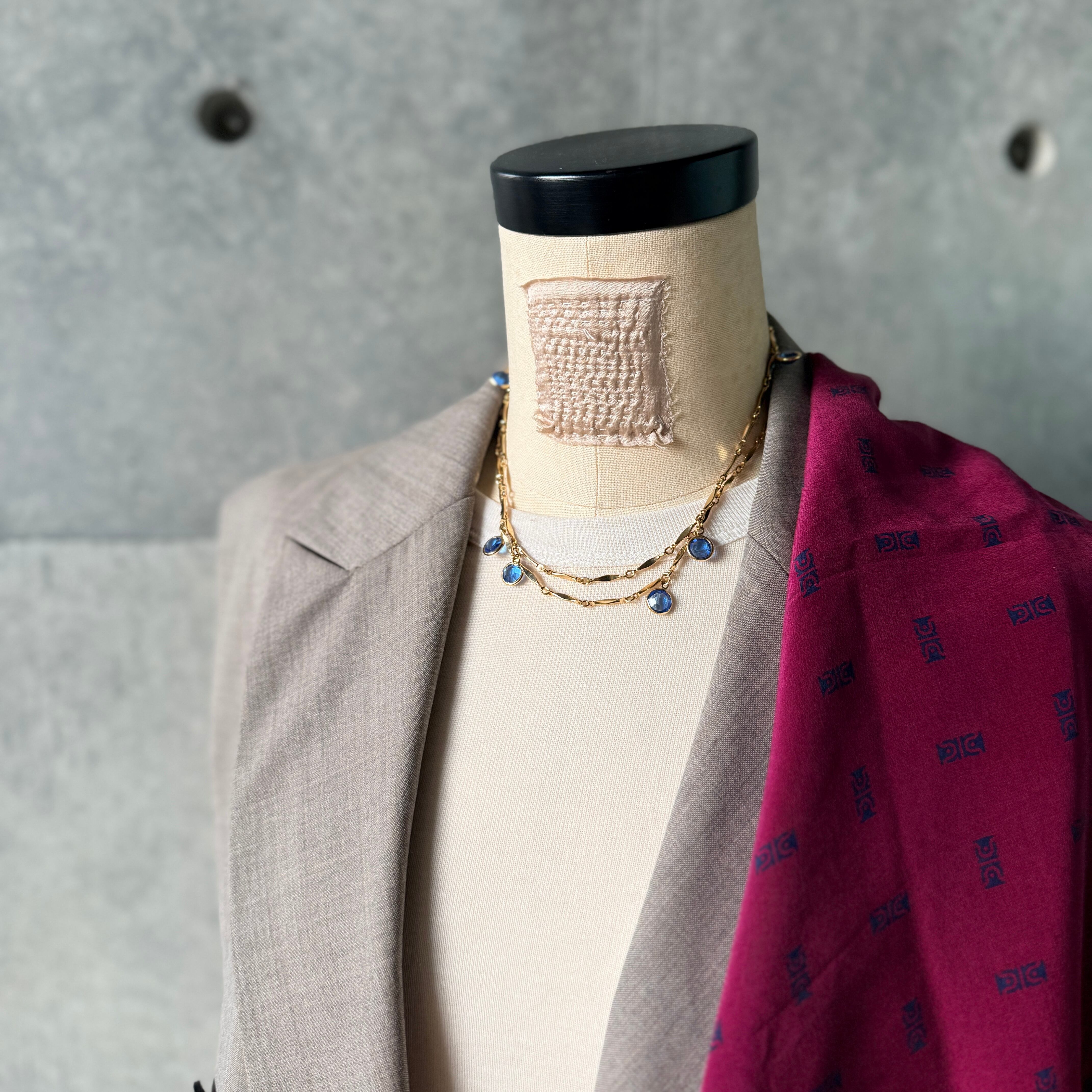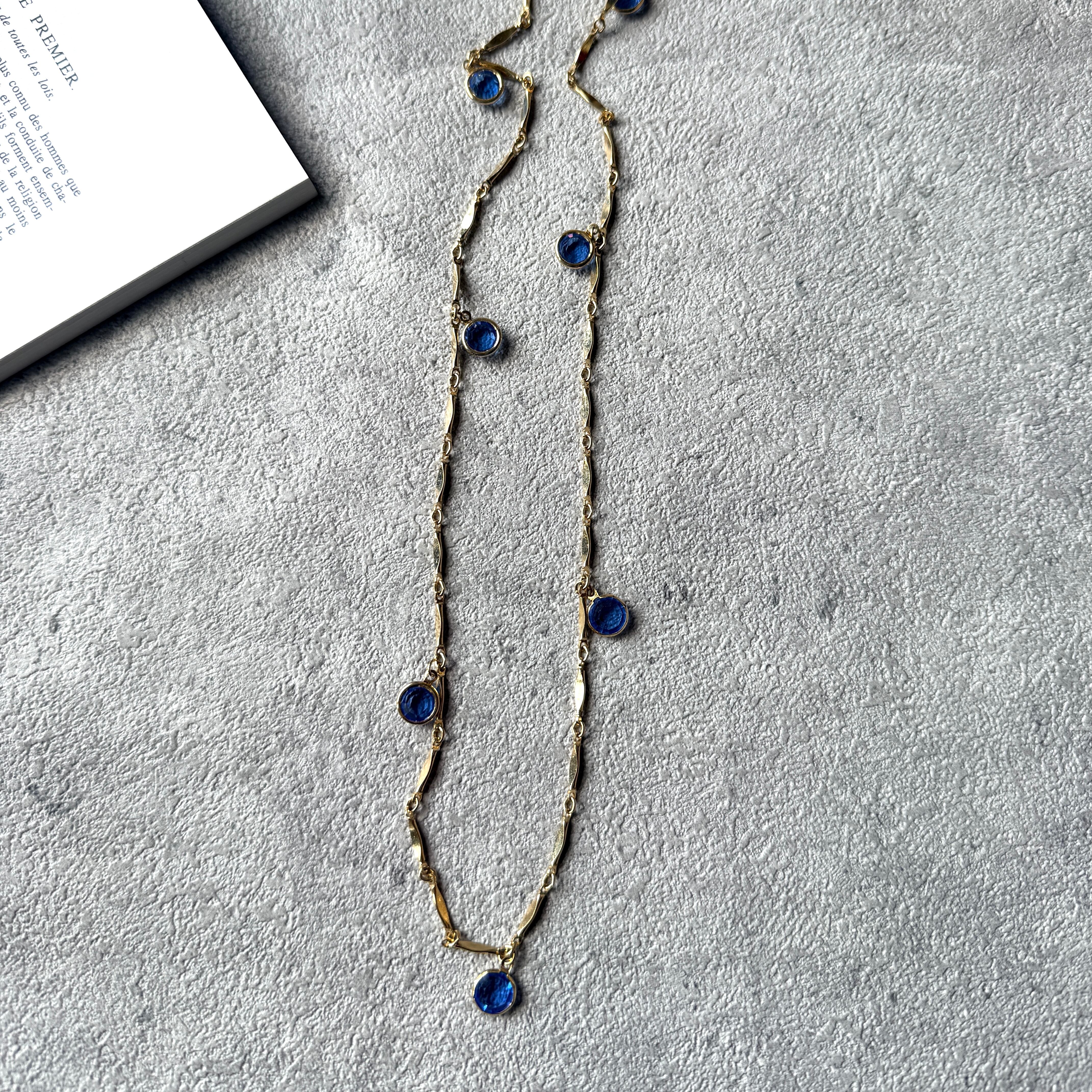 ゴールドトーンのフラットなリンクチェーンに、ベゼルセッティングされたブルーグラスパーツが美しいアクセントを残すステーション・ネックレス。