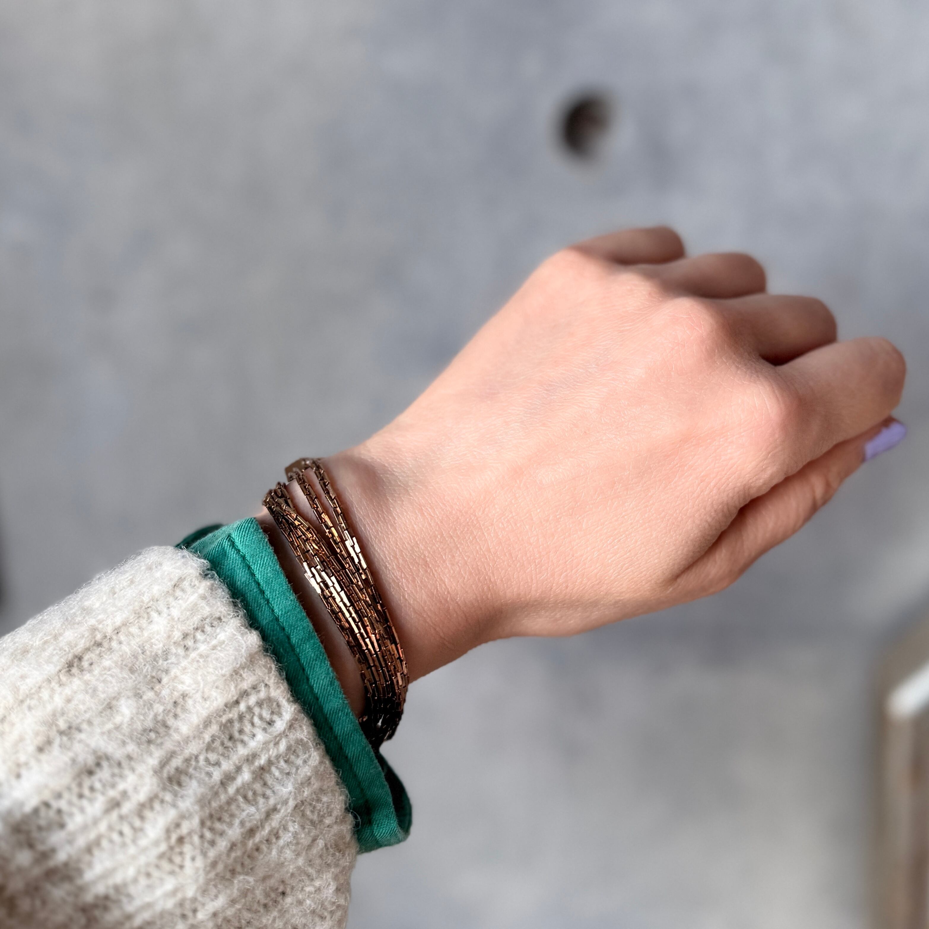 2連で巻いて、ショートネックレスとして、また、手首に巻いてブレスレットとしても魅力を発揮します。