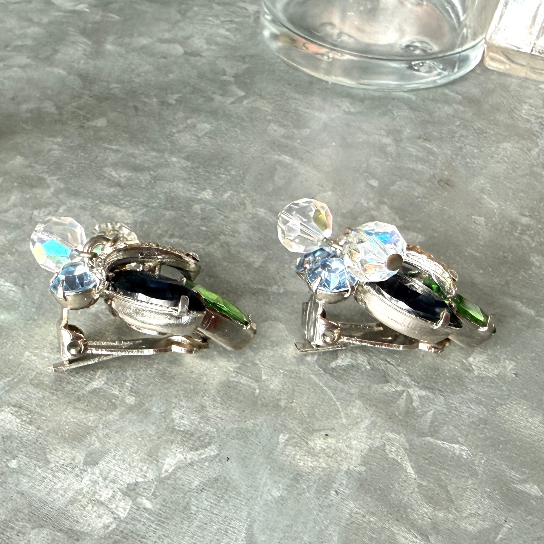 YK2-【 KRAMER 】クレイマー・ヴィンテージイヤリング 1950〜60's Emerald Green Sapphire Blue Marquise Cut Stone and Aurora Borealis Bead Clip-On Earrings