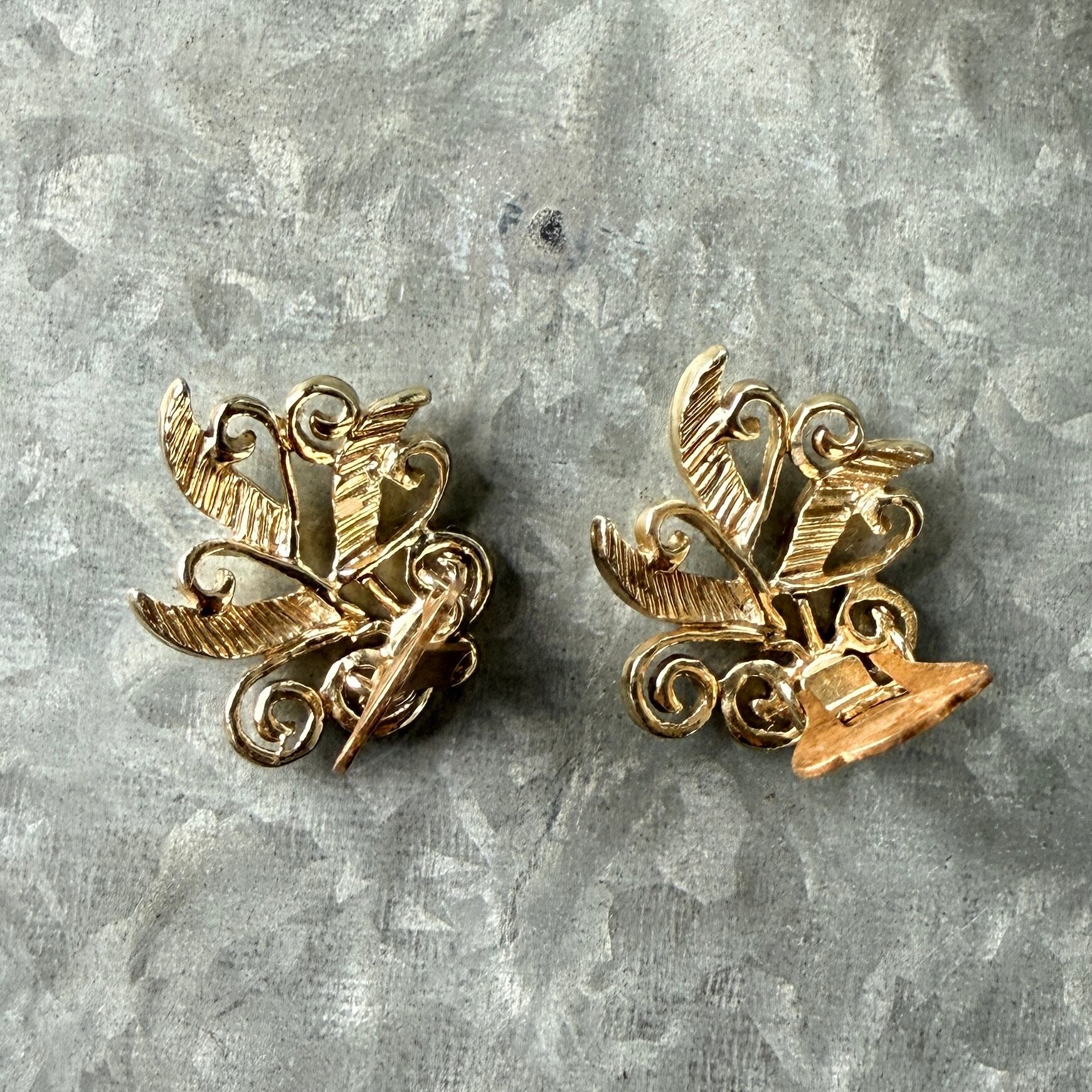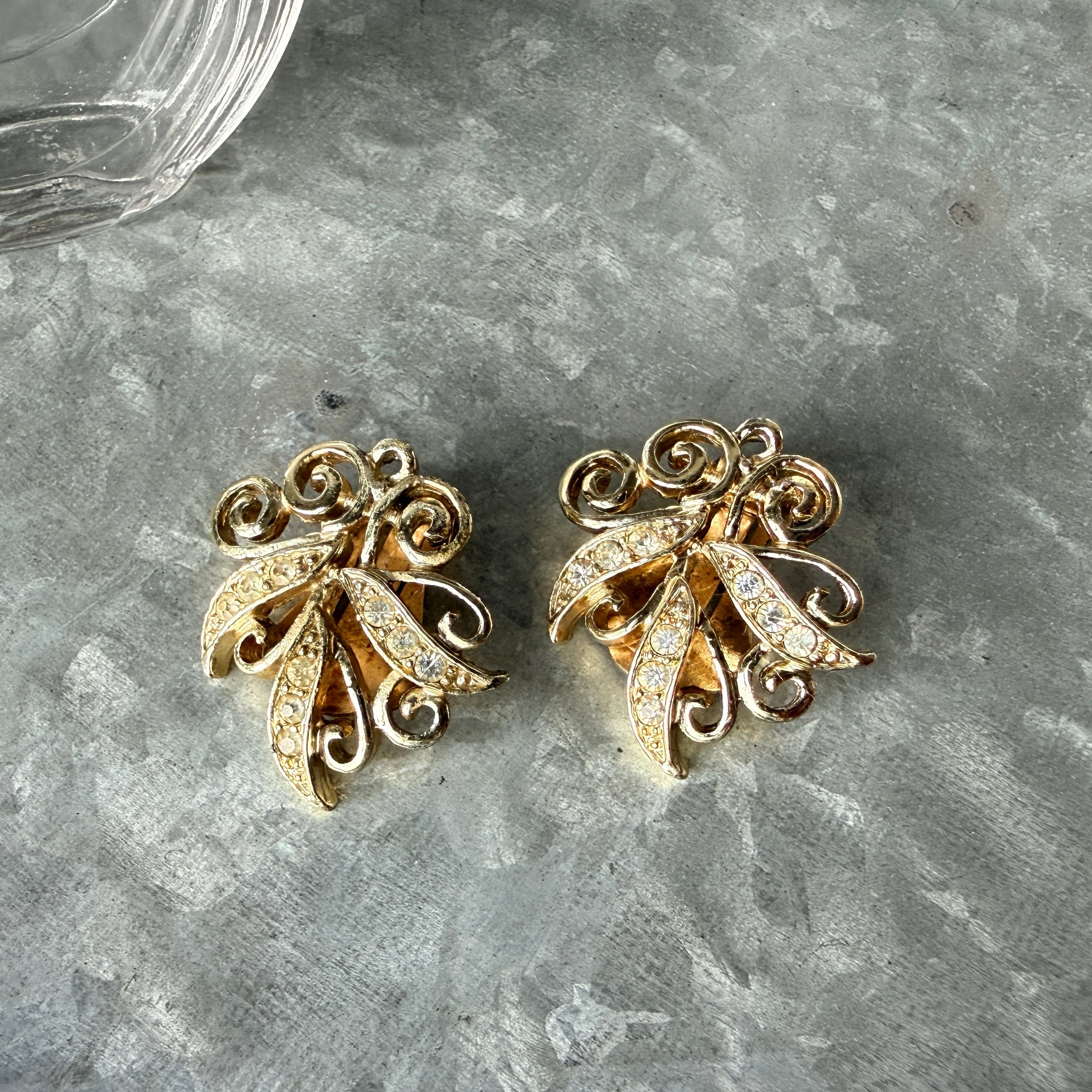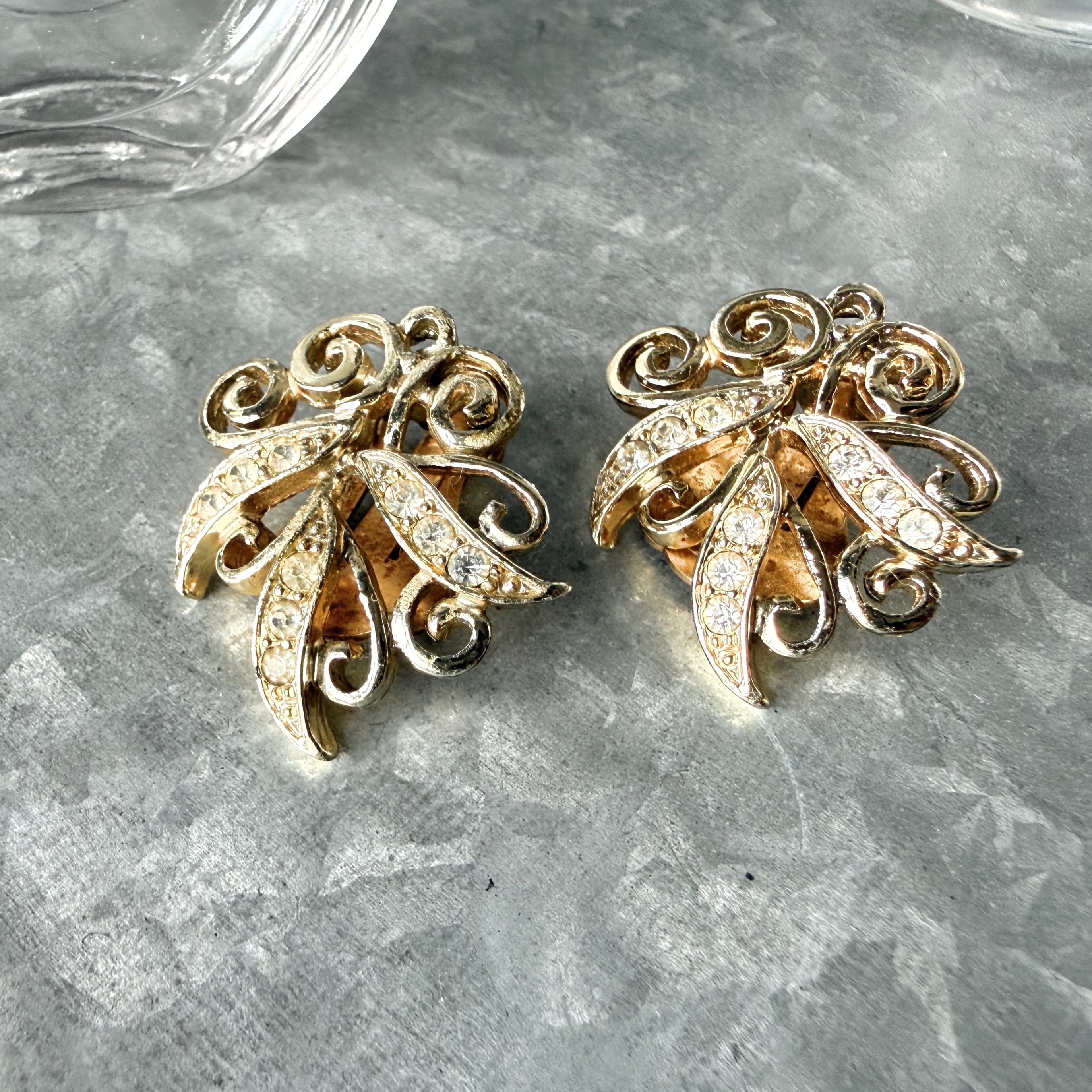 Y1221-ヴィンテージイヤリング U.S.A. 1950〜60's Gold Tone Rhinestone Swirl Mid-Century Clip-On Earrings
