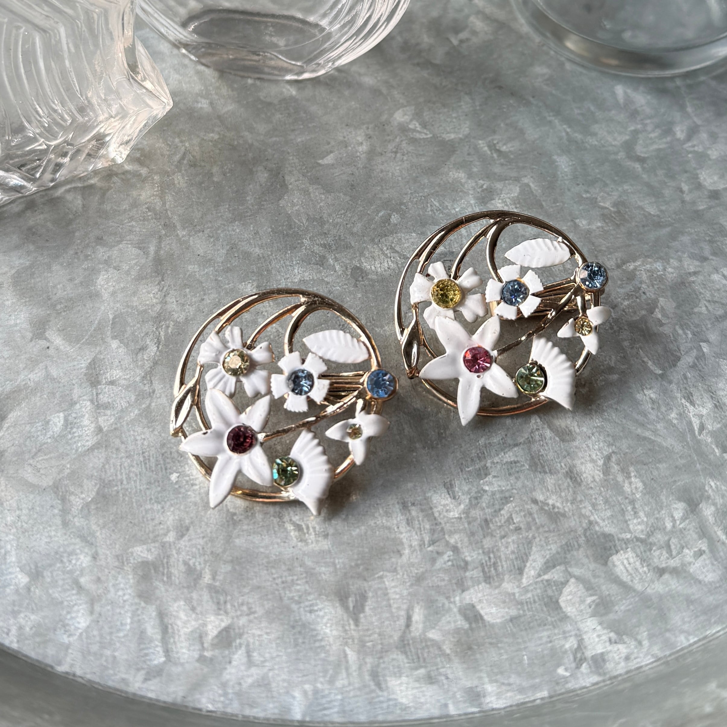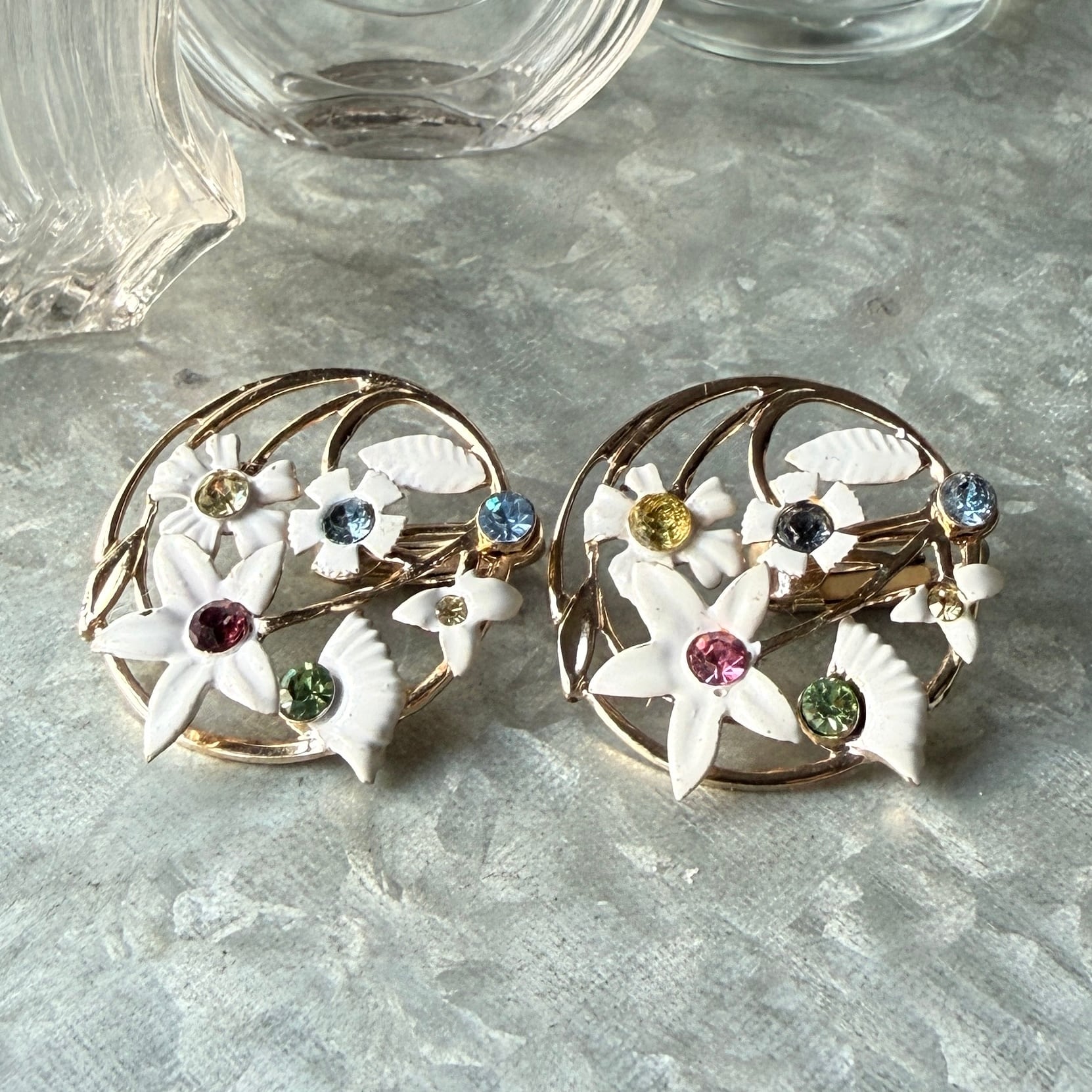 YS103-【 Sarah Coventry 】サラコベントリー・ヴィンテージイヤリング 1956 "SUMMER FROST" White Enamel Paint Rhinestone Gold Tone Floral Clip-On Earrings