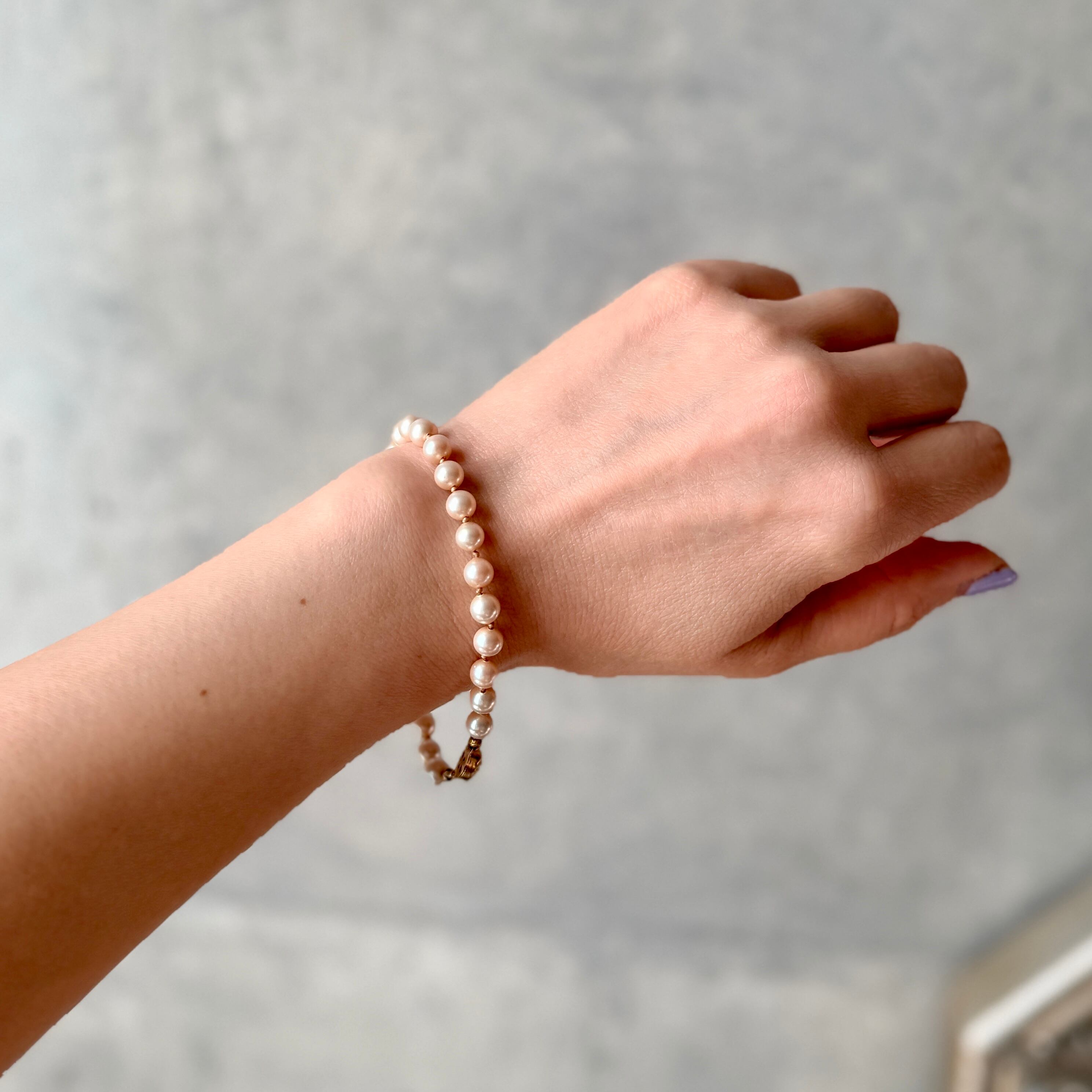 程よい粒の大きさのあるパールで、素肌にはもちろん、薄手のニットやカットソー、ブラウスなどの袖口に合わせて、エレガントに映えます。