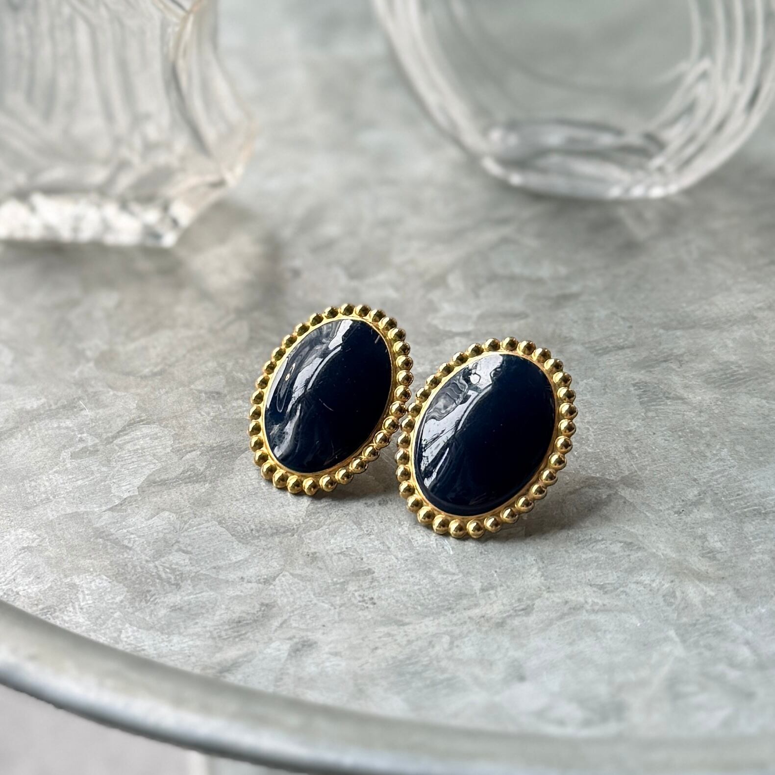 P756-ヴィンテージピアス U.S.A. 1980-90's Navy Enamel Oval Gold Tone Pierced Earrings