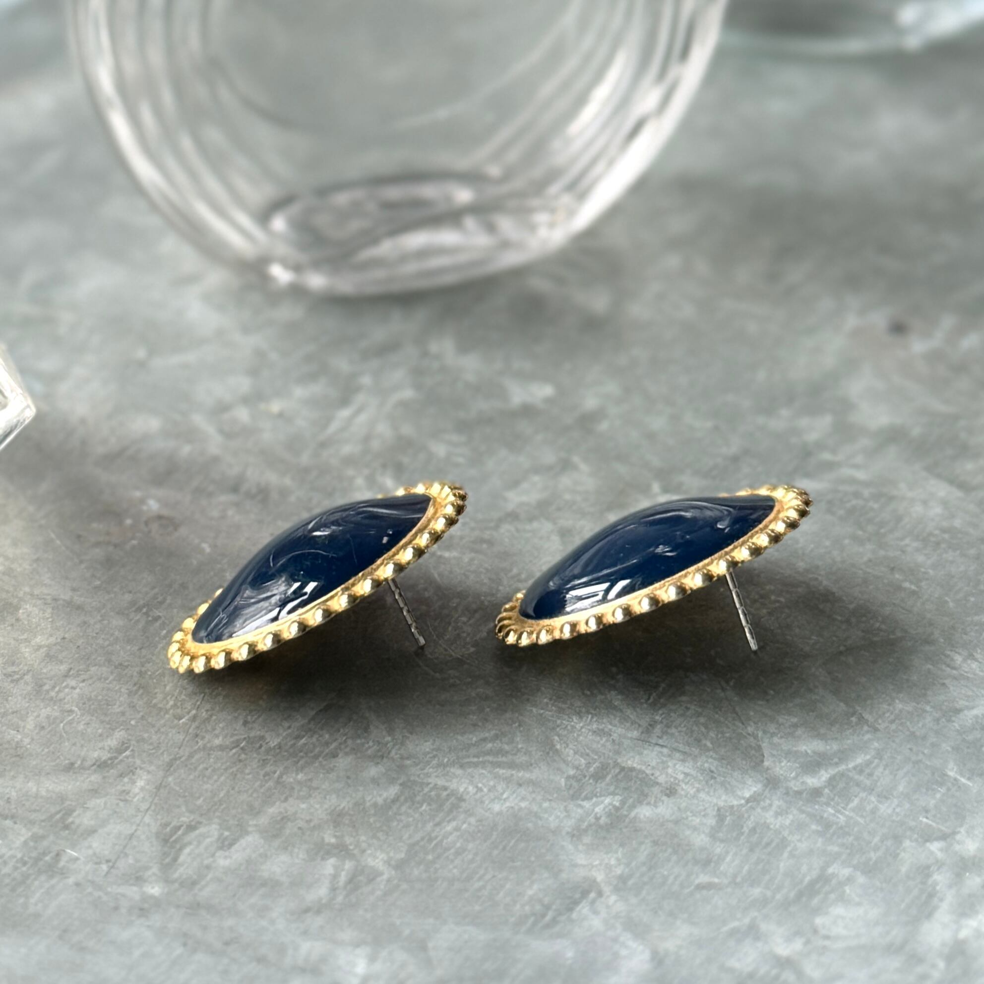 ネイビーのエナメルペイントとゴールドトーンのオーバル型ピアス。