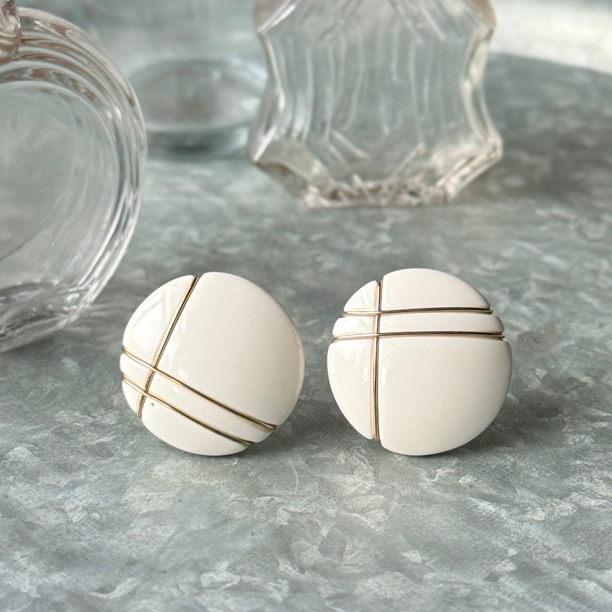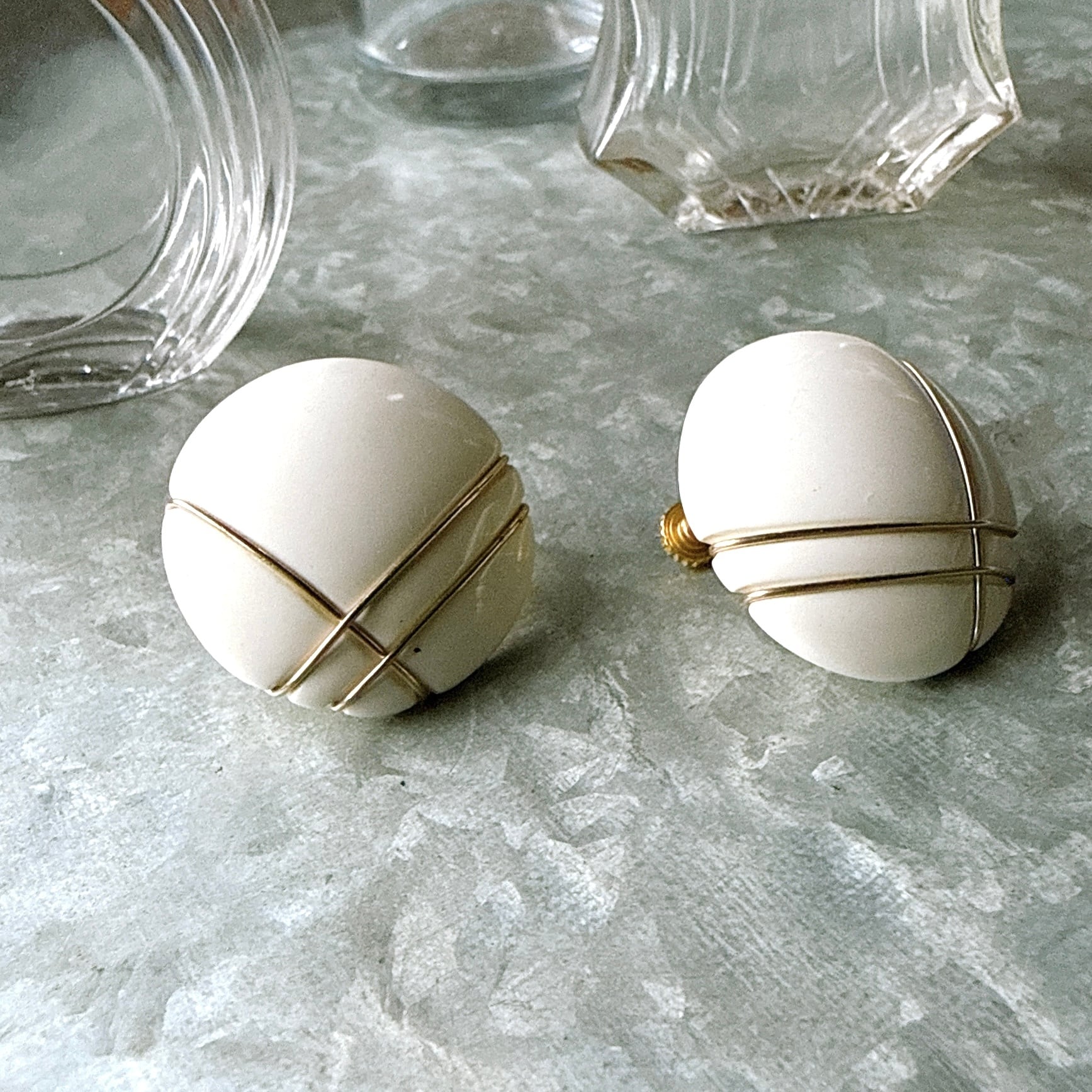 YN49-【 Napier 】ネイピア・ヴィンテージイヤリング 1950-60's White Acrylic Cabochon with Gold Wire Grid Design Earrings
