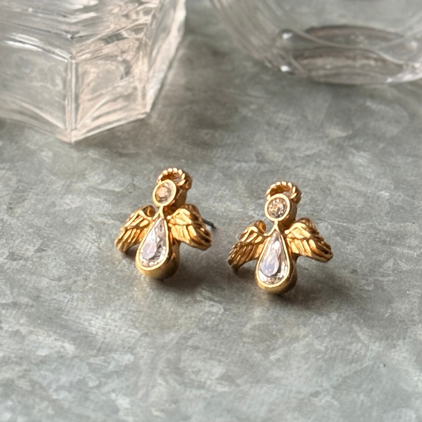 "Angelic Sparkle"とタイトルのついた、エンジェルをモチーフにしたゴールドトーンピアス。