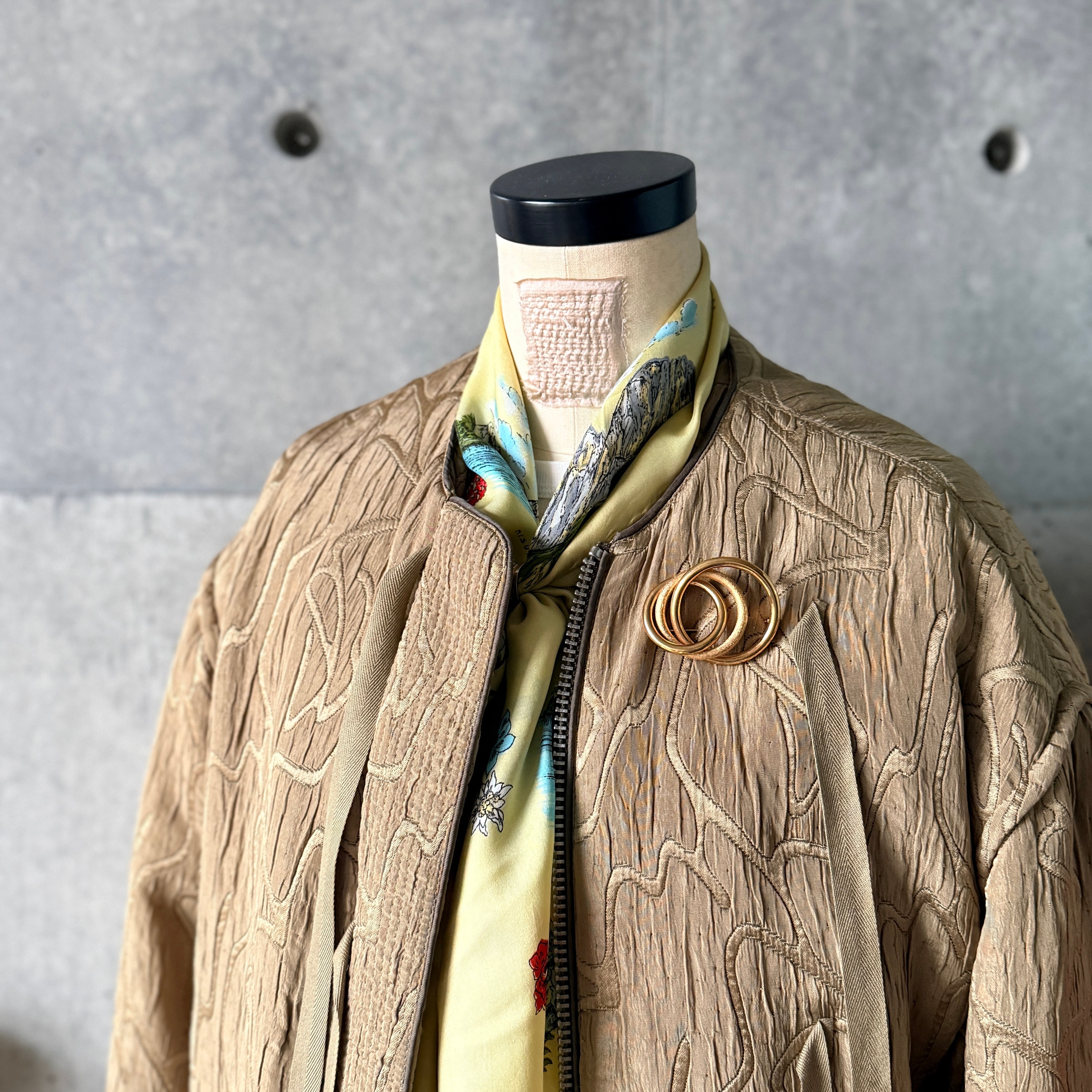 シンプルながら質感に変化をつけたゴールドトーンの幾何学デザインがミッドセンチュリーを象徴し、現代のファッションとの融合で品よく個性を放ちます。