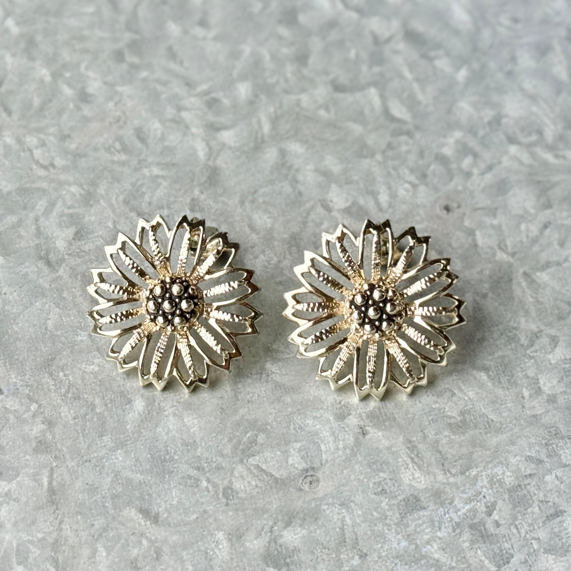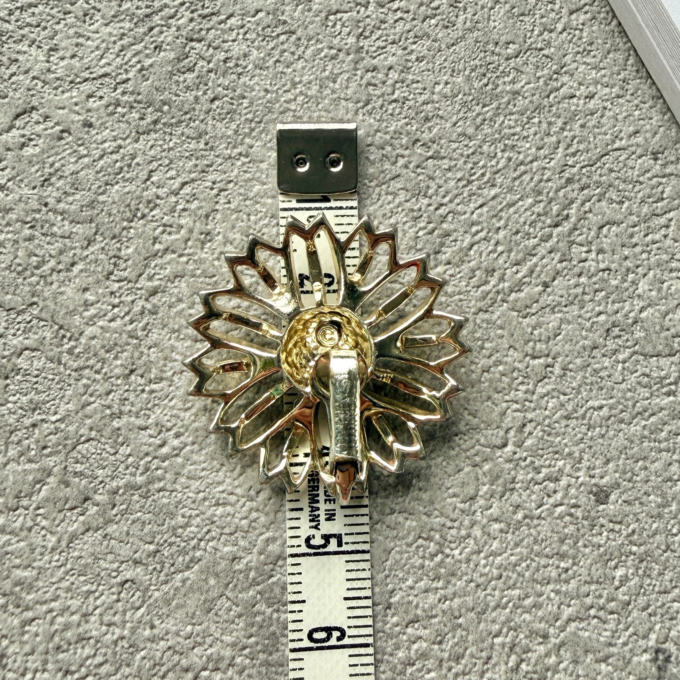 ひまわりやデイジーを想起させる繊細なオープンワークのペタルが特徴的なデザイン。中央の凹凸感のある立体的なテクスチャーがヴィンテージらしい重厚感を与えています。