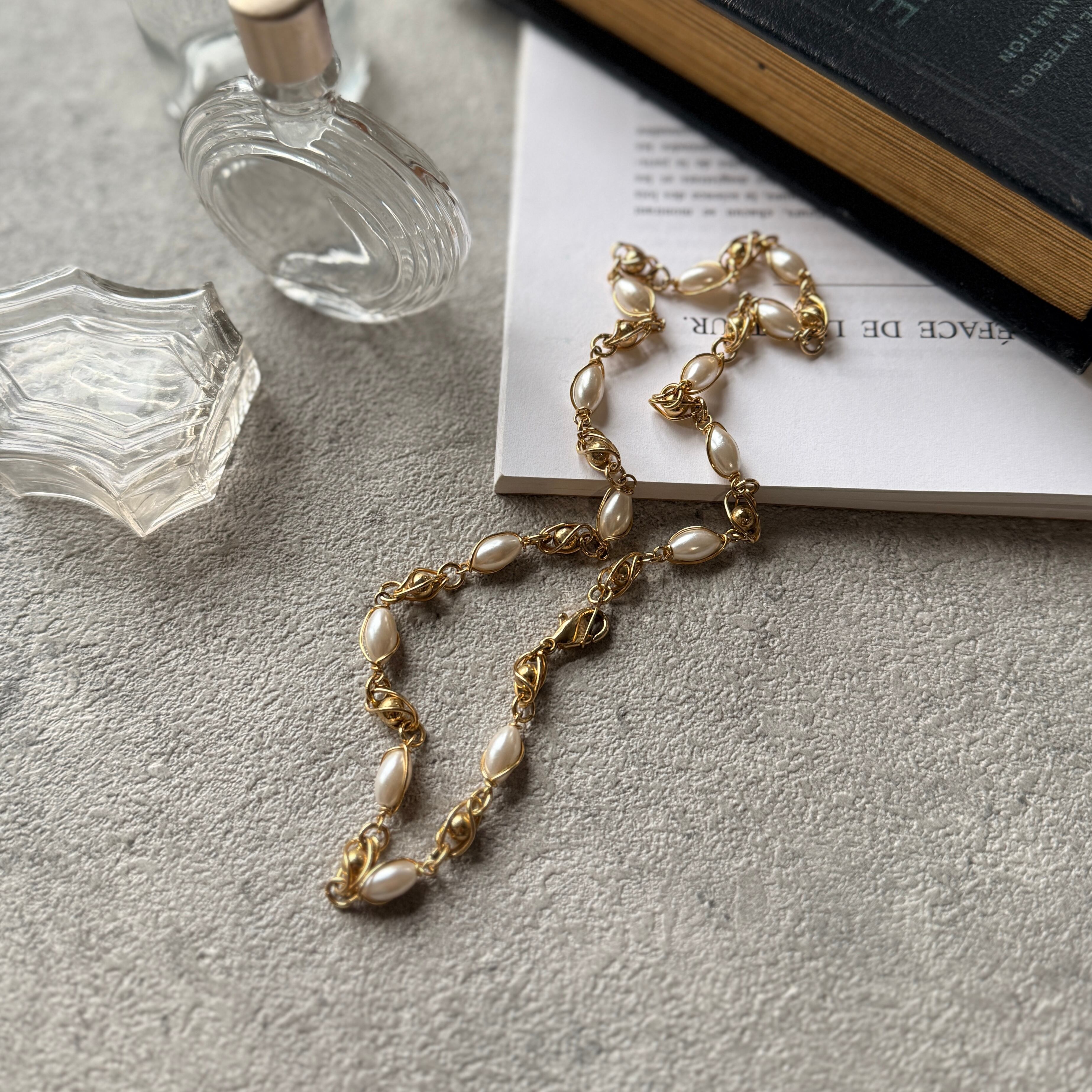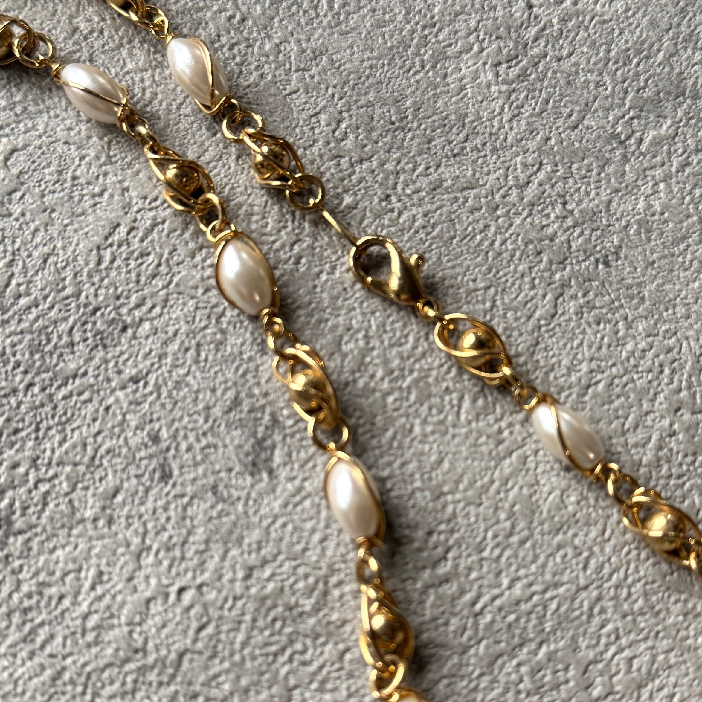 照りのあるシルキーなパールが上品なアクセントになりながら、程よく艶めくゴールドトーンビーズとチェーンの組み合わせデザイン。1980年代のクラシックでコンテンポラリーなムードがあり上品です。