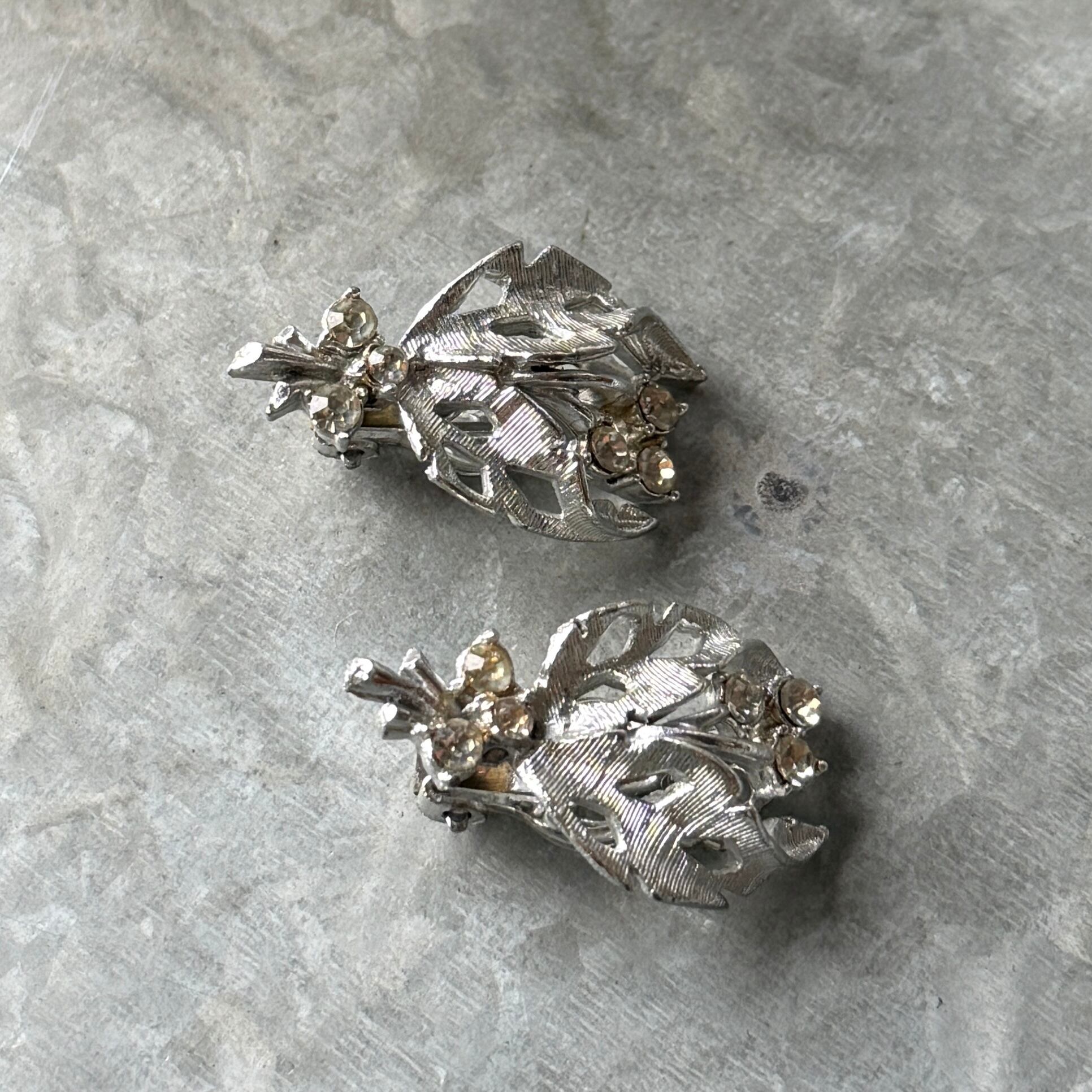 オープンワークになったリーフに、クリアなラインストーンが繊細に配置された上品なデザイン。メタルの表面には、この年代特有の繊細な筋目模様が施され、派手すぎない柔らかな光沢を放ちます。
