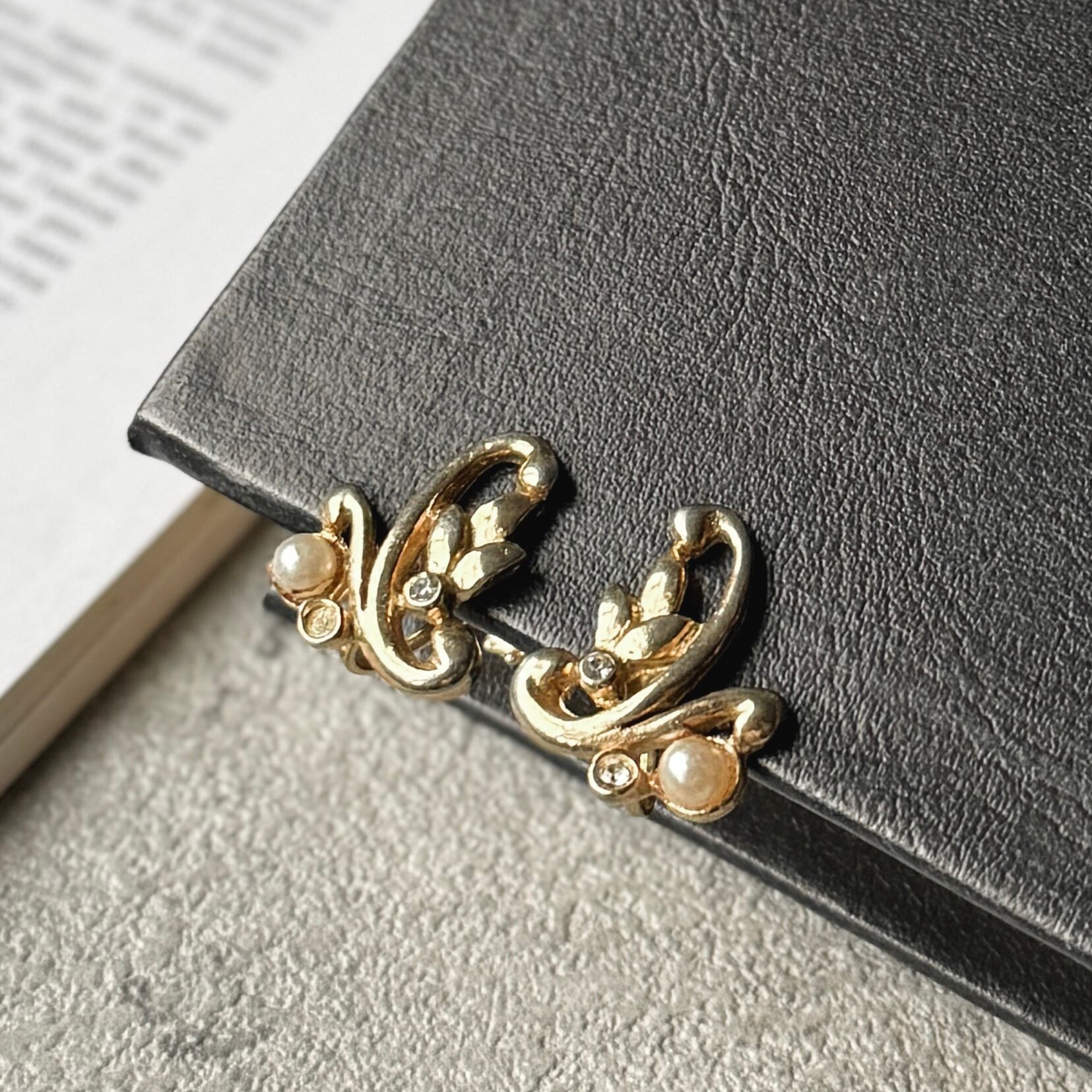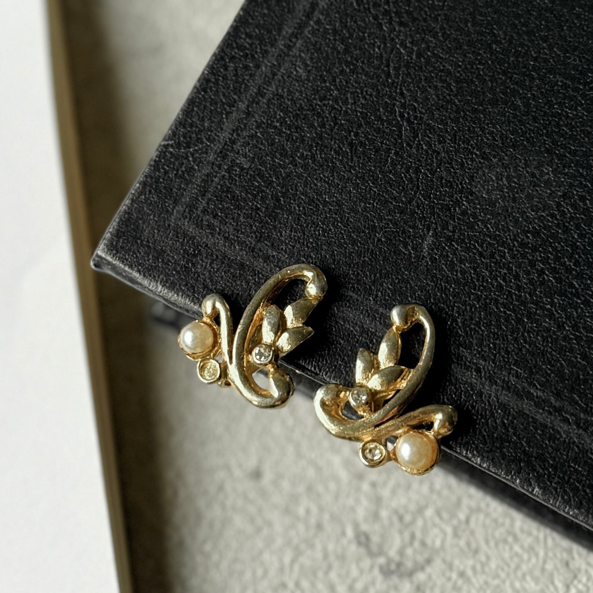 Y1230-ヴィンテージイヤリング U.S.A. 1950-60's Gold Tone Botanical Faux Pearl Rhinestones Earrings