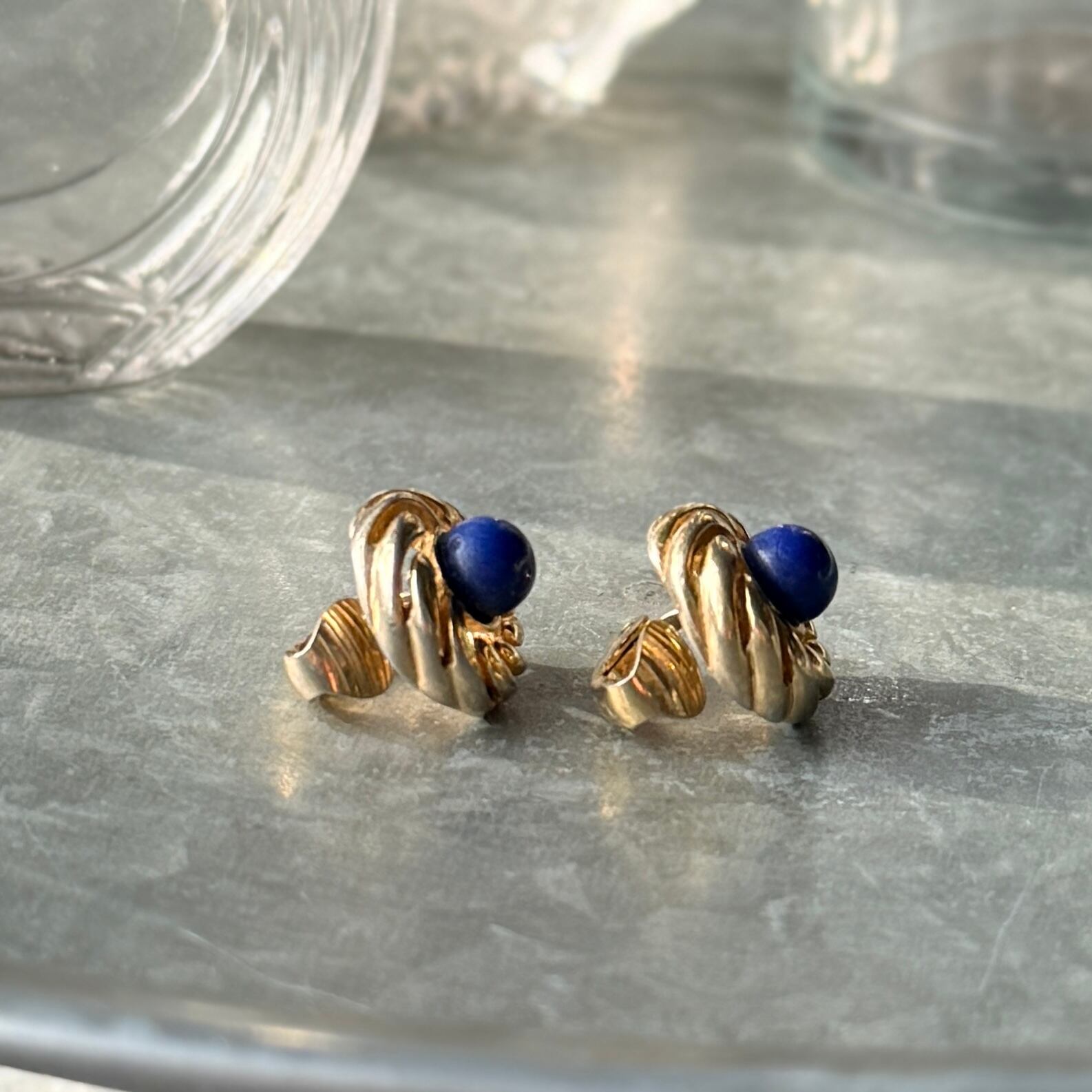 ラピスカラーカボションが印象的なゴールドトーンスワールイヤリング。