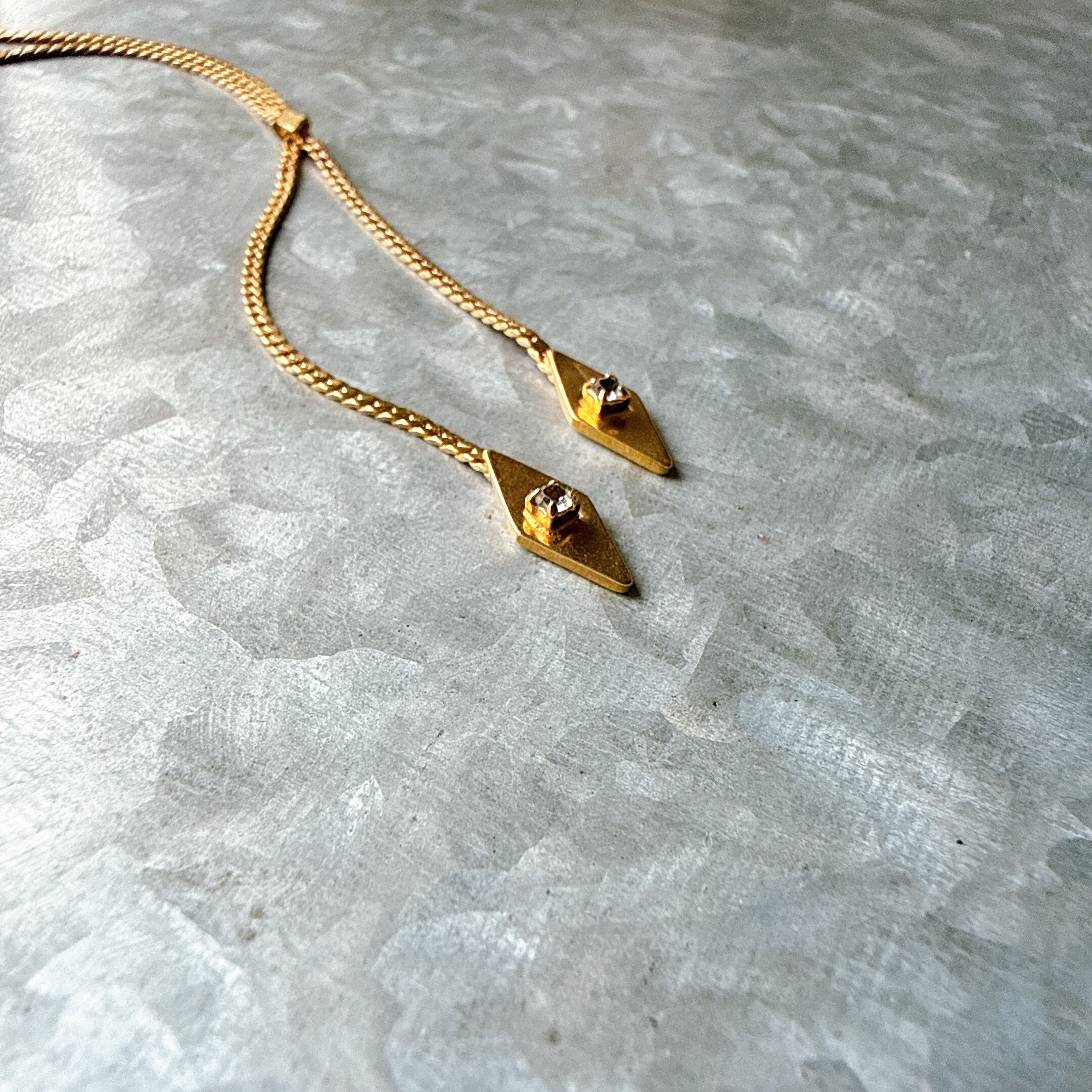 シャープな菱形のチャームに一粒のラインストーンが煌めく、モダンで知的なデザイン。
