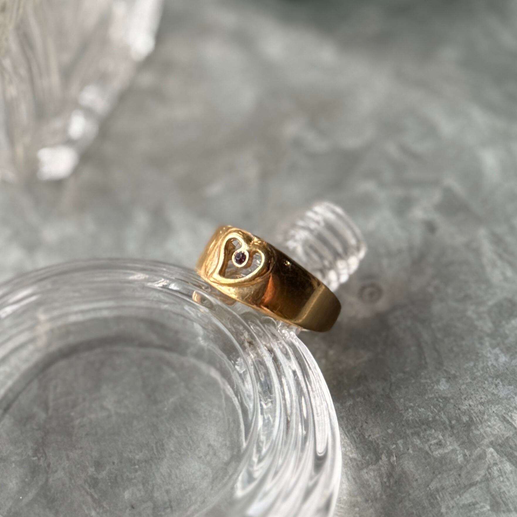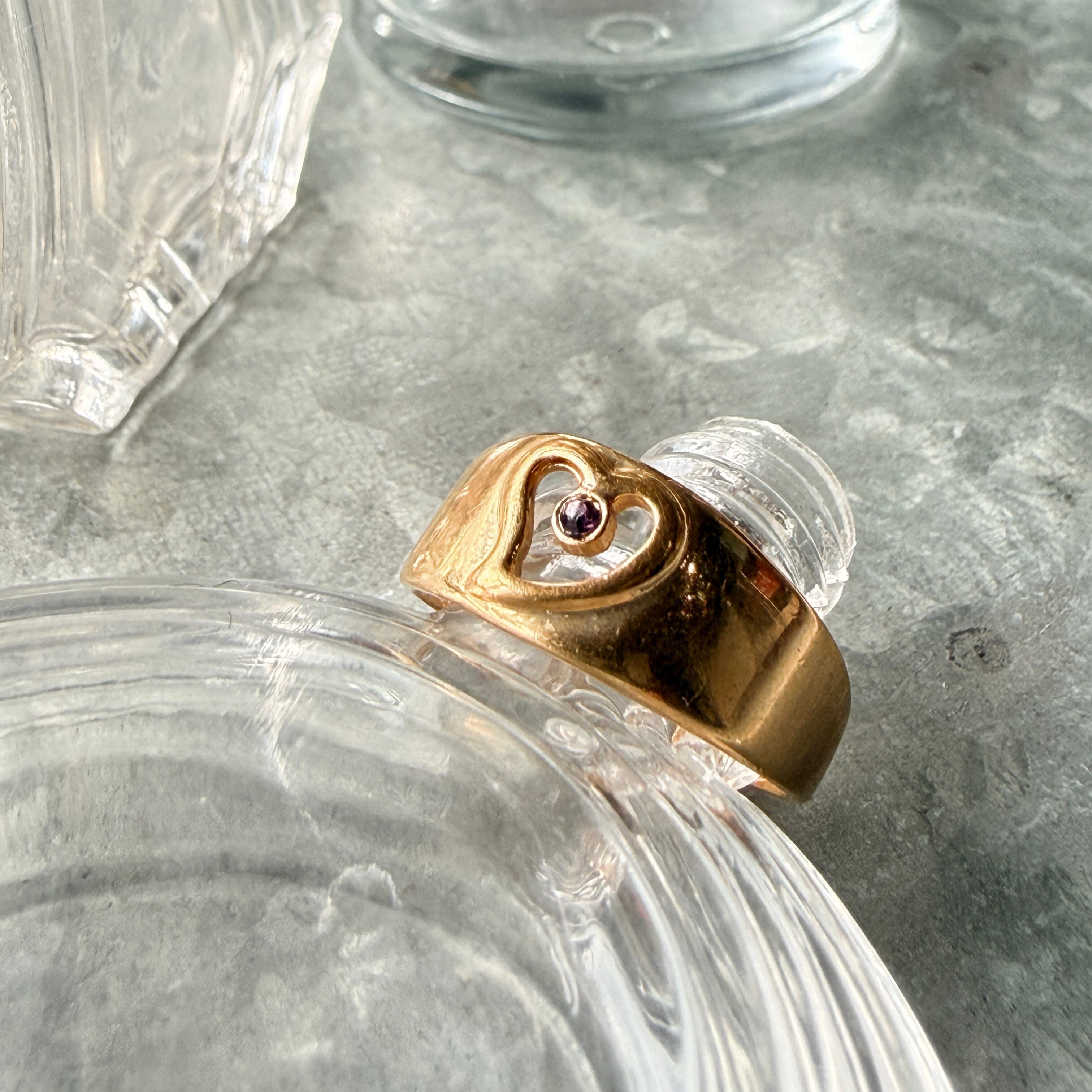 オープンハートと中央にルビーレッドのラインストーンが煌めくゴールドトーンリング。