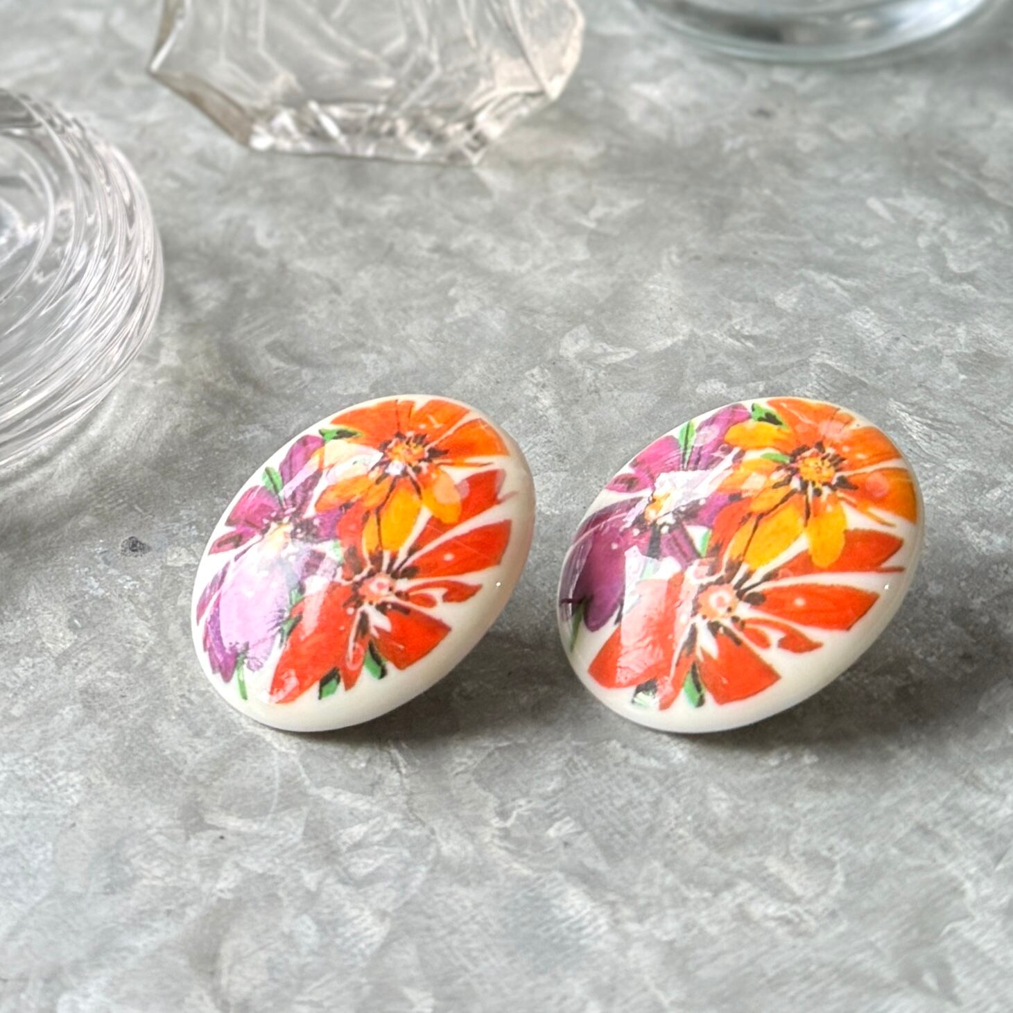 PA481-【 AVON 】エイボン・ヴィンテージピアス 1989 "Passion Flower" Acrylic Oval Floral Print Stud Earrings