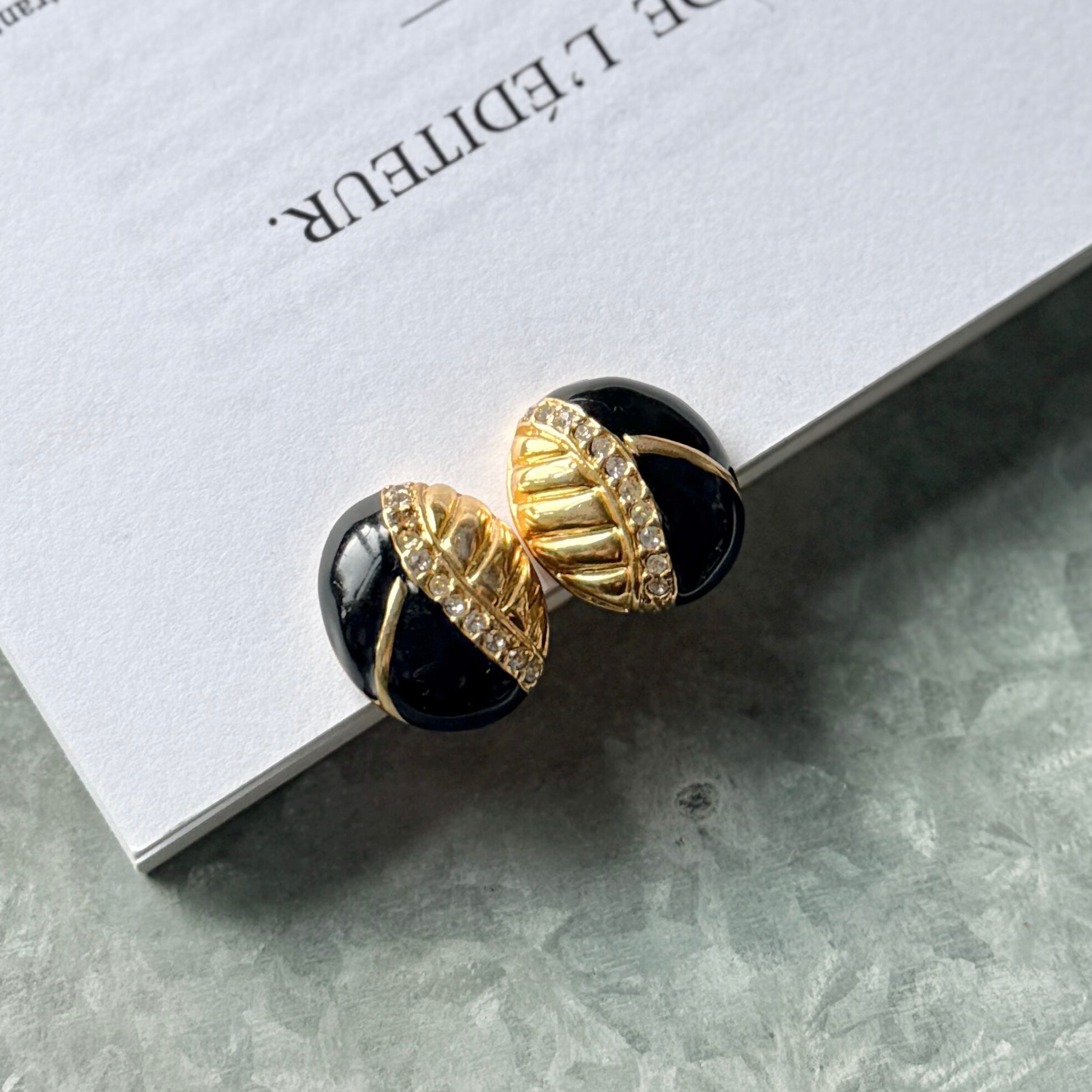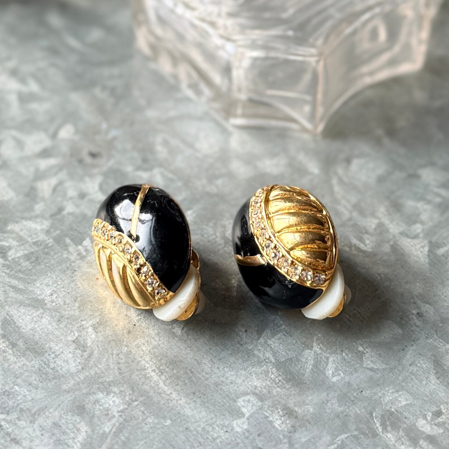 ゴールドトーンをベースに、ブラックエナメルペイント、ラインストーンが施されたオーバル型イヤリング。