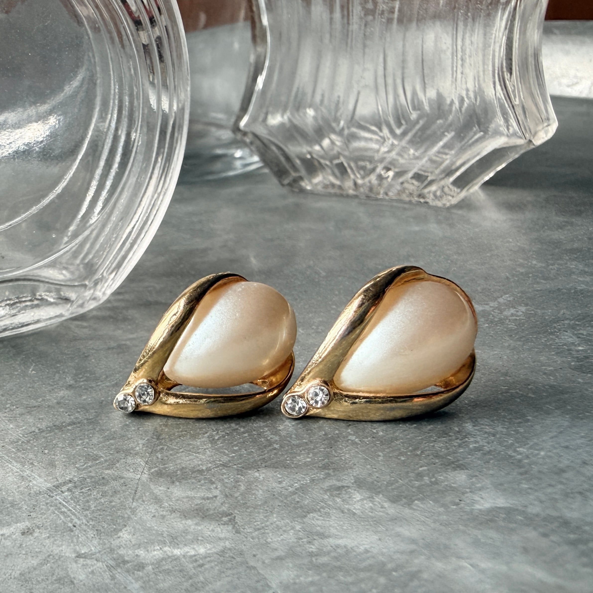 PA483-【 AVON 】エイボン・ヴィンテージピアス 1990's "Golden Pearlesque" Drop-Shaped Faux Pearl Rhinestone Stud Earrings